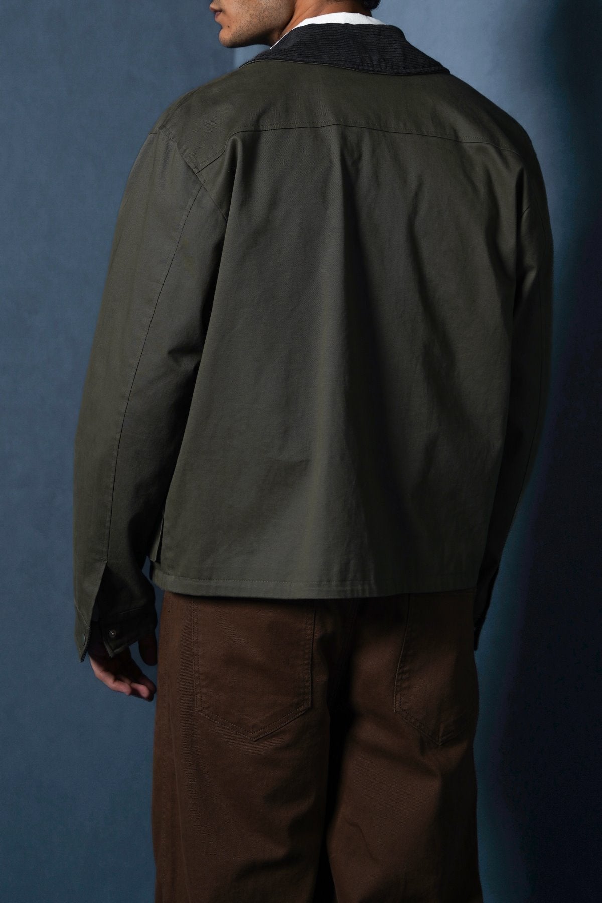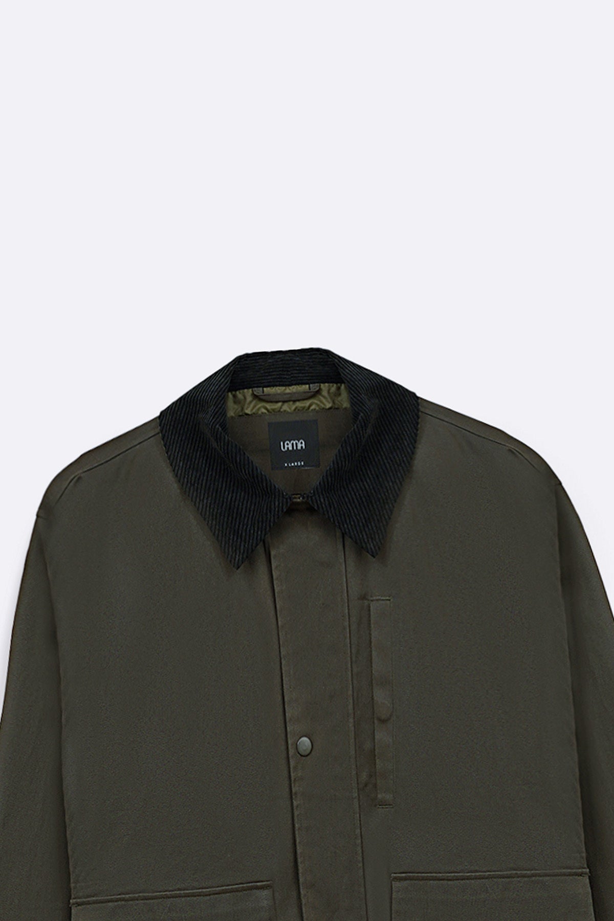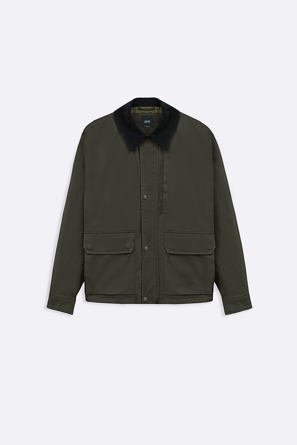 Design details: A relaxed utilitarian-style jacket with a contrast corduroy collar, patch pockets, flaps and a tailored chest pocket, front zipper and snap button closure.