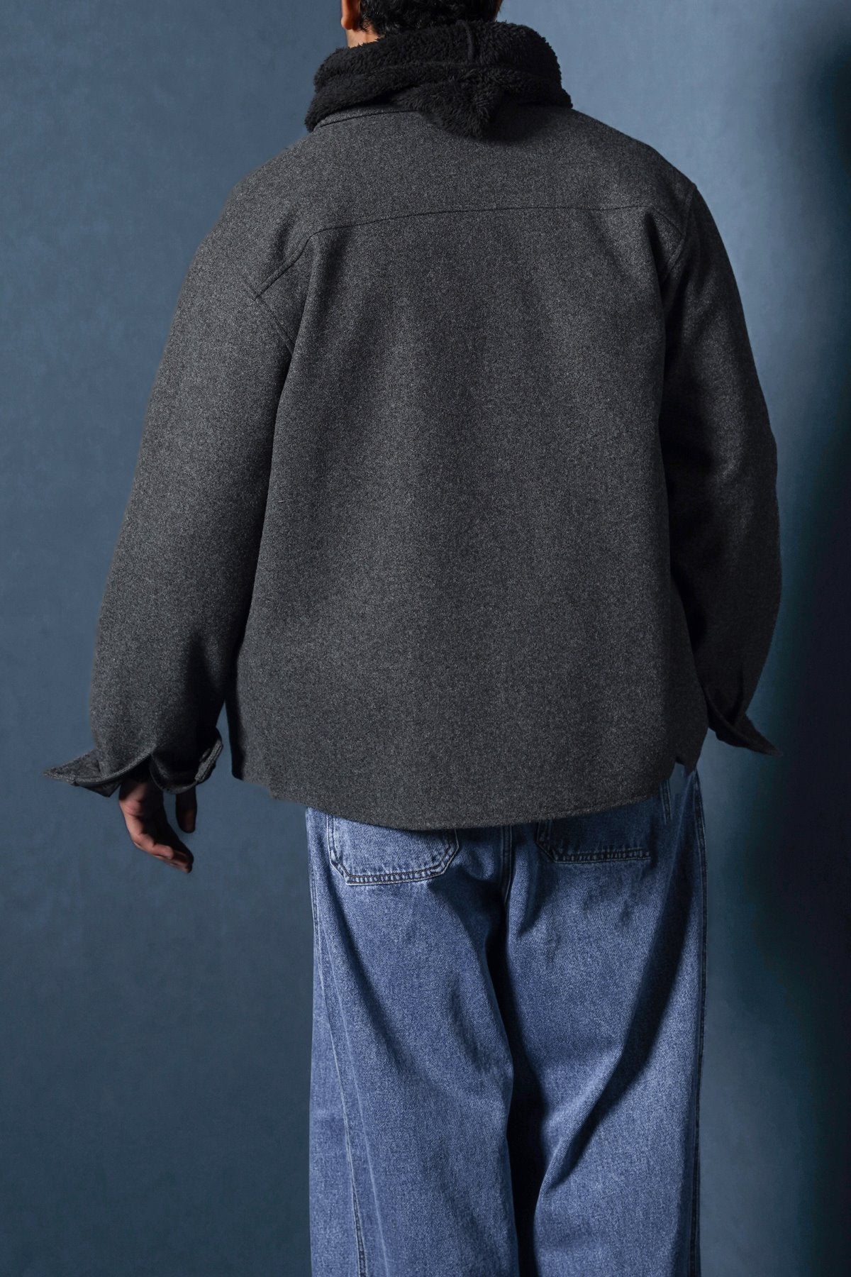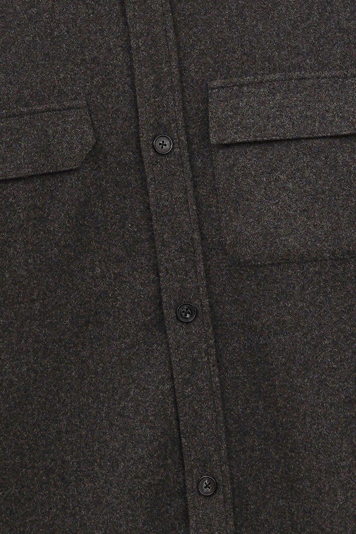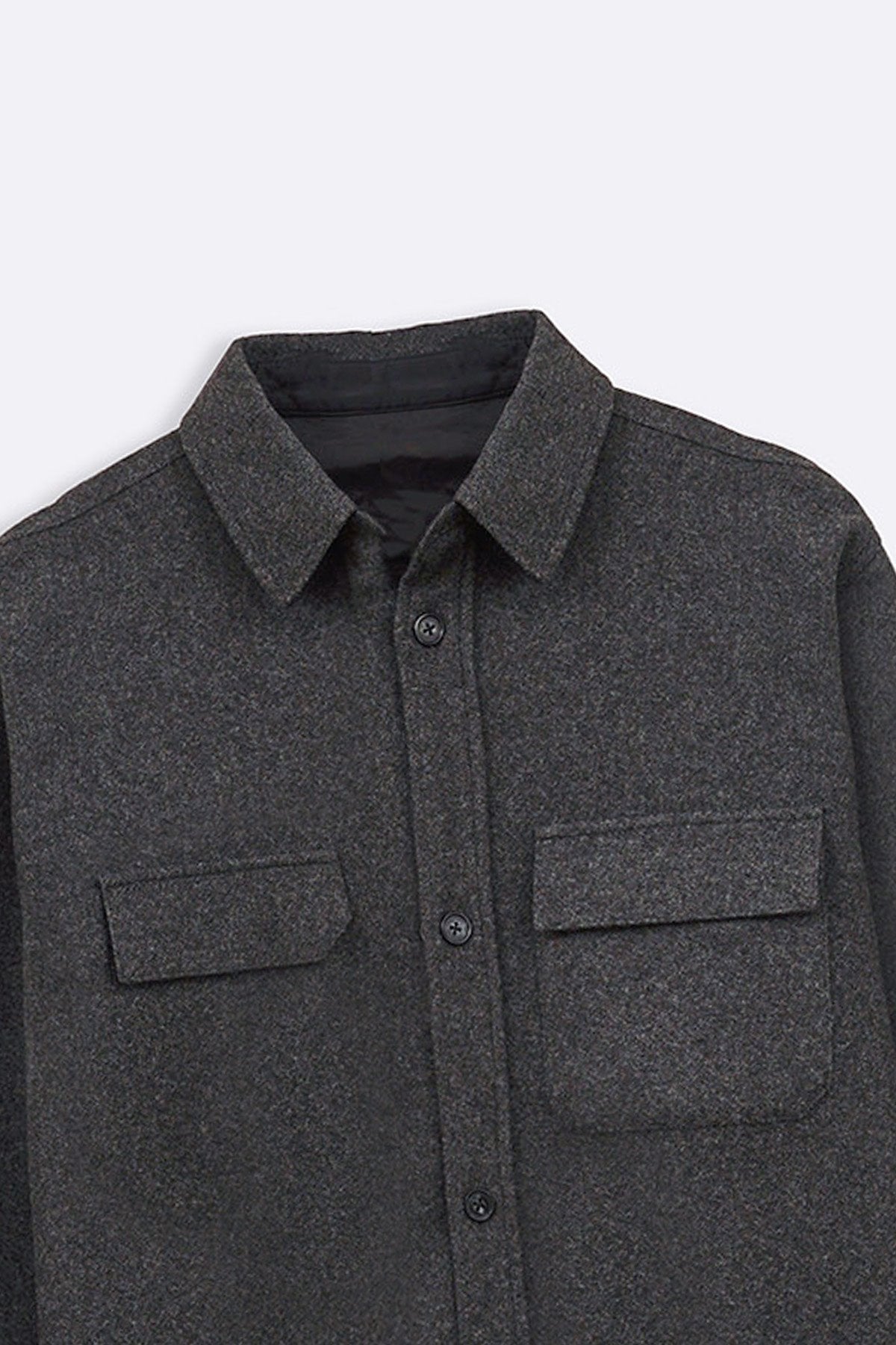 Design details: Relaxed woolen-textured shacket with a collar, cuffed sleeves, two flap patch pockets and a front button closure.