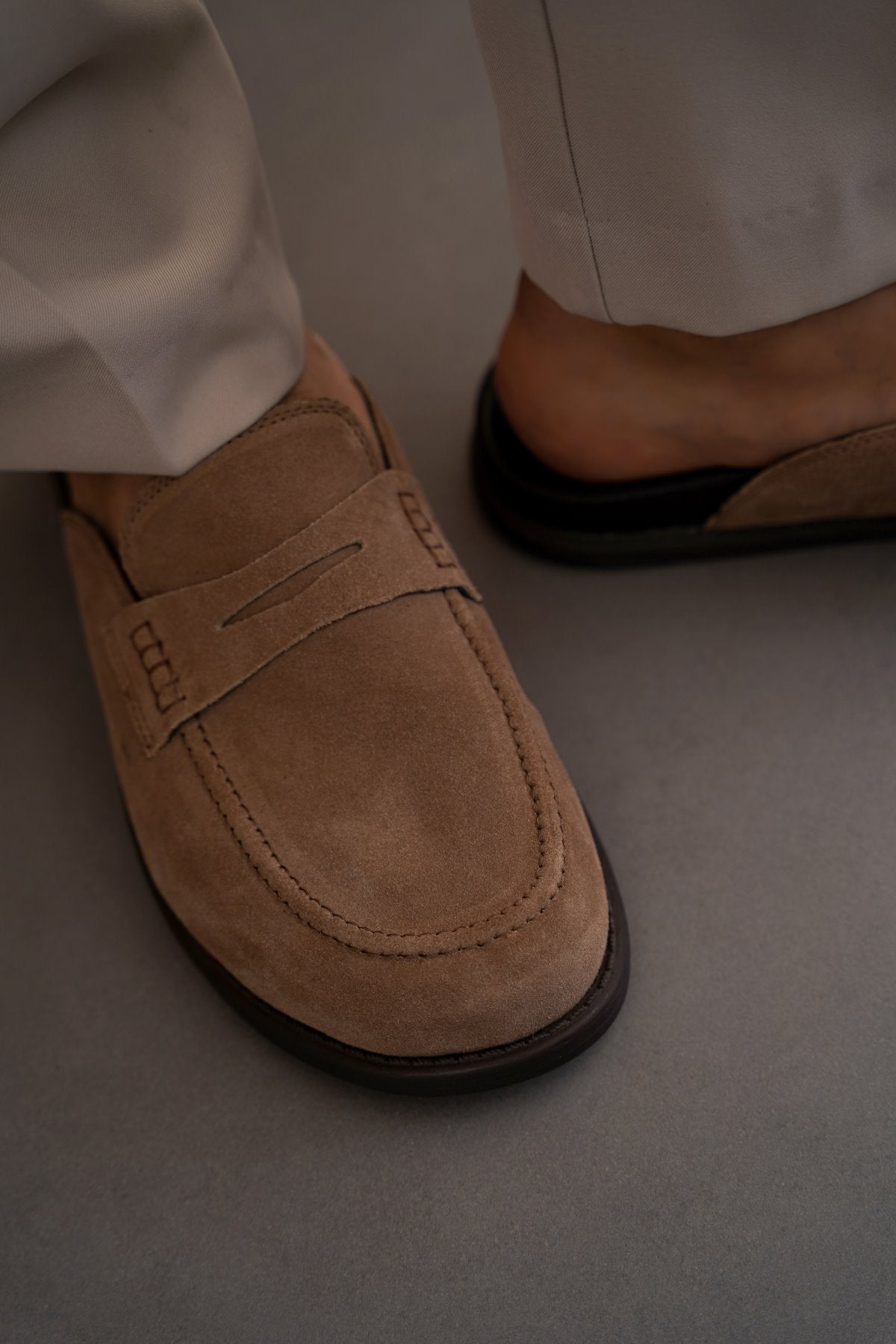 100% genuine suede leather slip-on mules with soft footbed, stitching details on upper and classic leather tie.