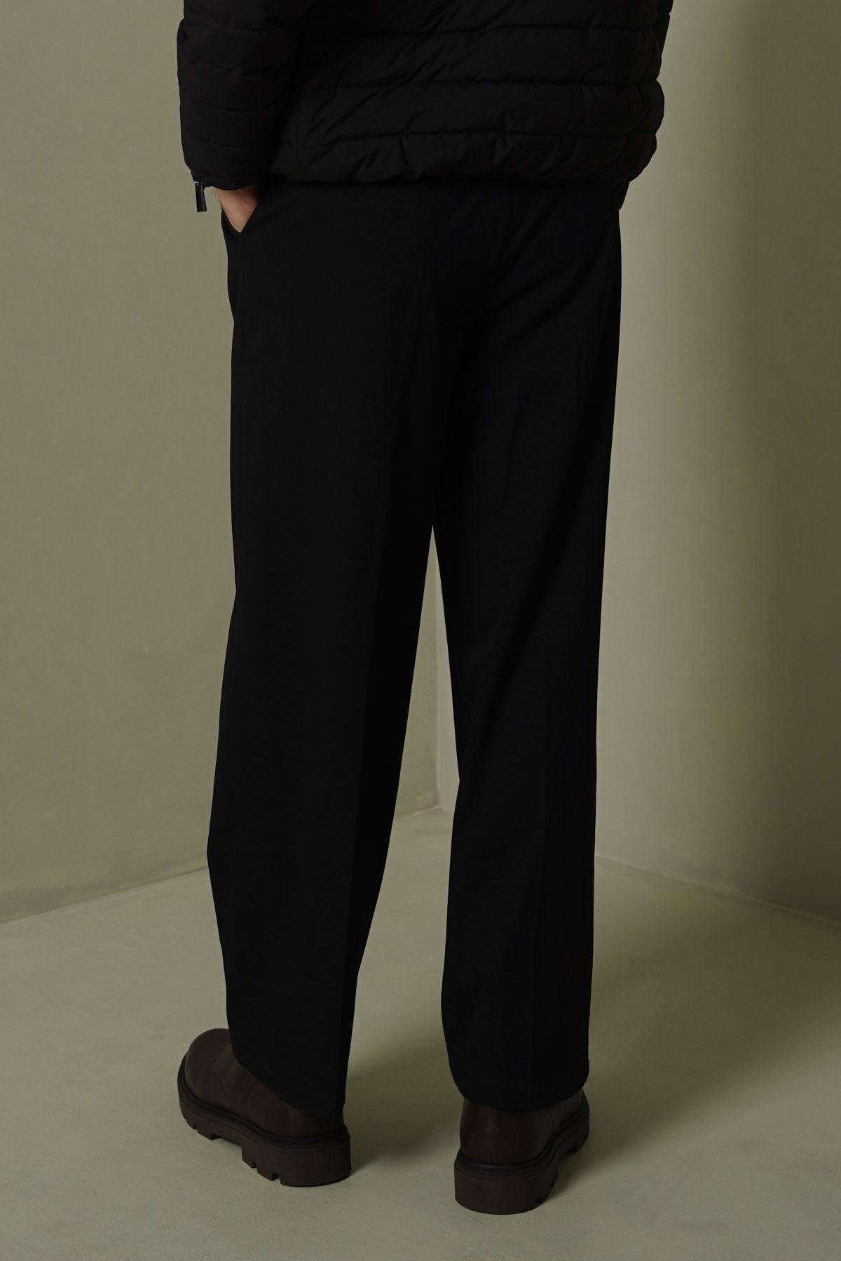 Design details: Double pleated pants with an elasticated waistband. Front cross pockets and back bone pockets.