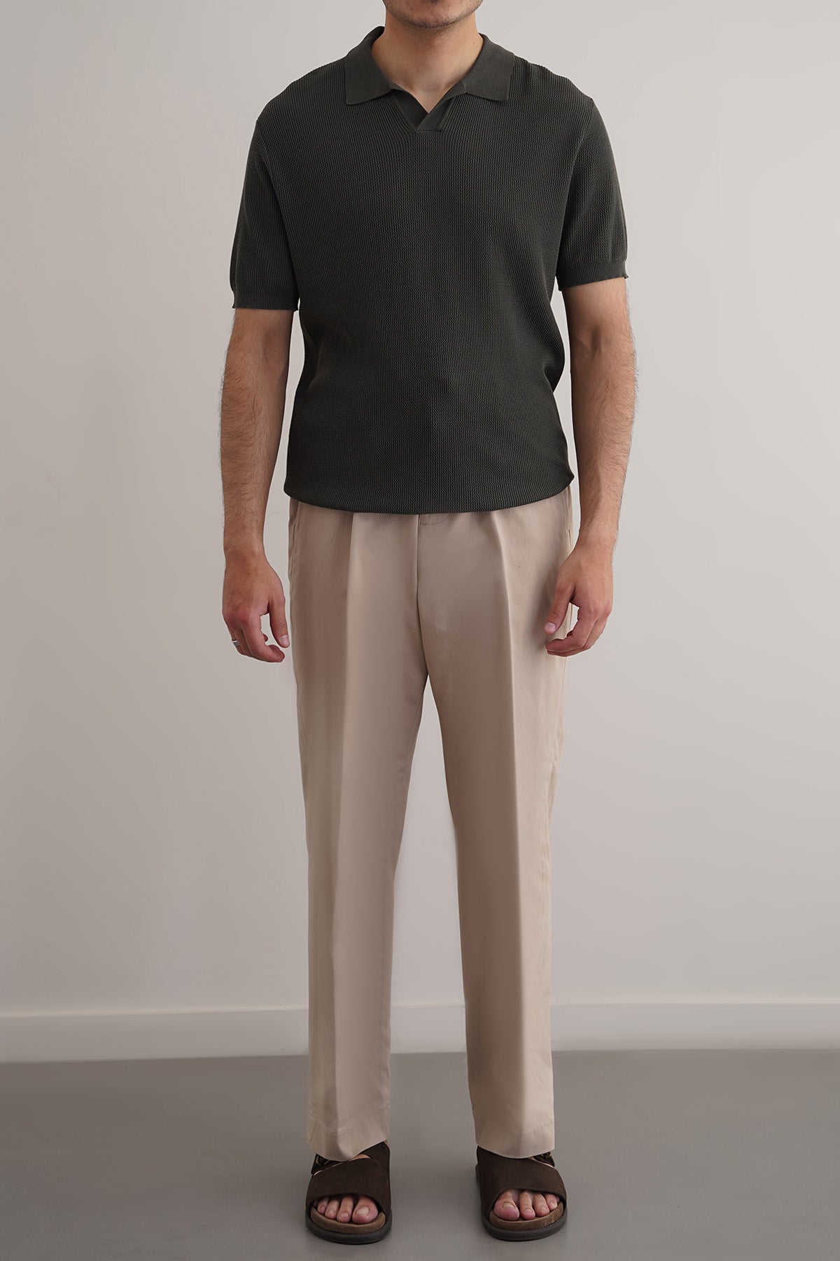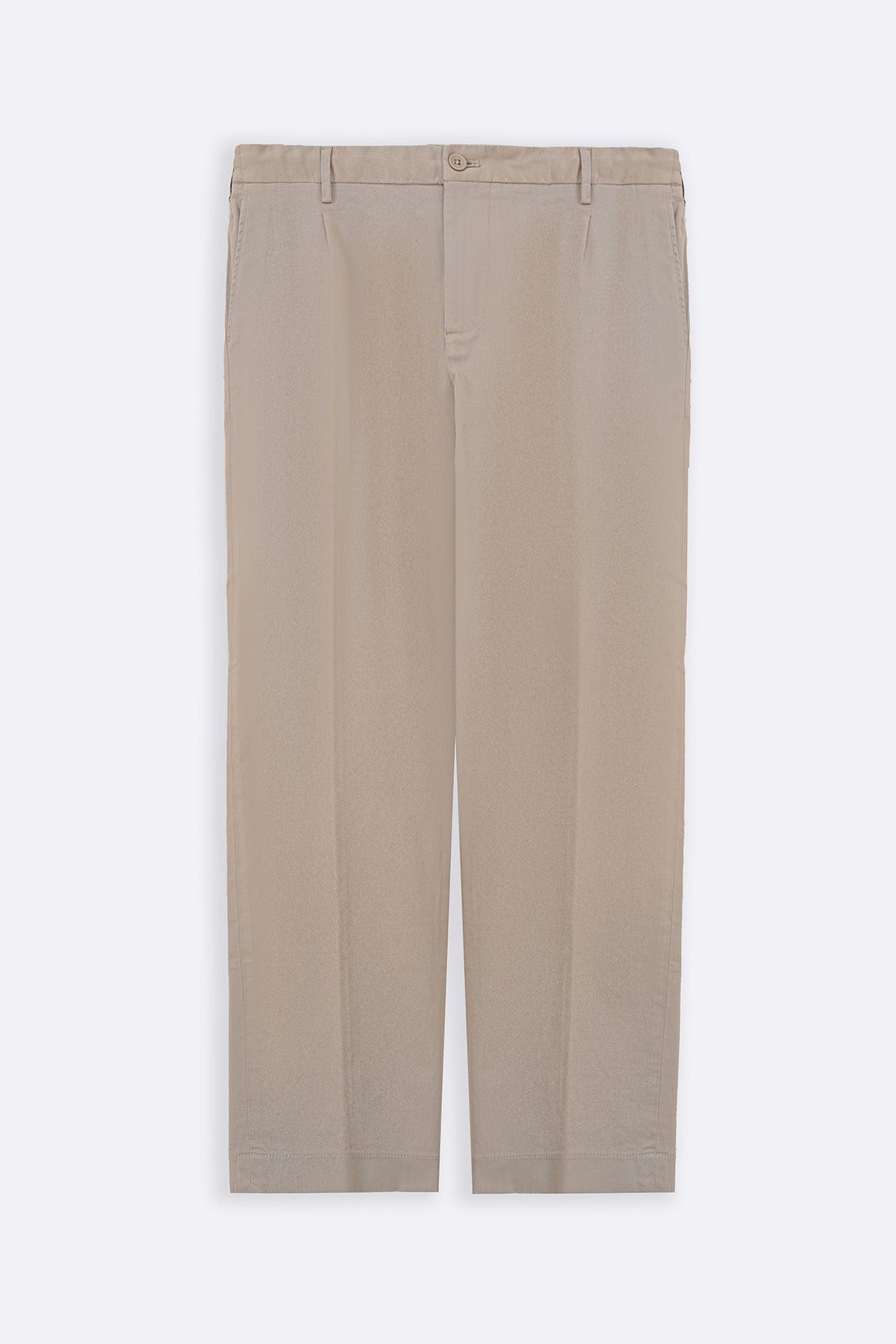 Design details: Pleated pants with an elasticated waist band and a drawstring. Cross pockets on the sides and welt pockets at the back.