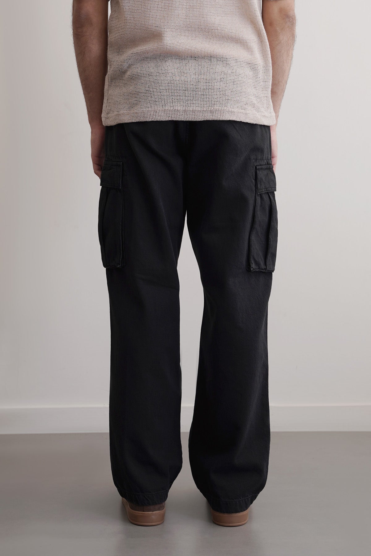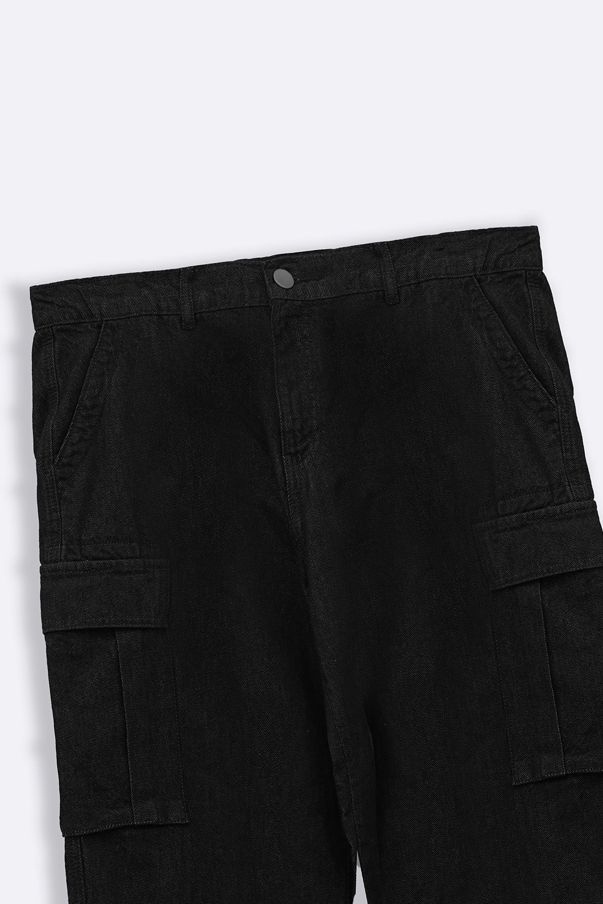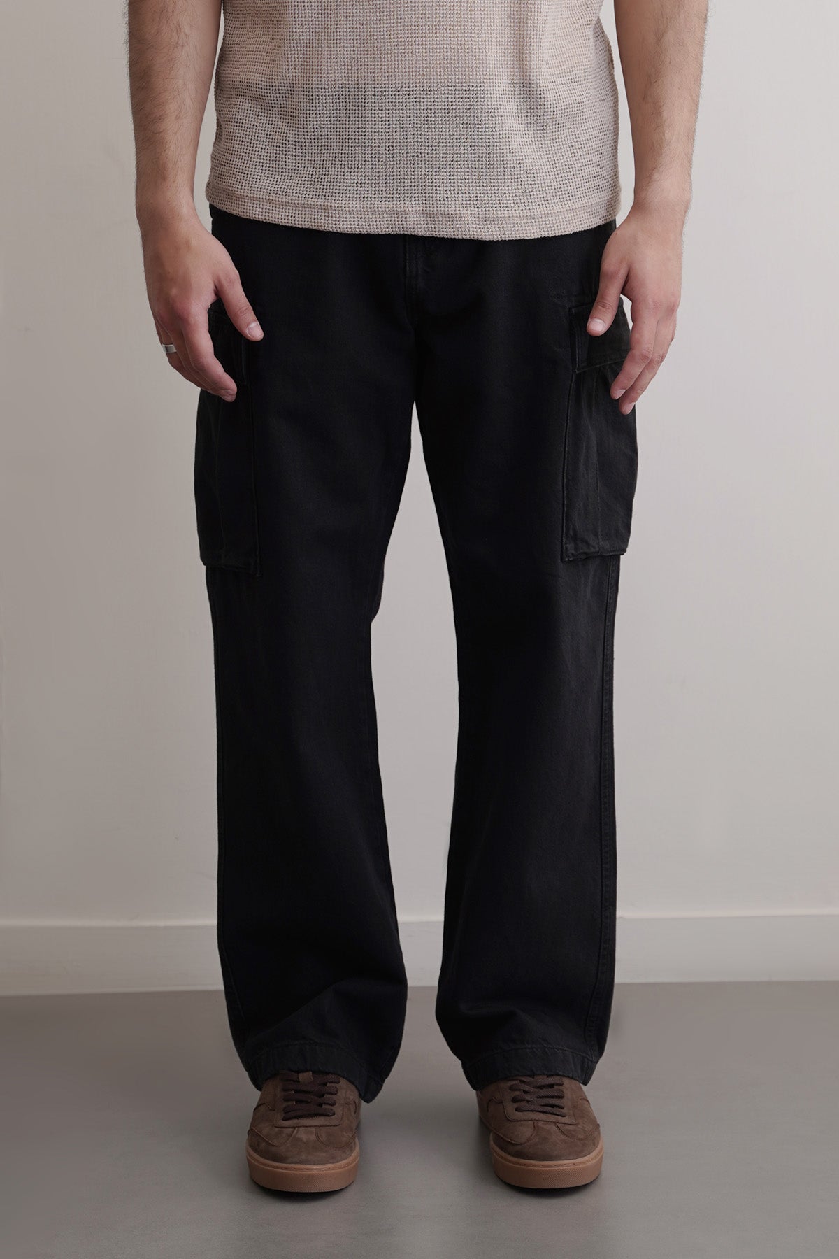 Design details: Relaxed cargo jeans with front cross pockets, pouch pockets on the sides and back bone pockets.
