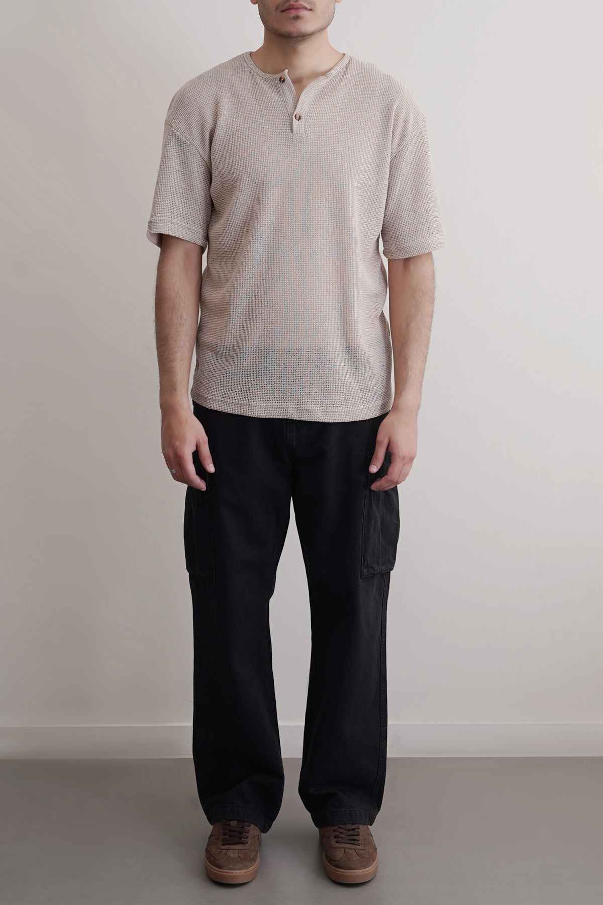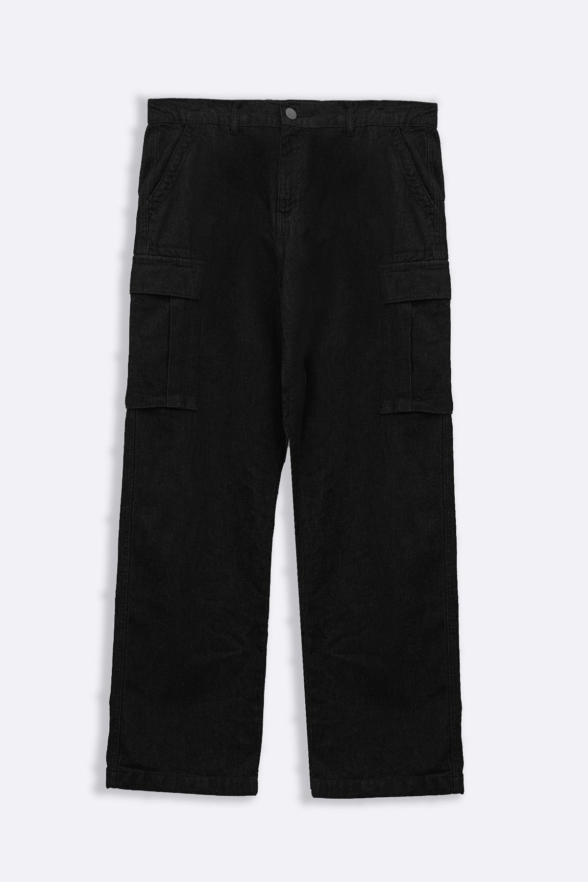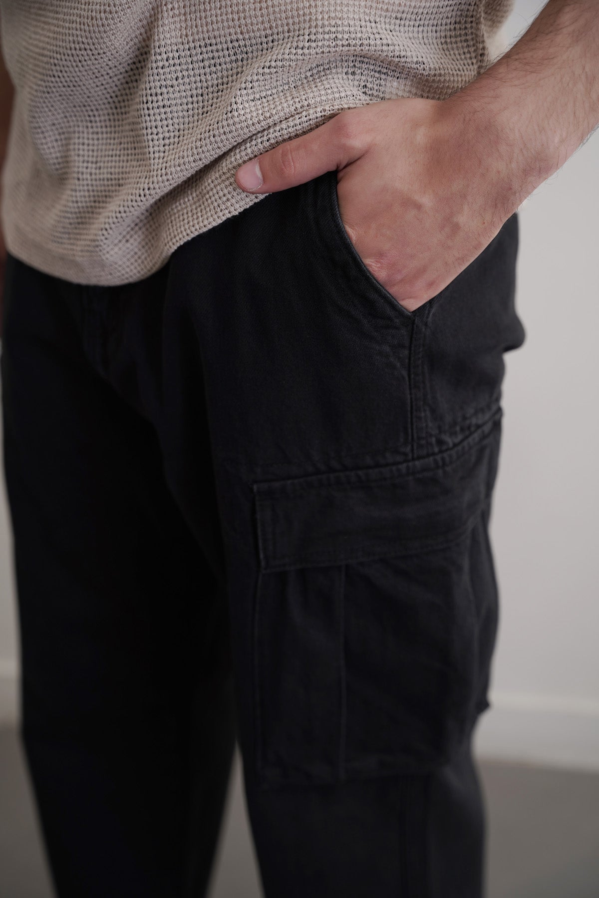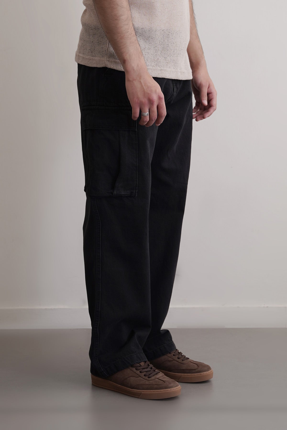 Design details: Relaxed cargo jeans with front cross pockets, pouch pockets on the sides and back bone pockets.
