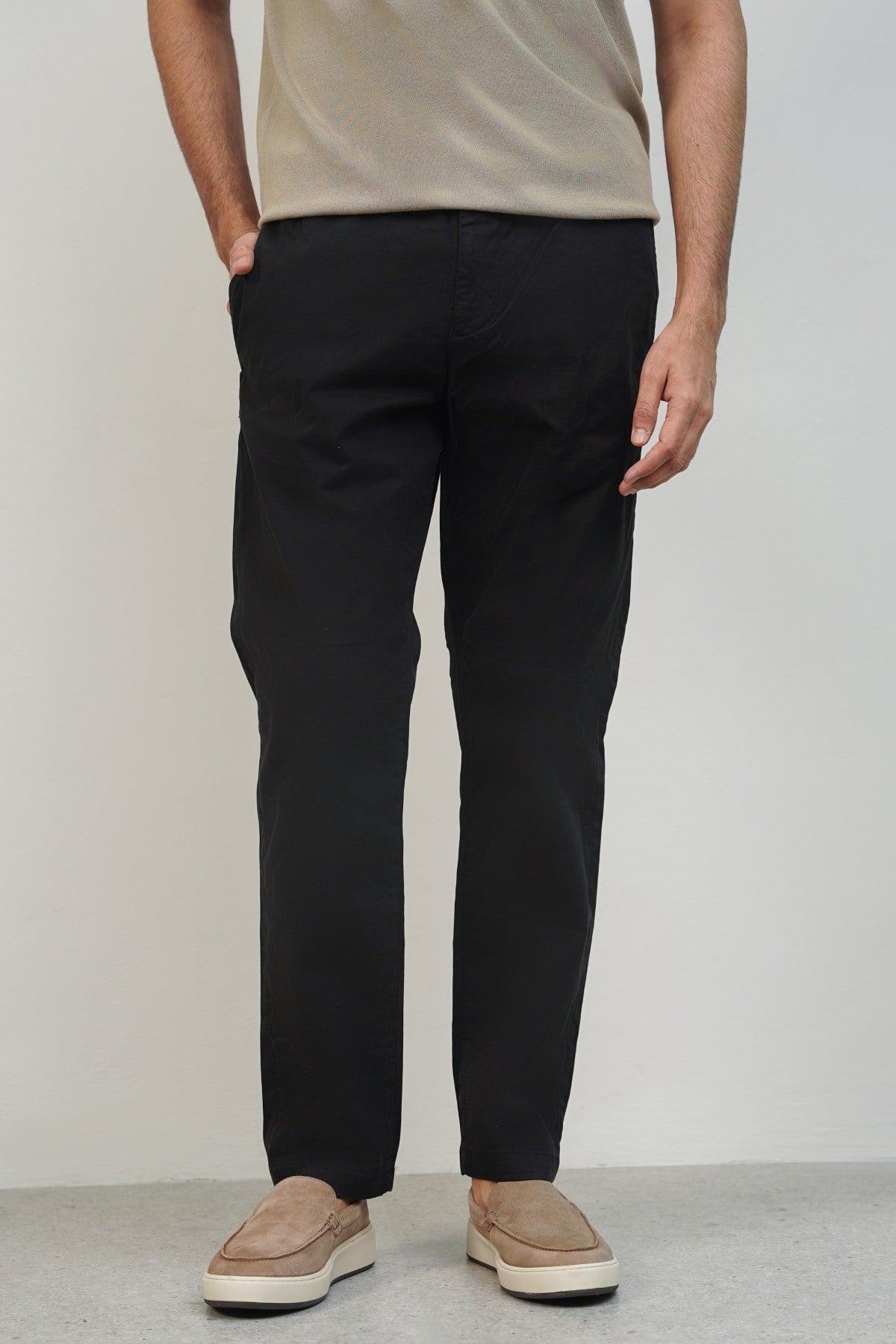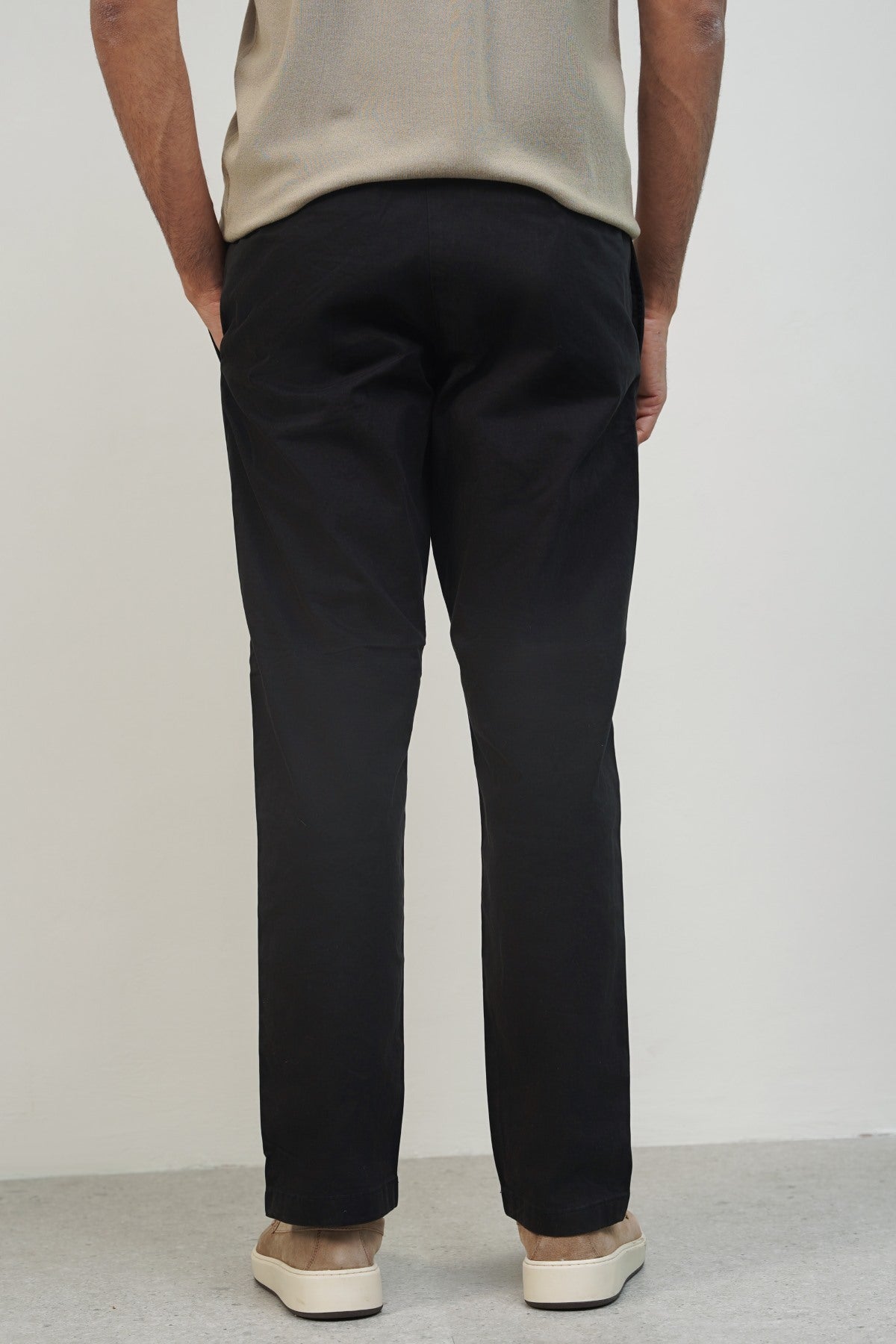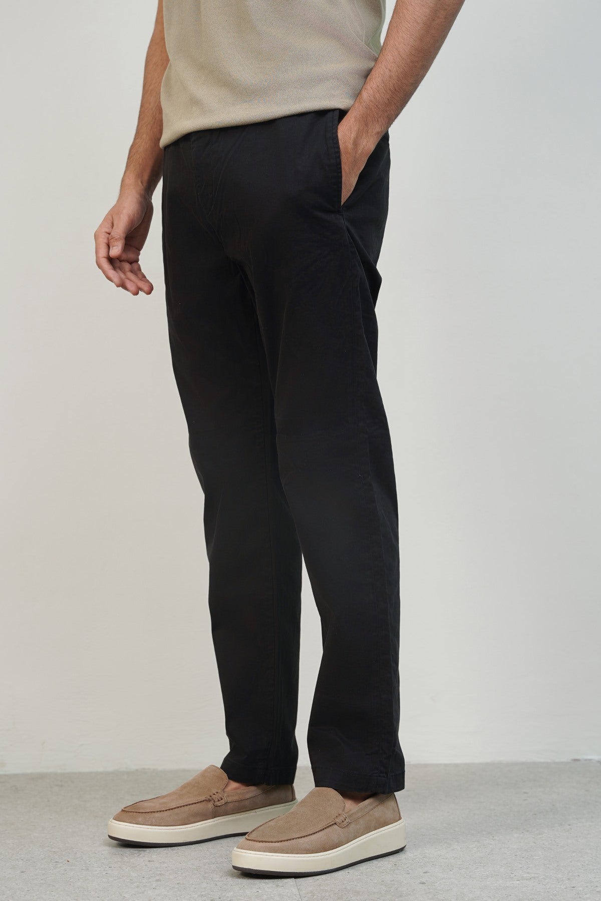 Design Details: Slim straight pants with elasticated waist band and drawstring at waist. There are front side pockets and back bone pockets and zipper fly closure.