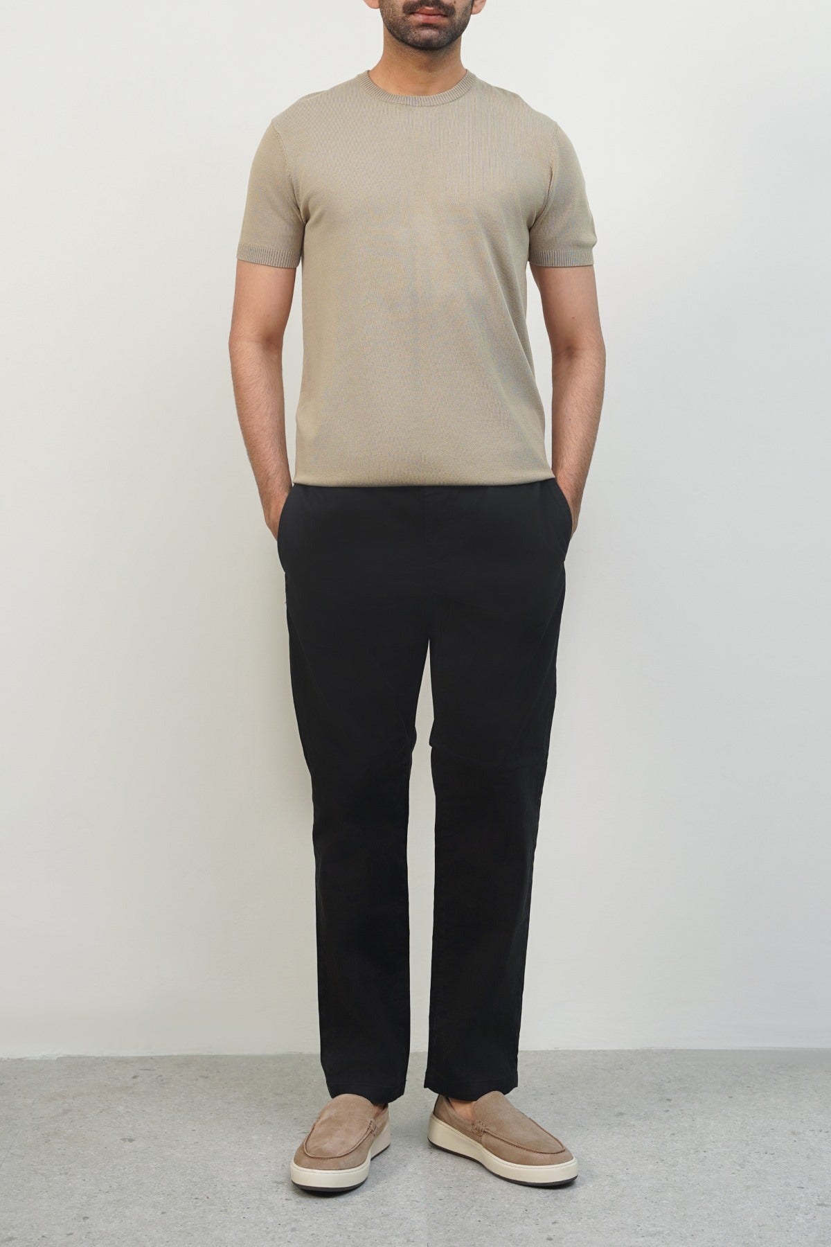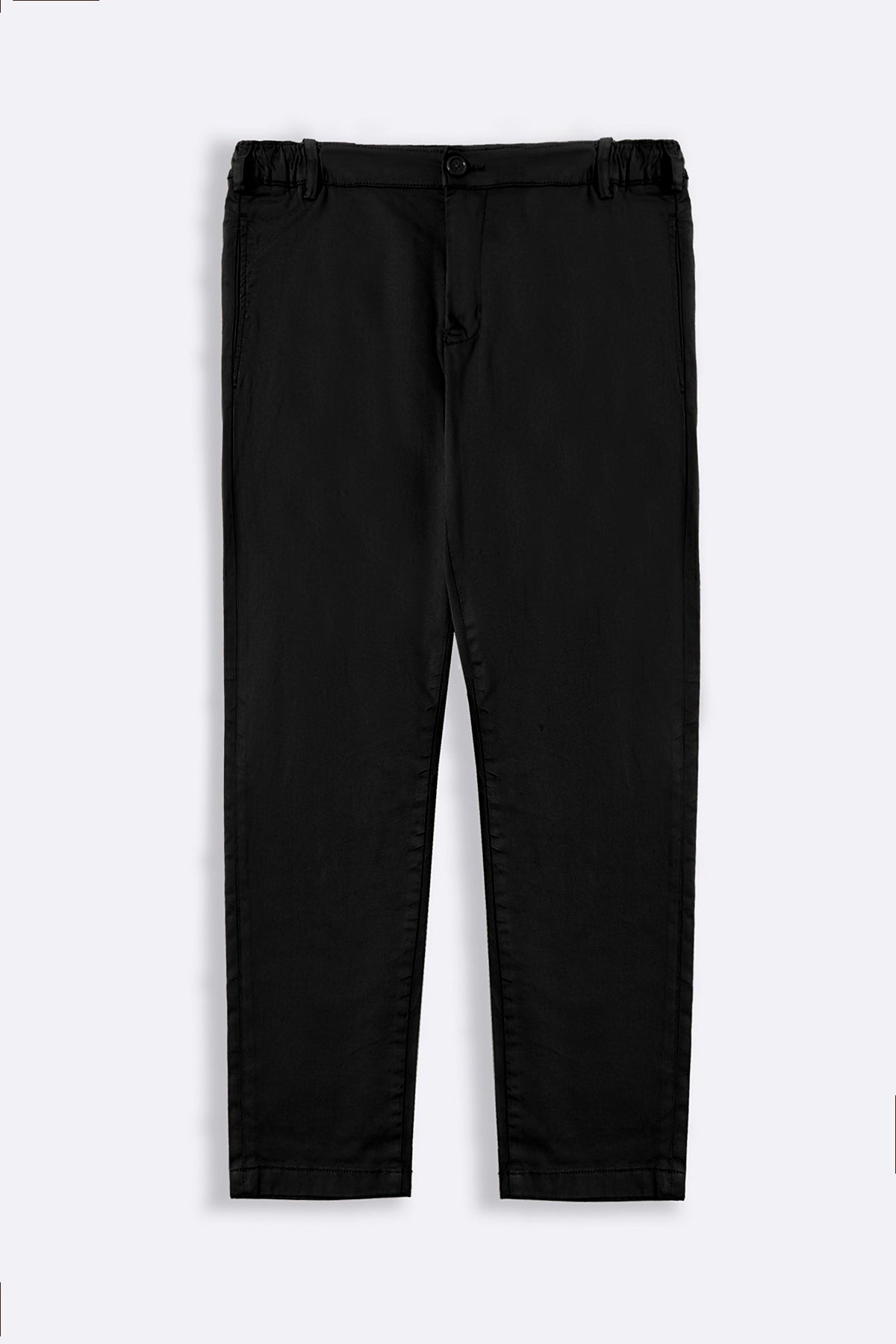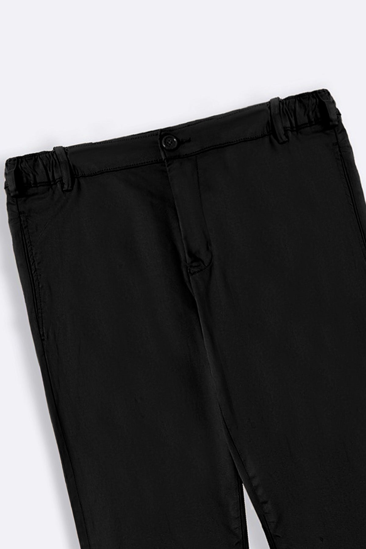 Design Details: Slim straight pants with elasticated waist band and drawstring at waist. There are front side pockets and back bone pockets and zipper fly closure.