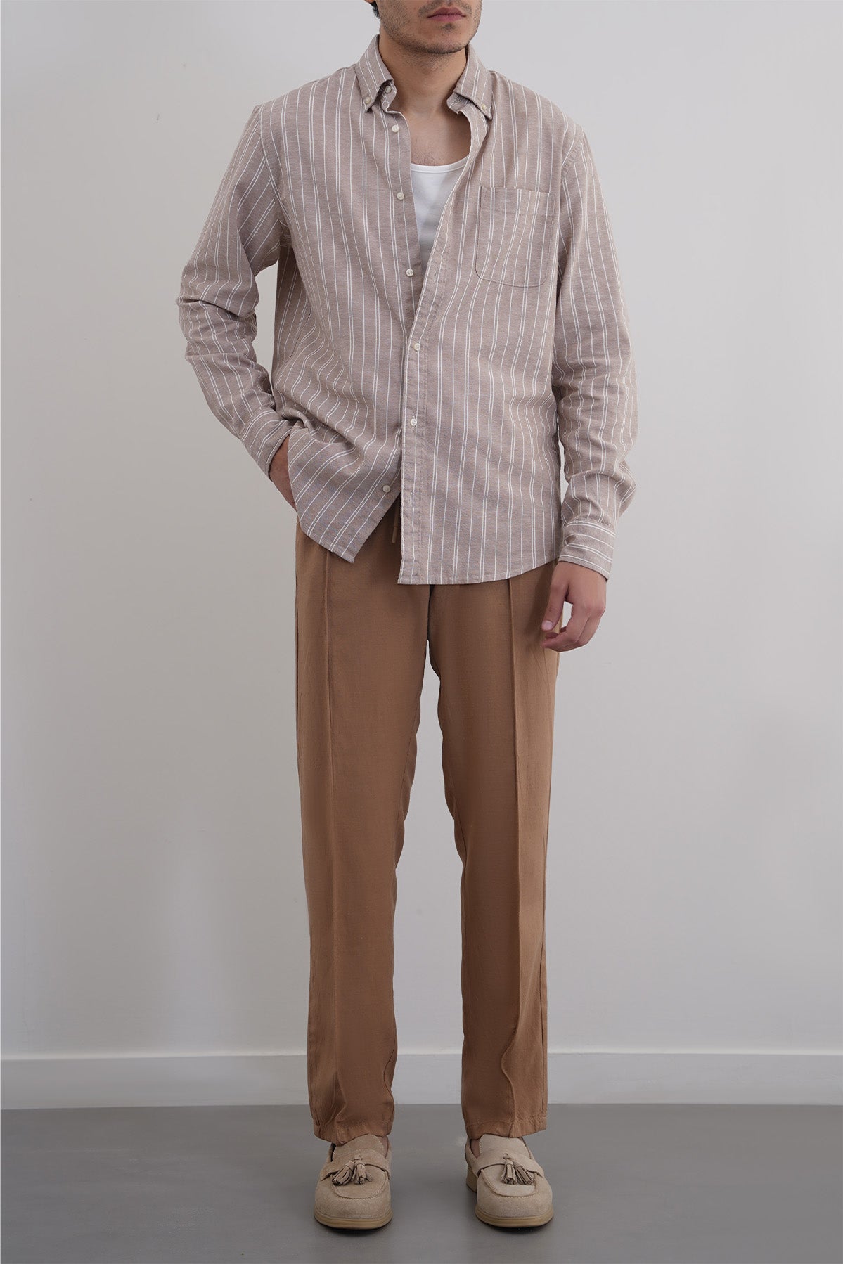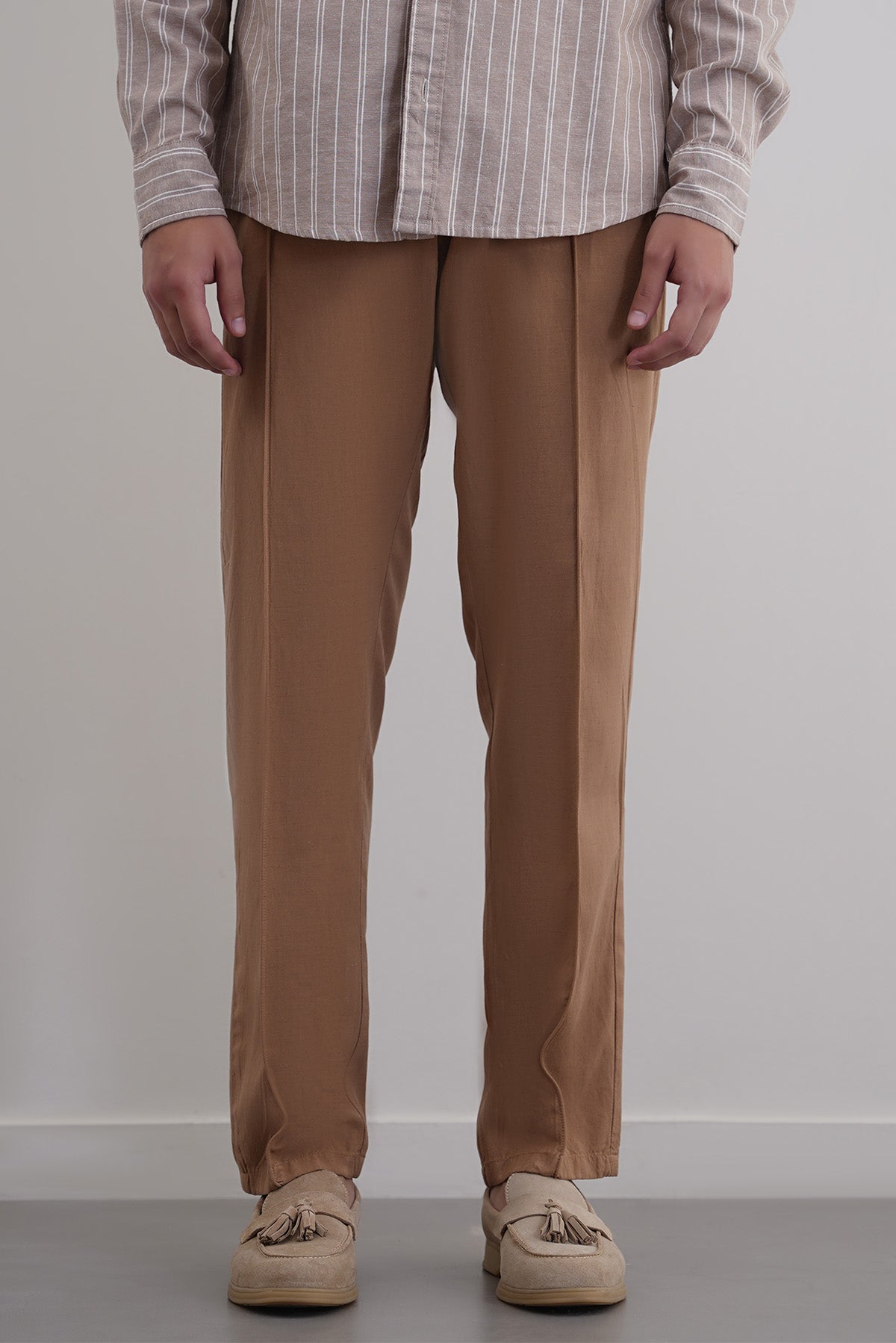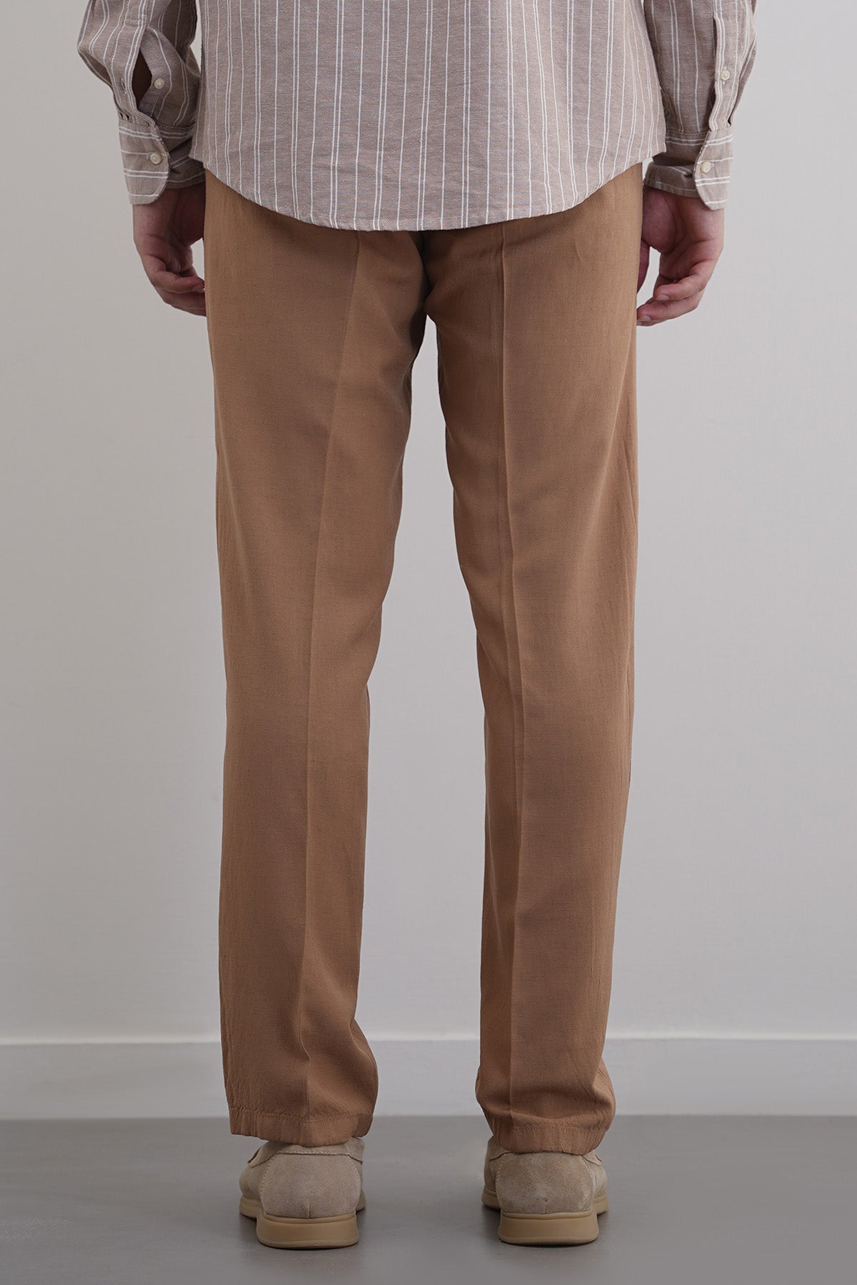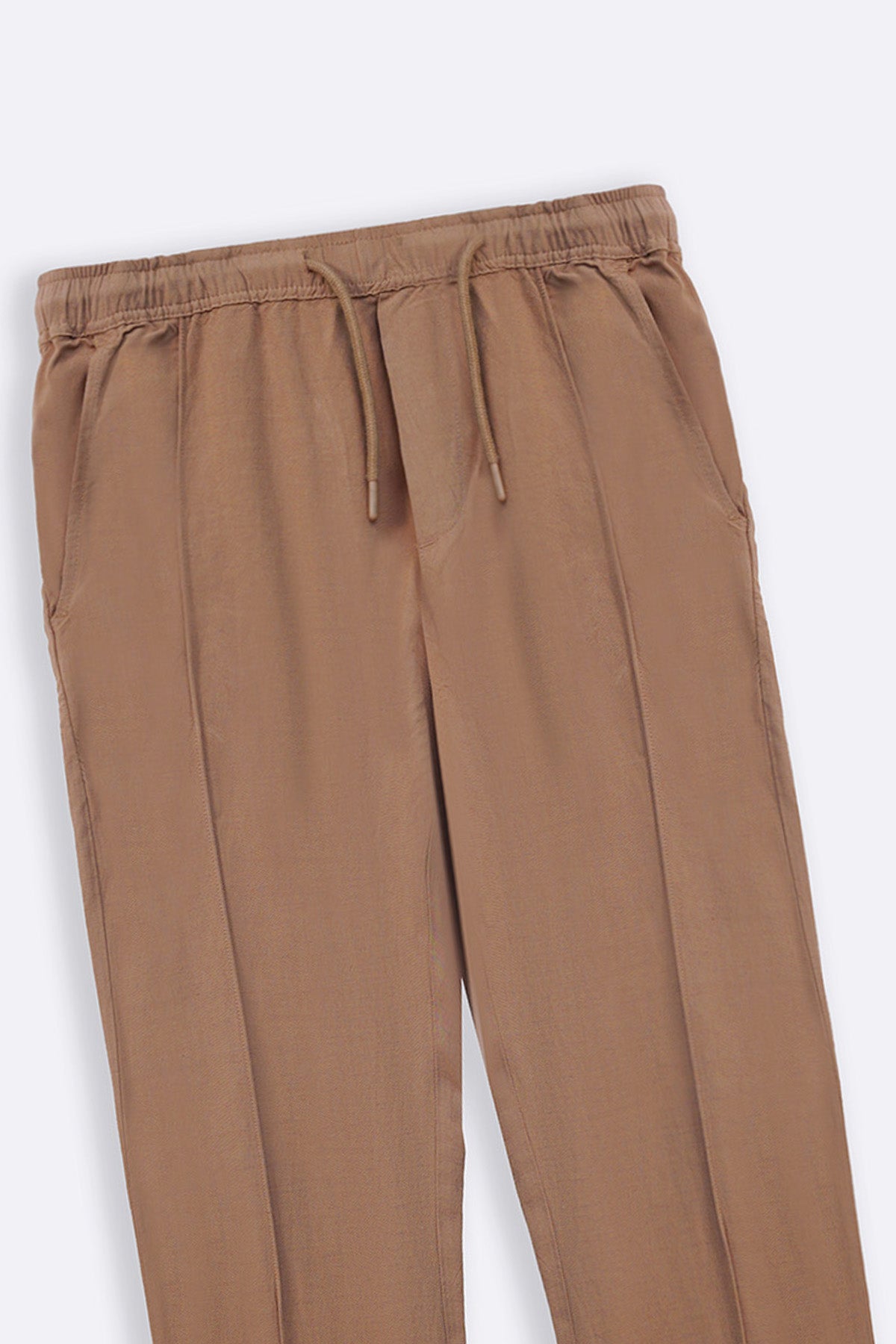 Design details: Tapered pants with an elasticated waist band and drawcord. Front tuck pleats, cross pockets and a single bone pocket at the back.