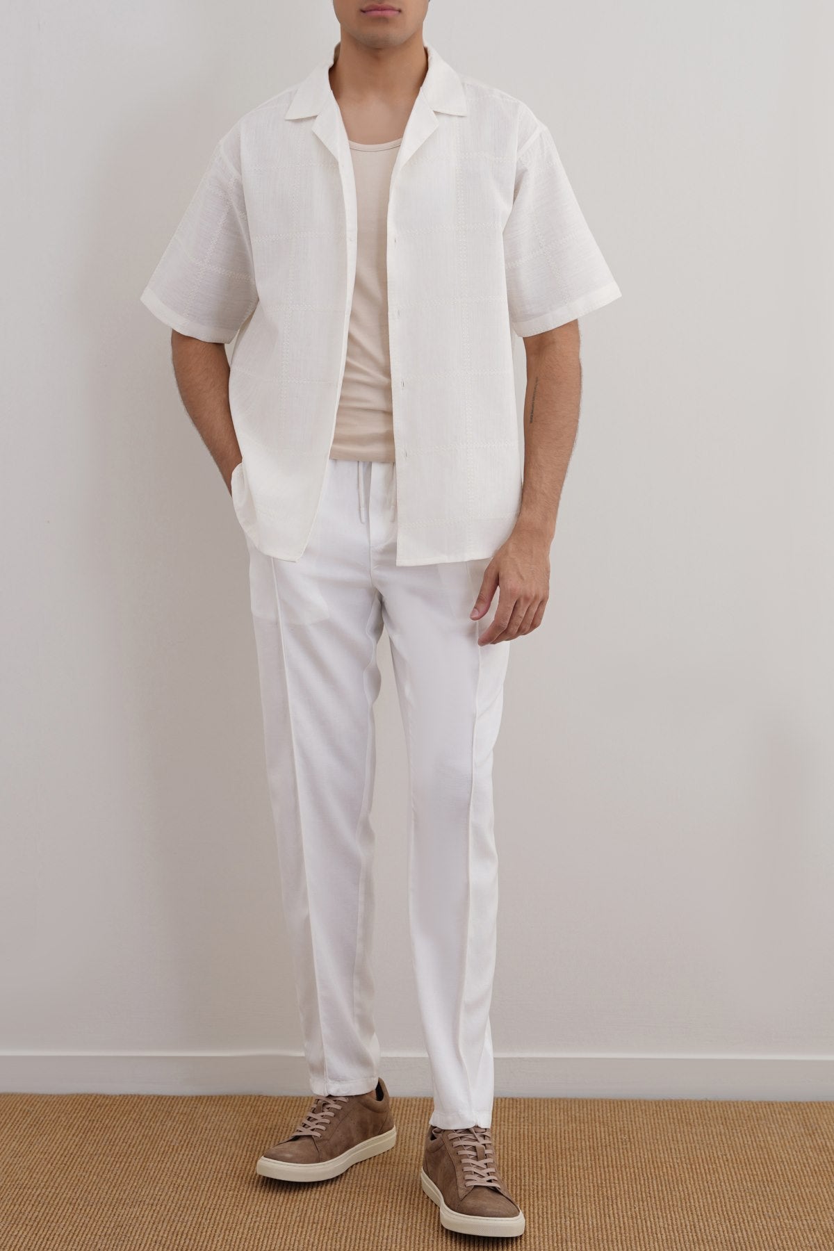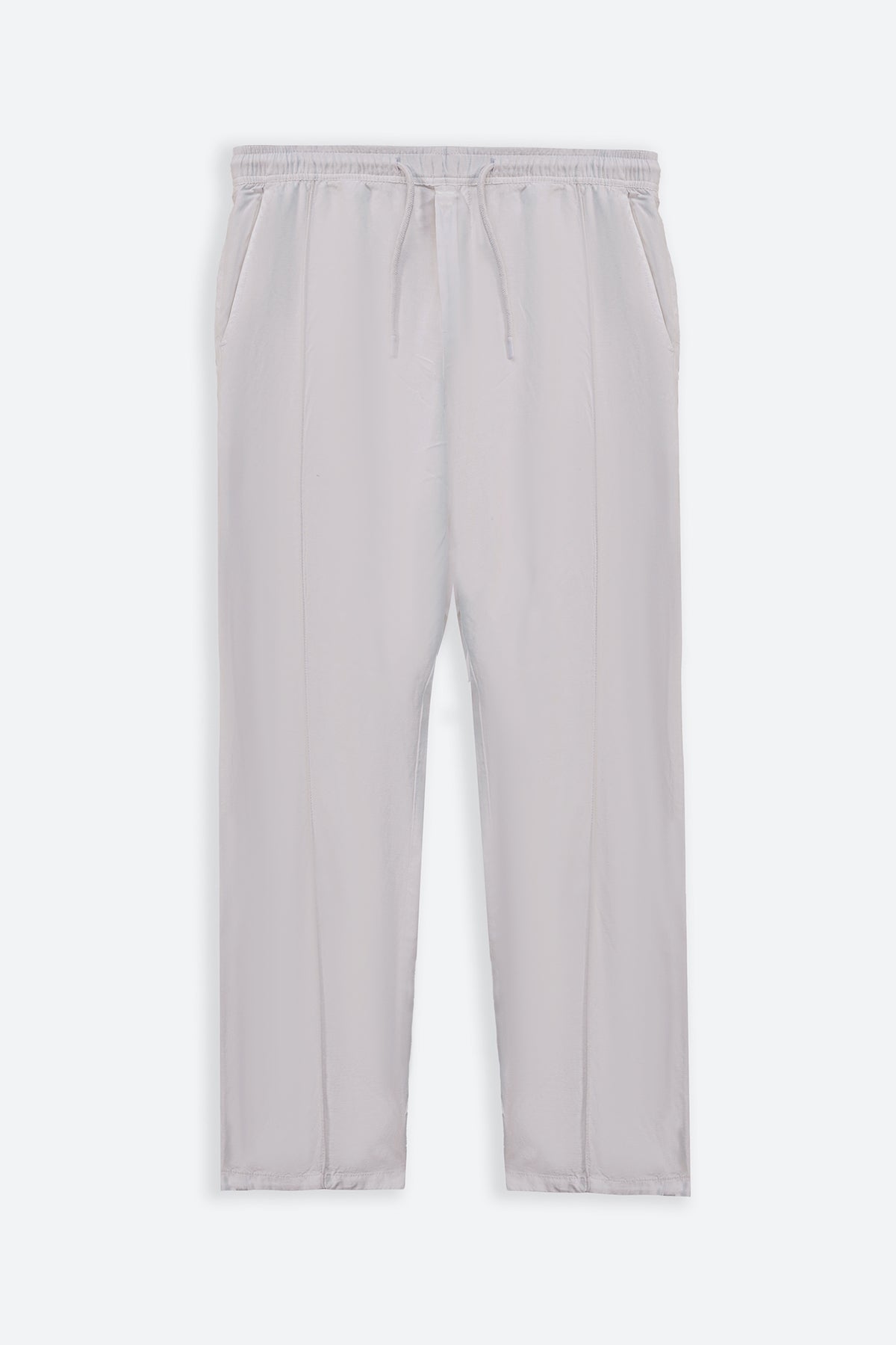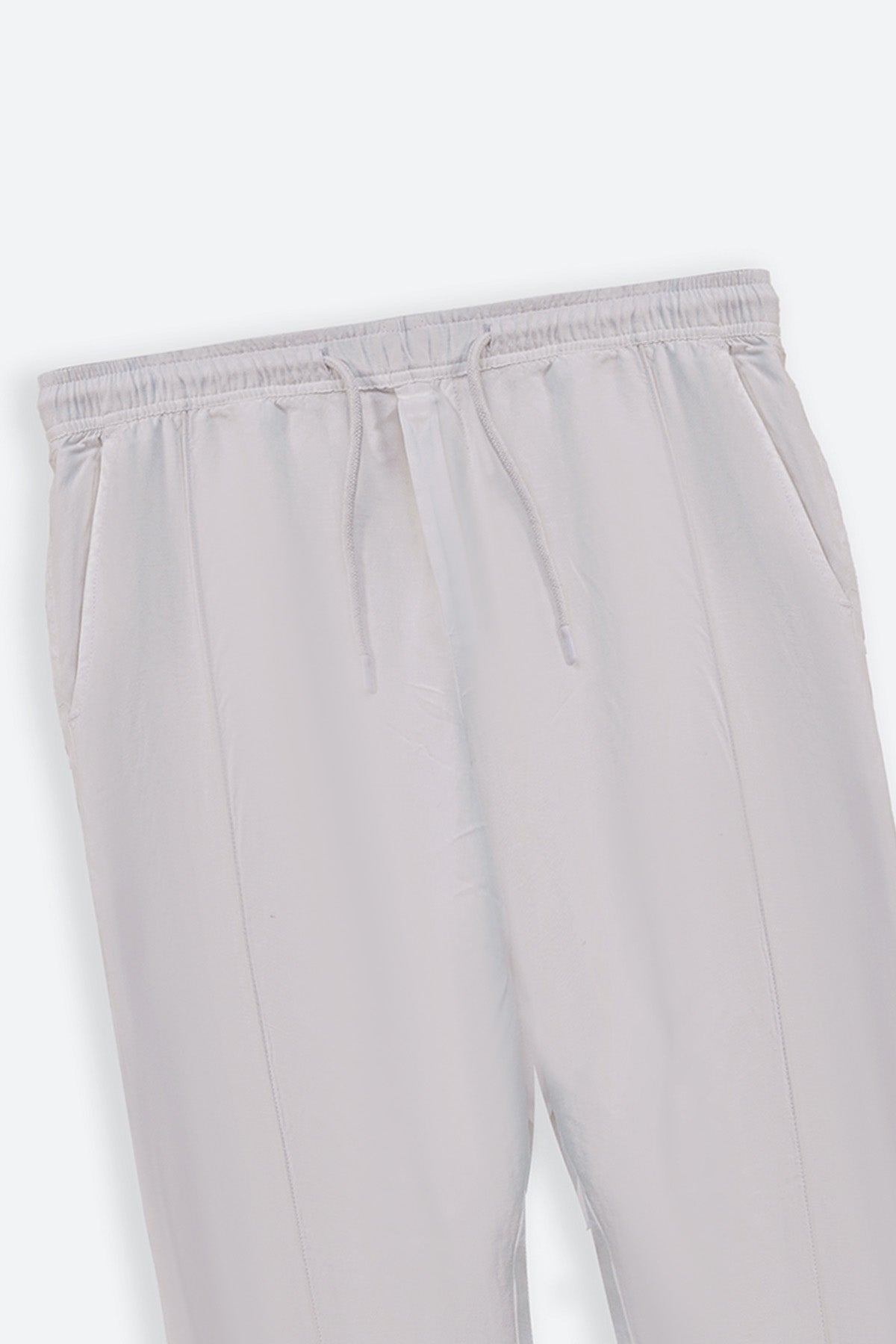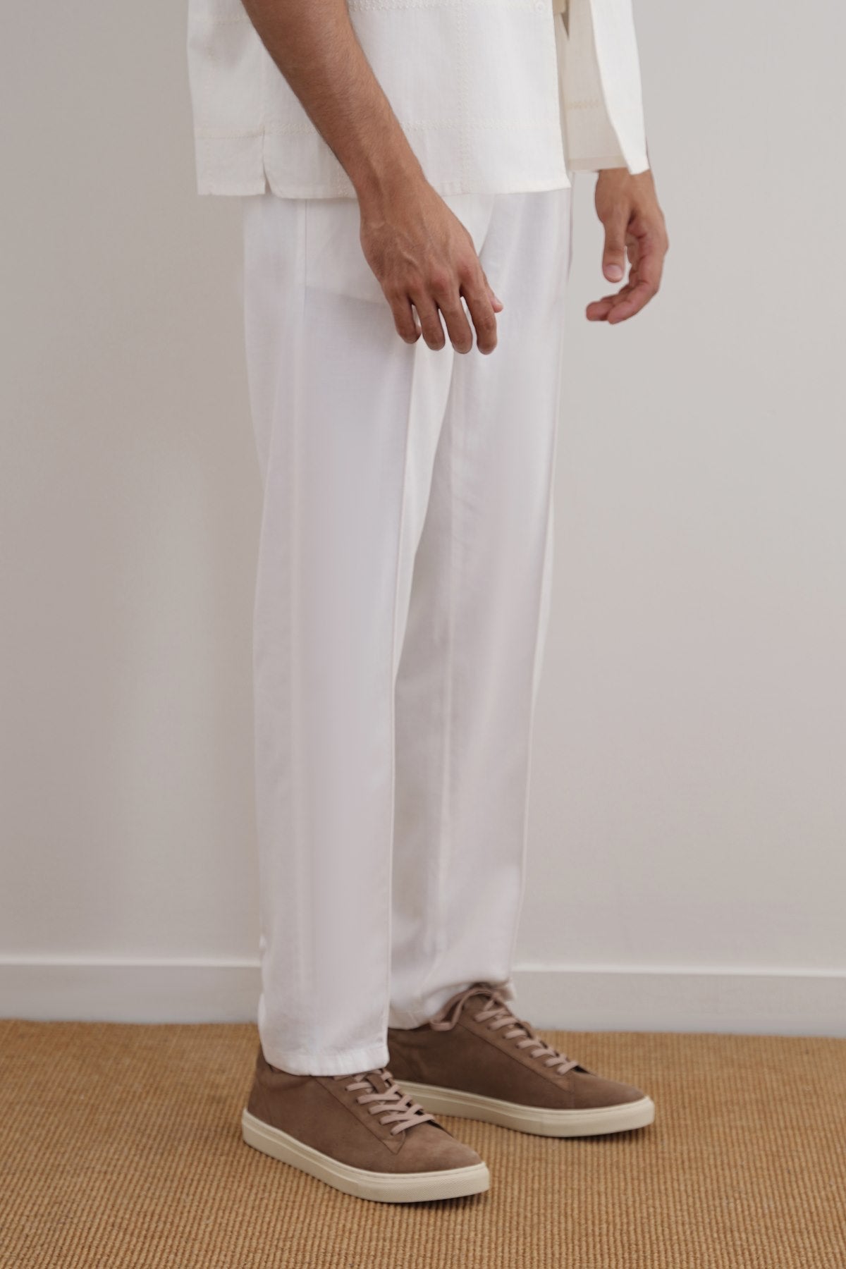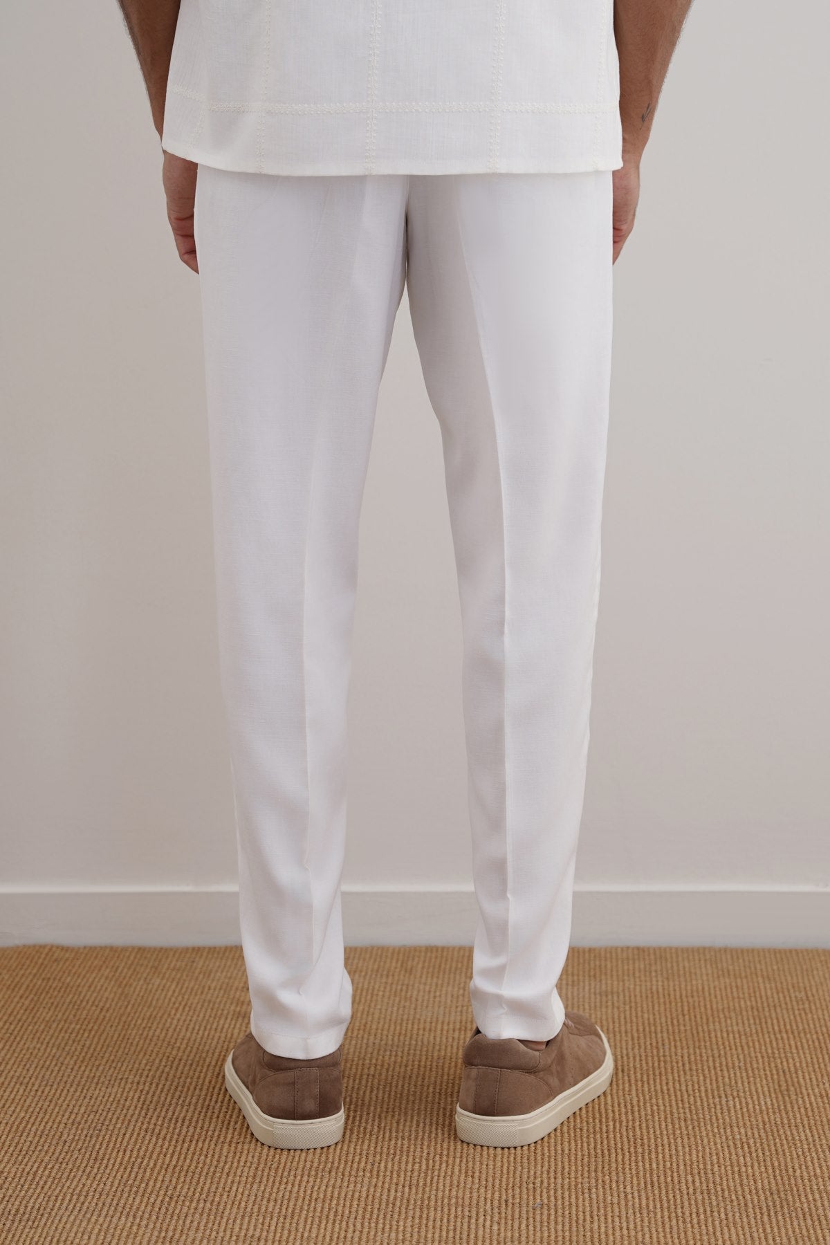 Design details: Tapered pants with an elasticated waist band and drawcord. Front tuck pleats, cross pockets and a single bone pocket at the back.