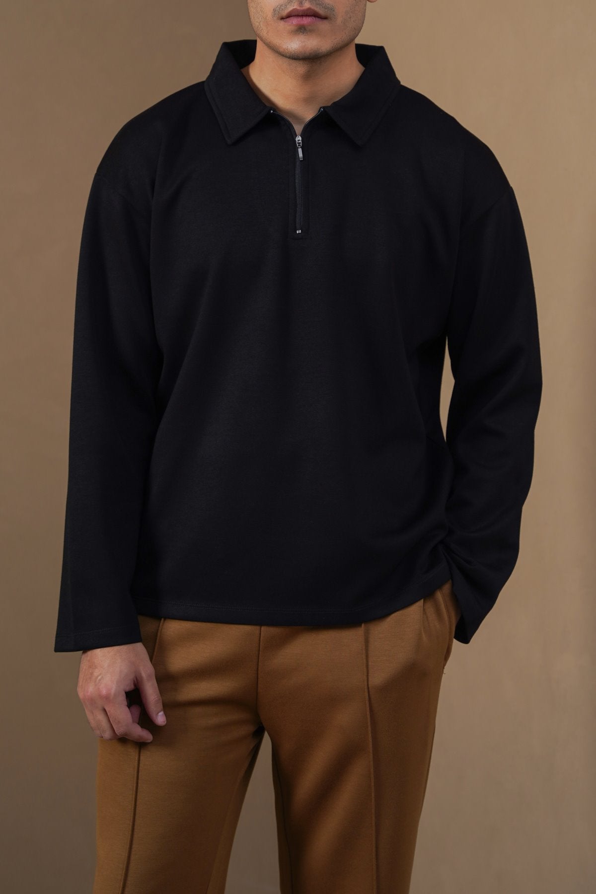 Design details: Neoprene polo with long sleeves and front quarter zipper.