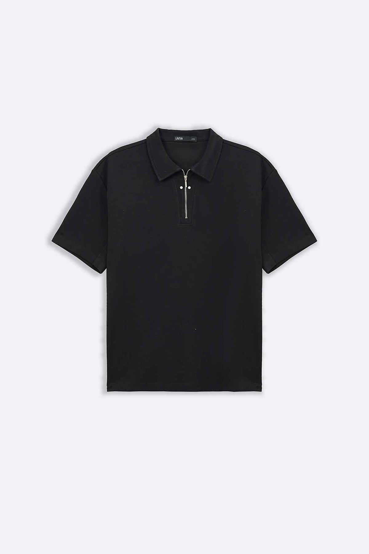 Design details: Collared knit polo shirt with front zip fastening and short sleeves.