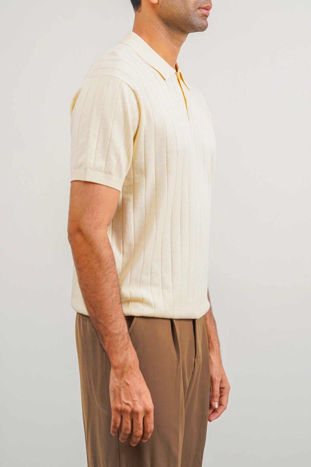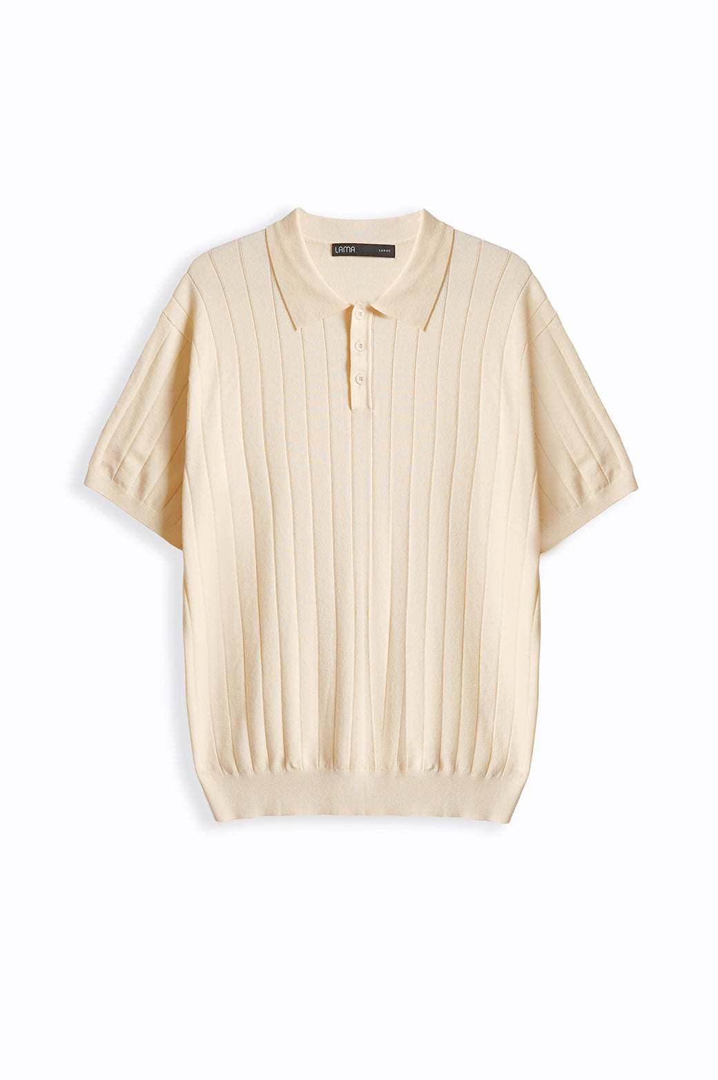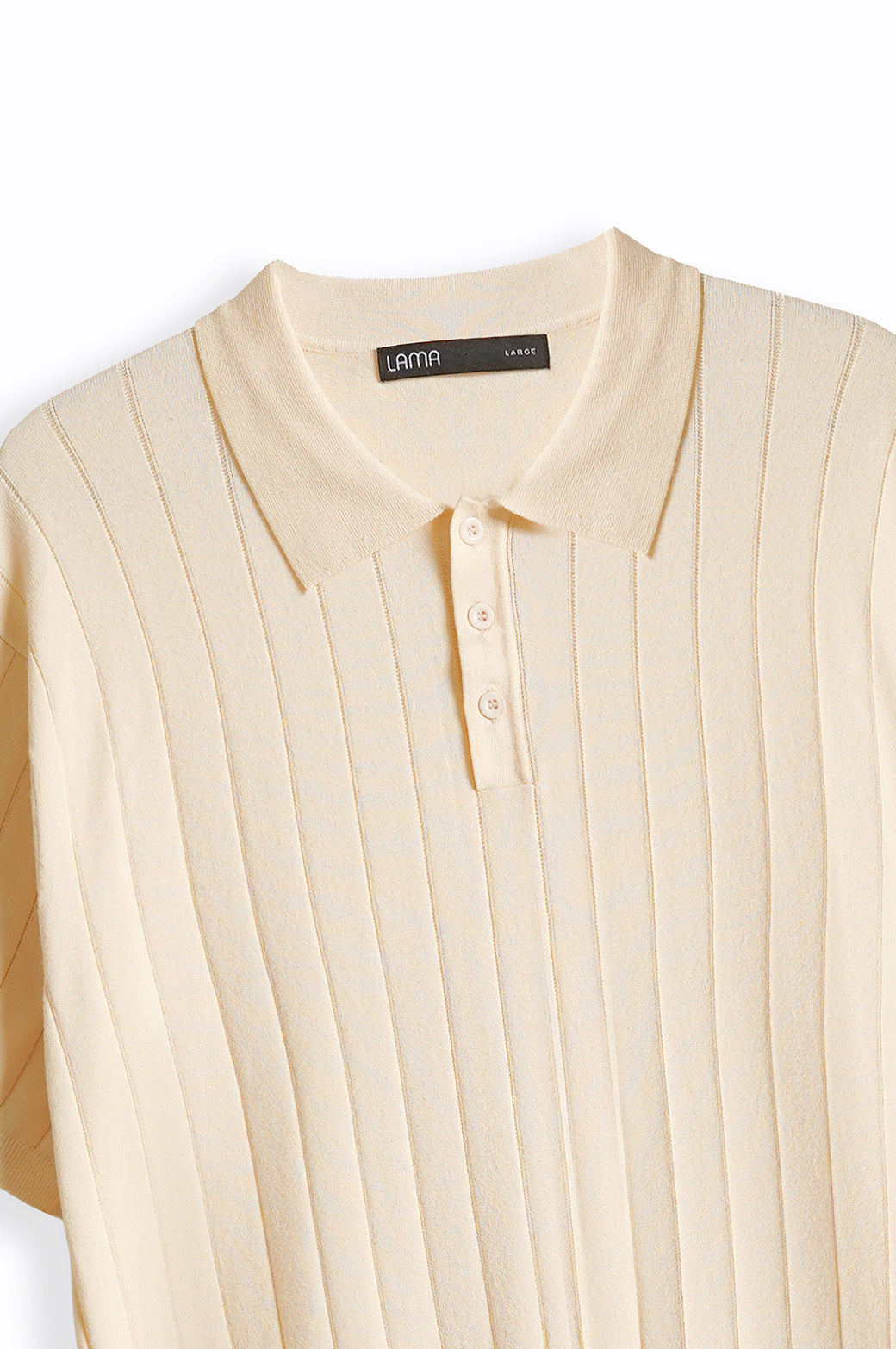 Design Details: Collared polo shirt made with mix yarn featuring front button fastening, short sleeves and ribbed trims.