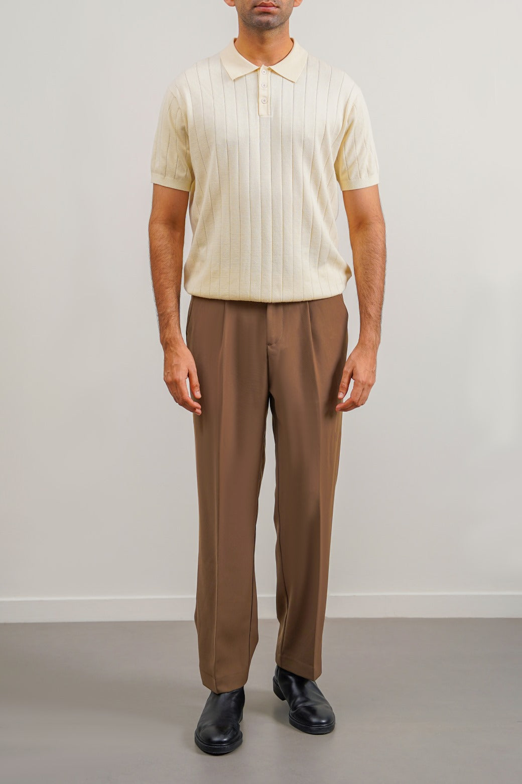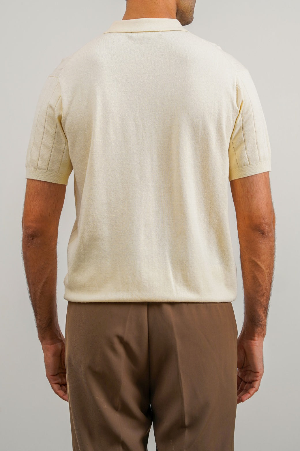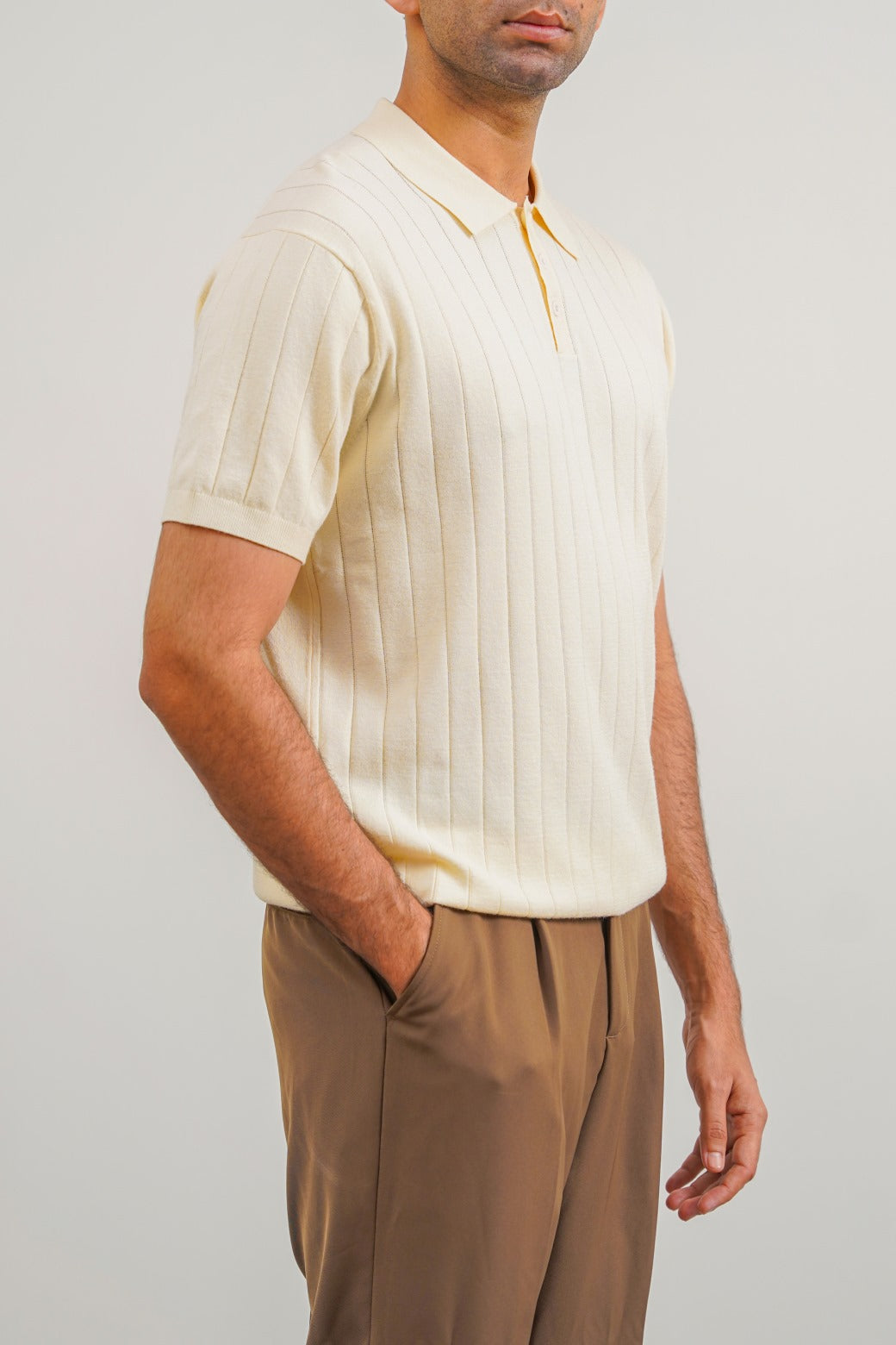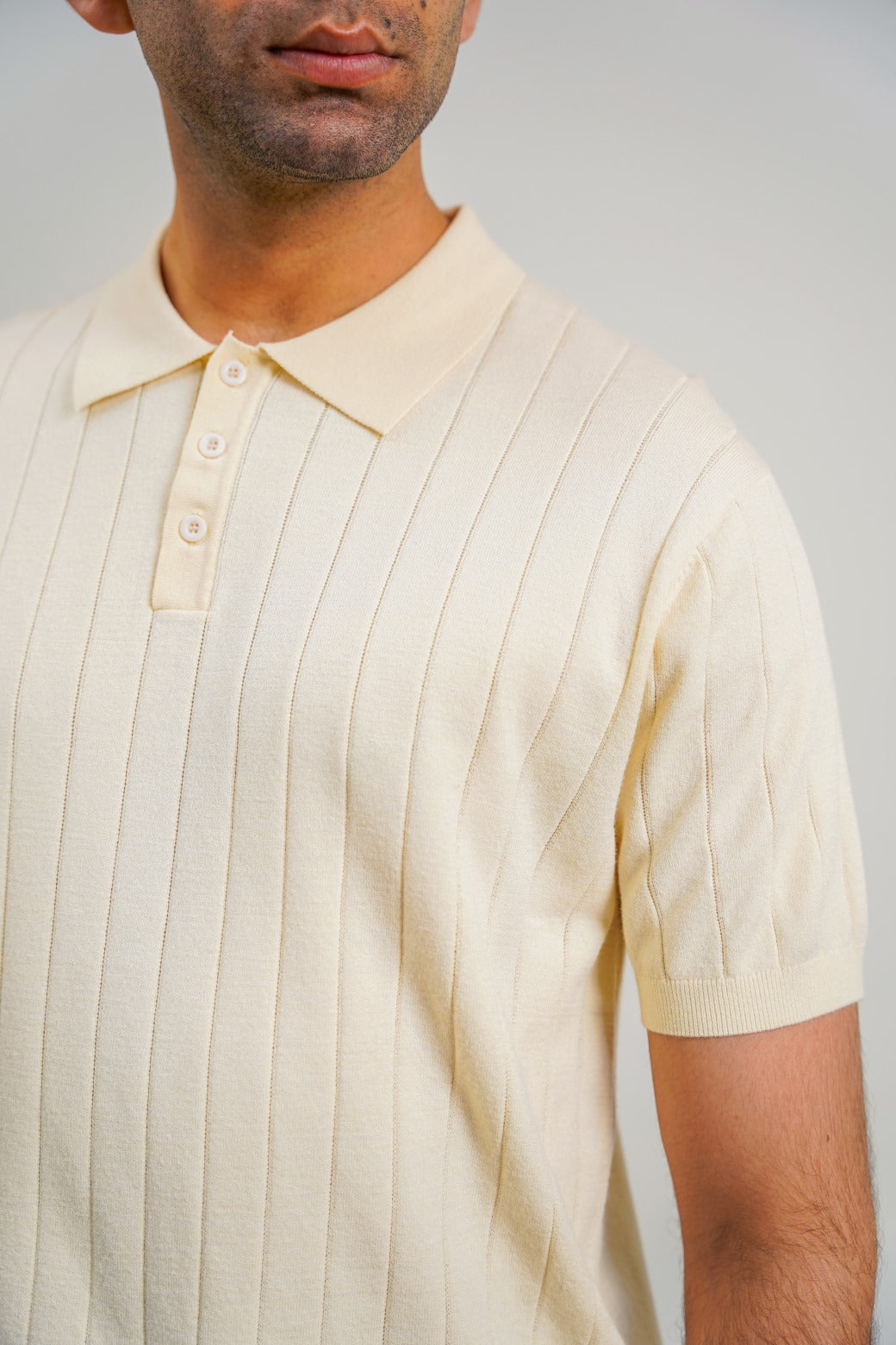 Design Details: Collared polo shirt made with mix yarn featuring front button fastening, short sleeves and ribbed trims.