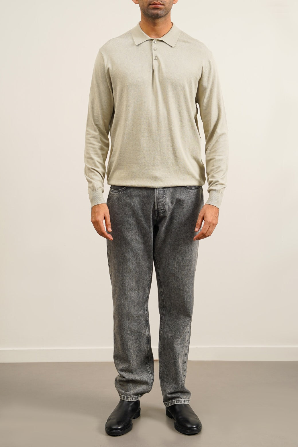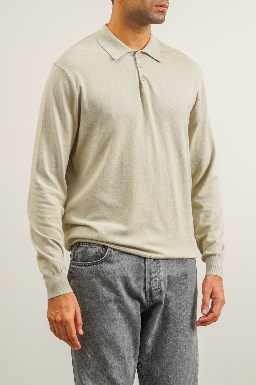 Design Details: Collared knit polo shirt made of a spun viscose blend. Button-up front, long sleeves along with ribbed trims.