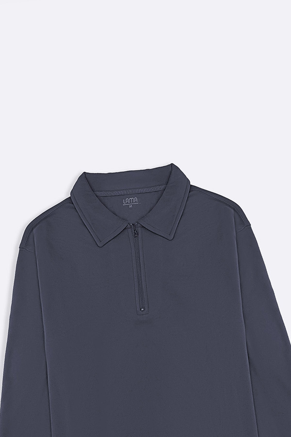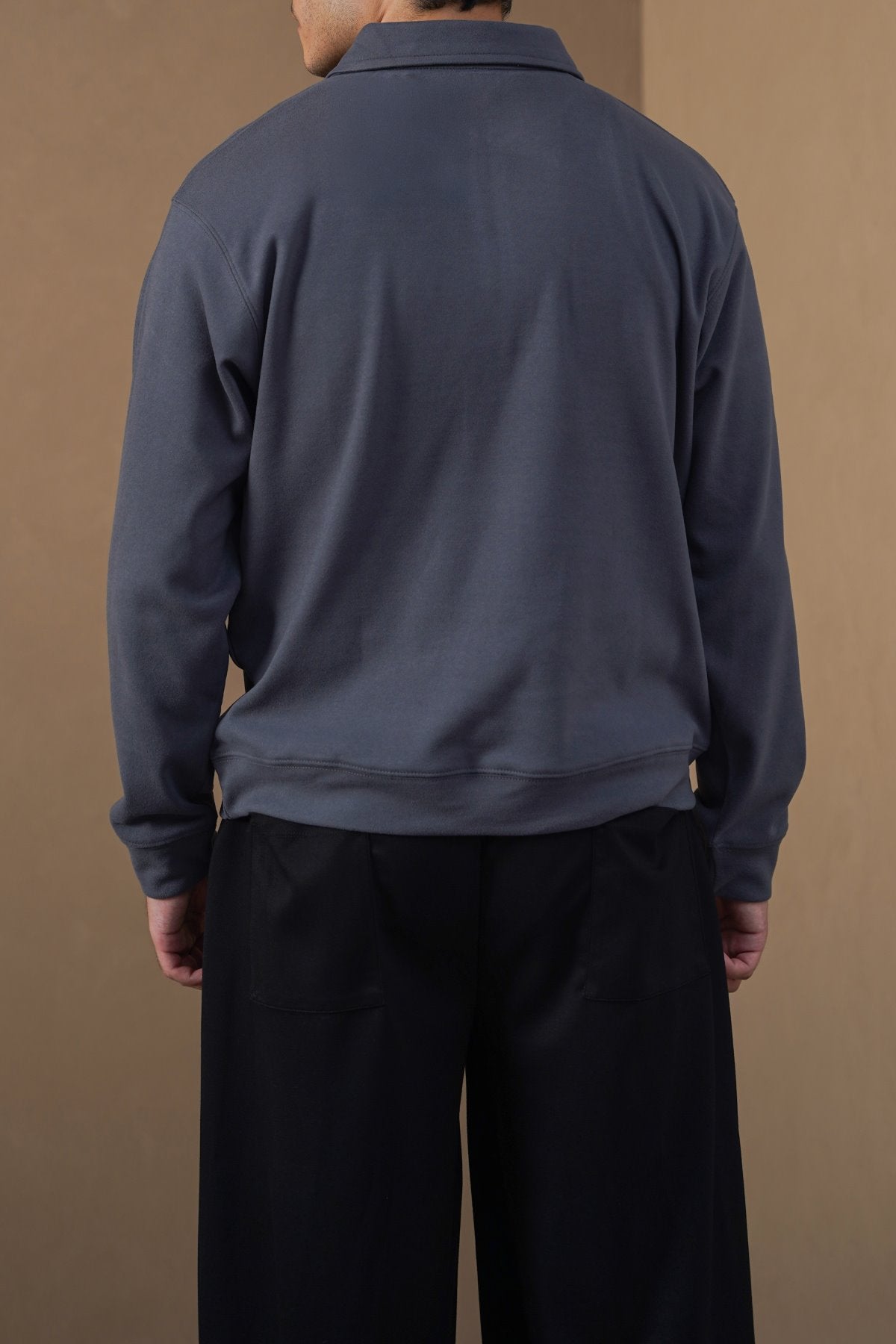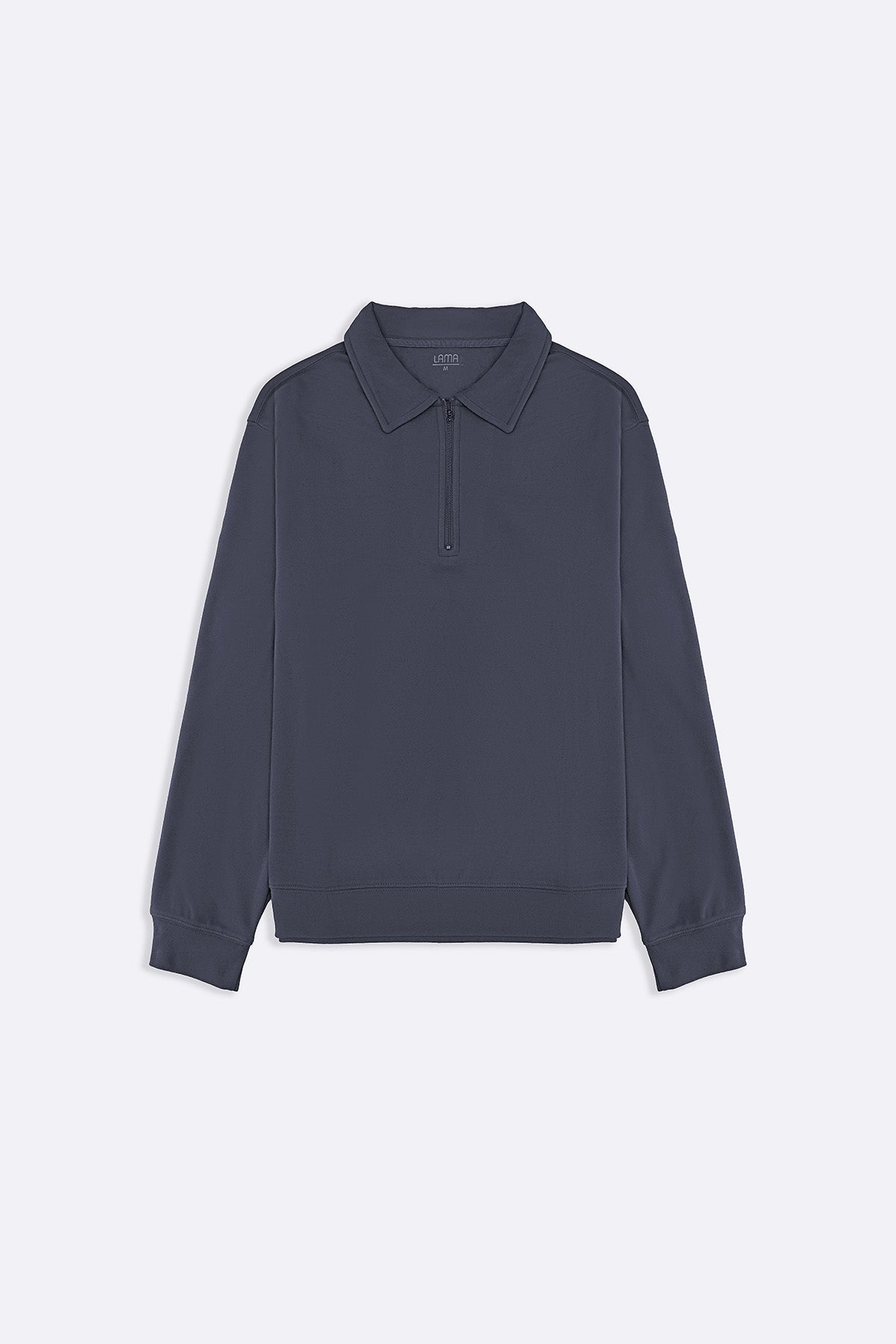 Design details: Neoprene fleece quarter-zip polo sweatshirt with long sleeves.