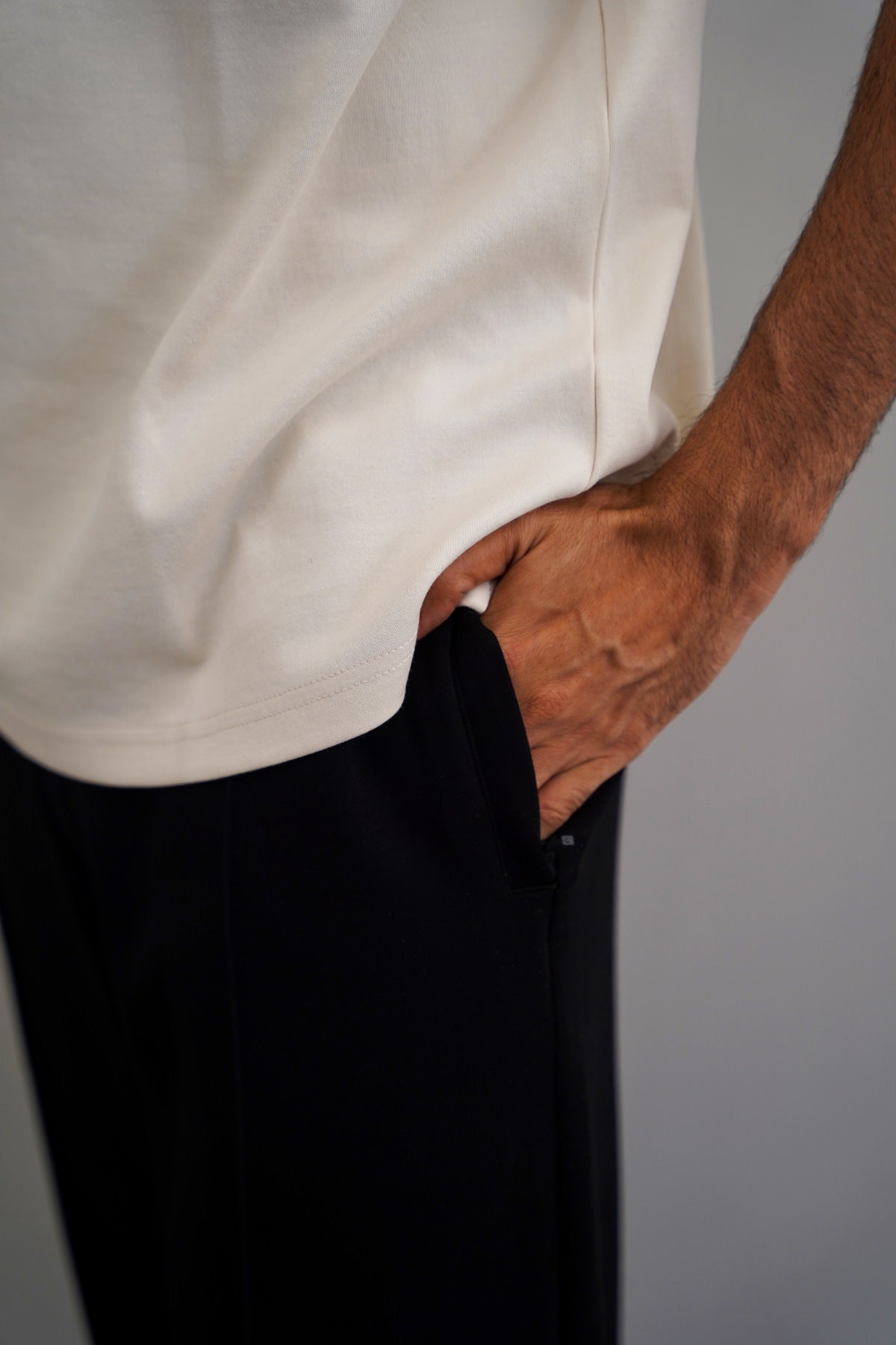 Design details: Relaxed fit pants with an adjustable elasticated drawstring waistband. Front pockets and back patch pocket. Seam detail on the front of the legs.