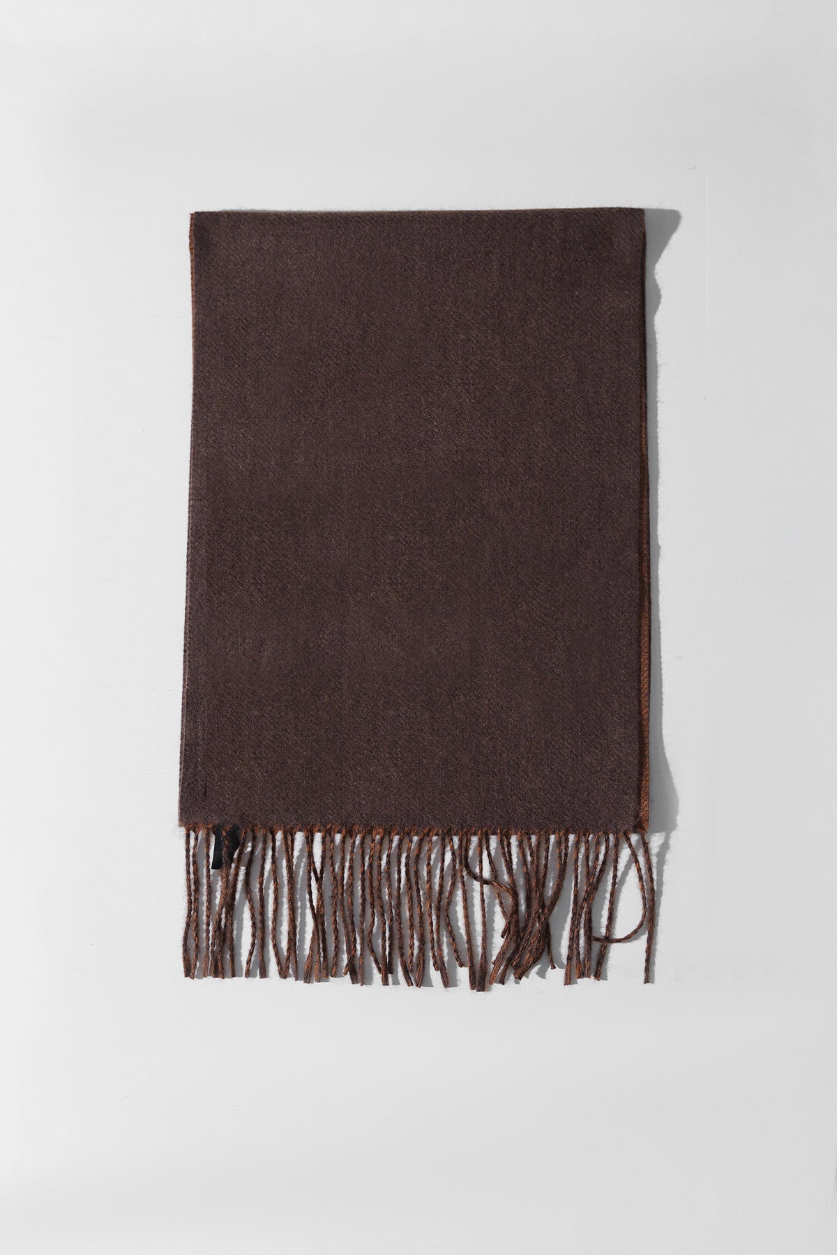 Design details: Two-toned, light-weight and soft reversible scarf with a brushed texture and long fringes. One side has a melange effect and the other side is plain.