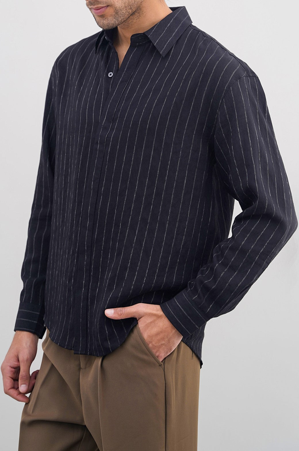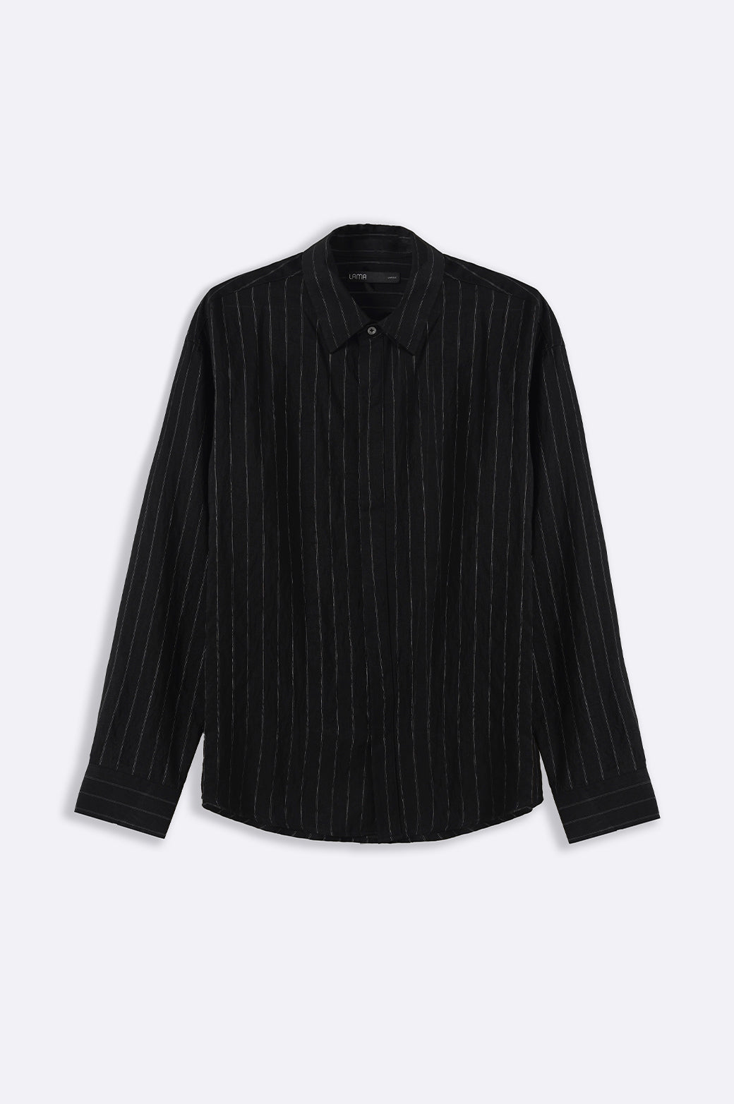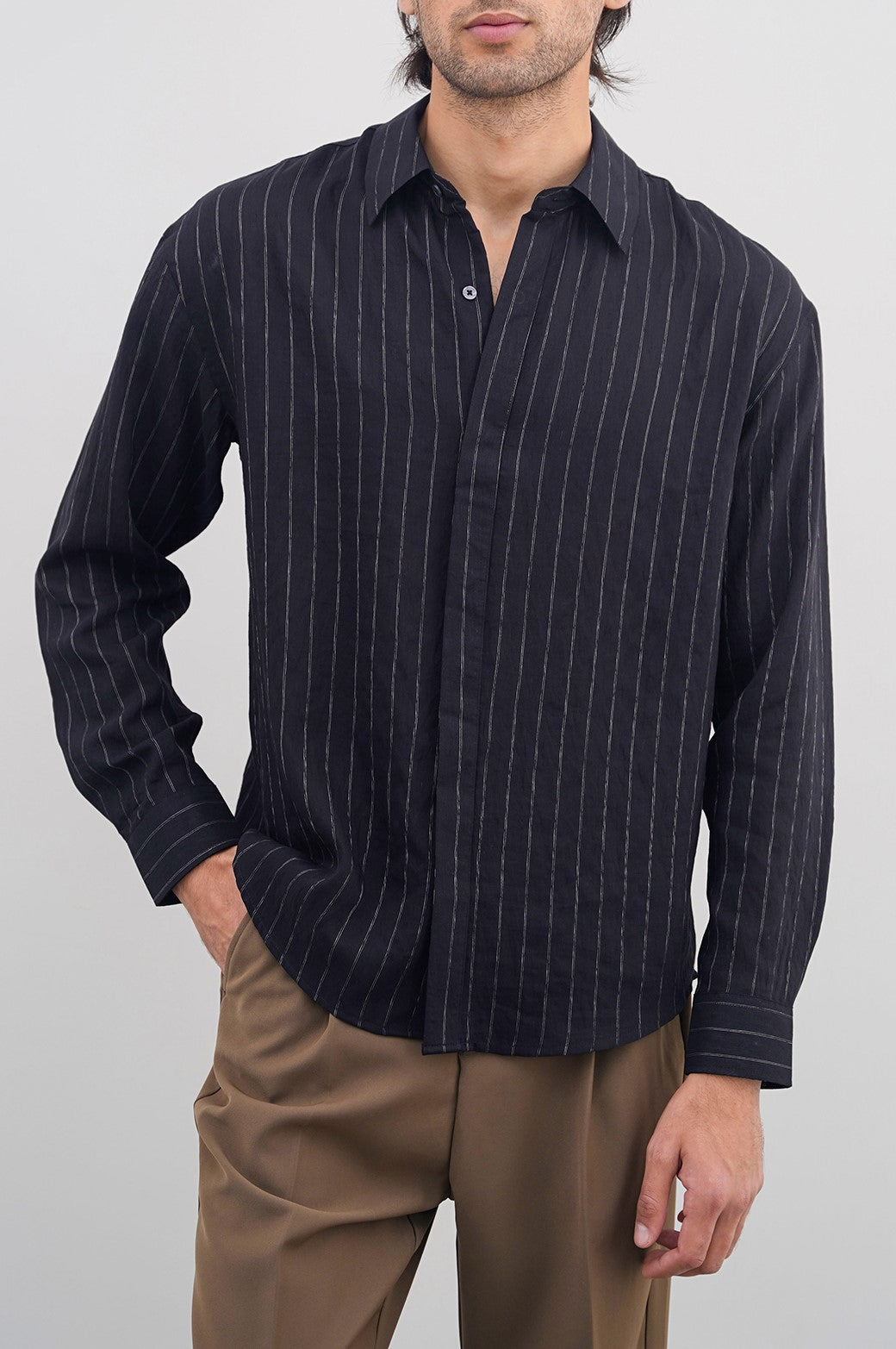 Design details: Linen blend button down shirt, with a front hidden placket and long cuffed sleeves.