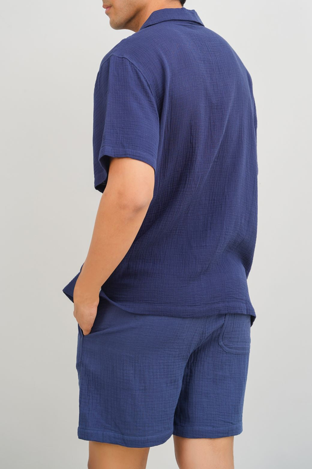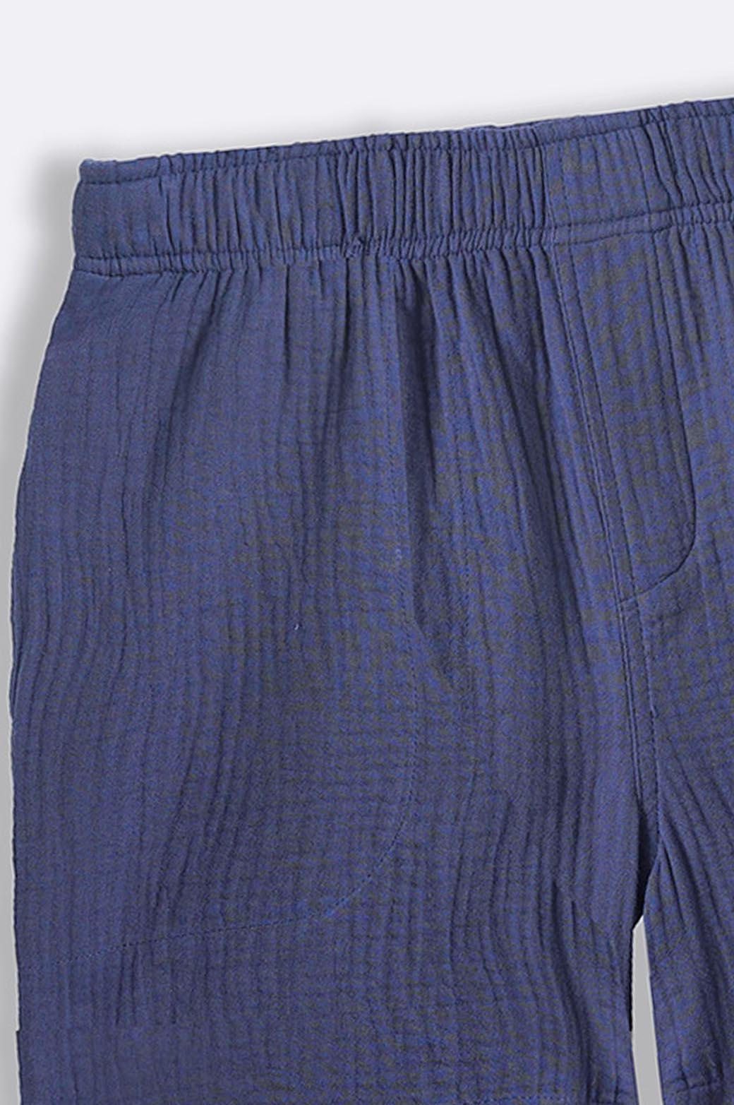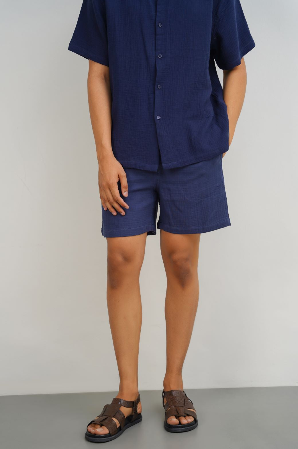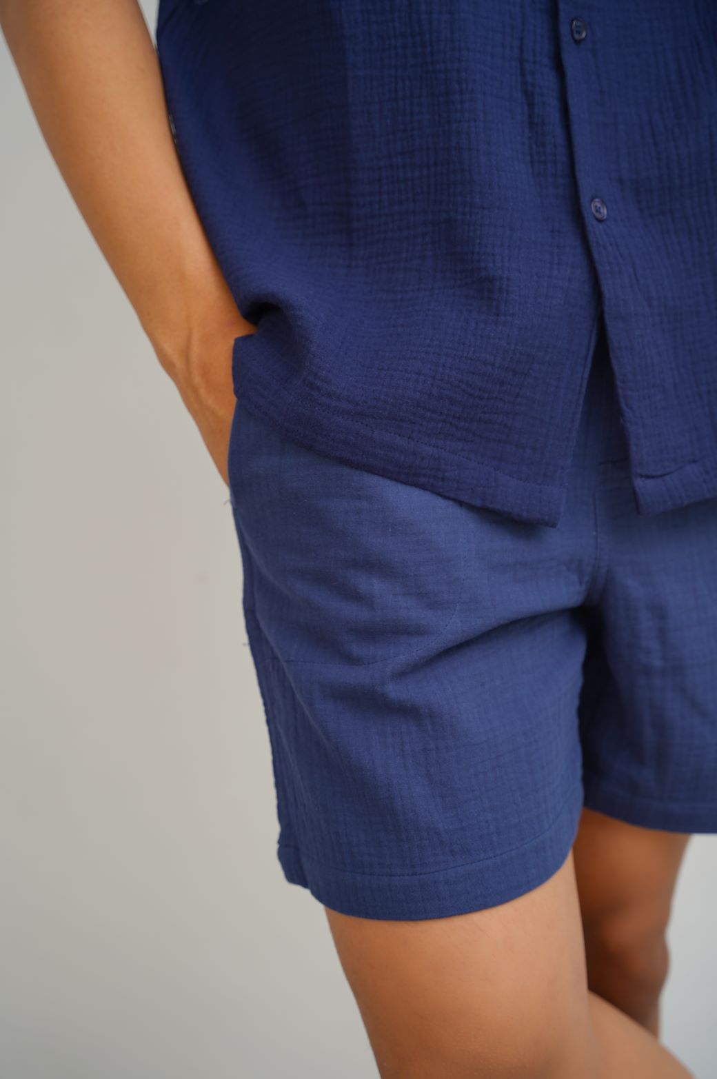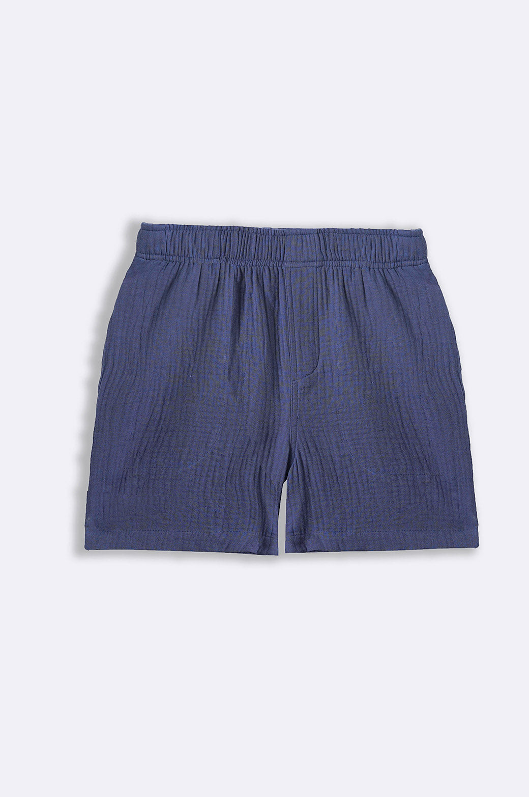 Design details: Muslin linen shorts with adjustable elastic drawstring waistband, front pockets and back patch pocket.