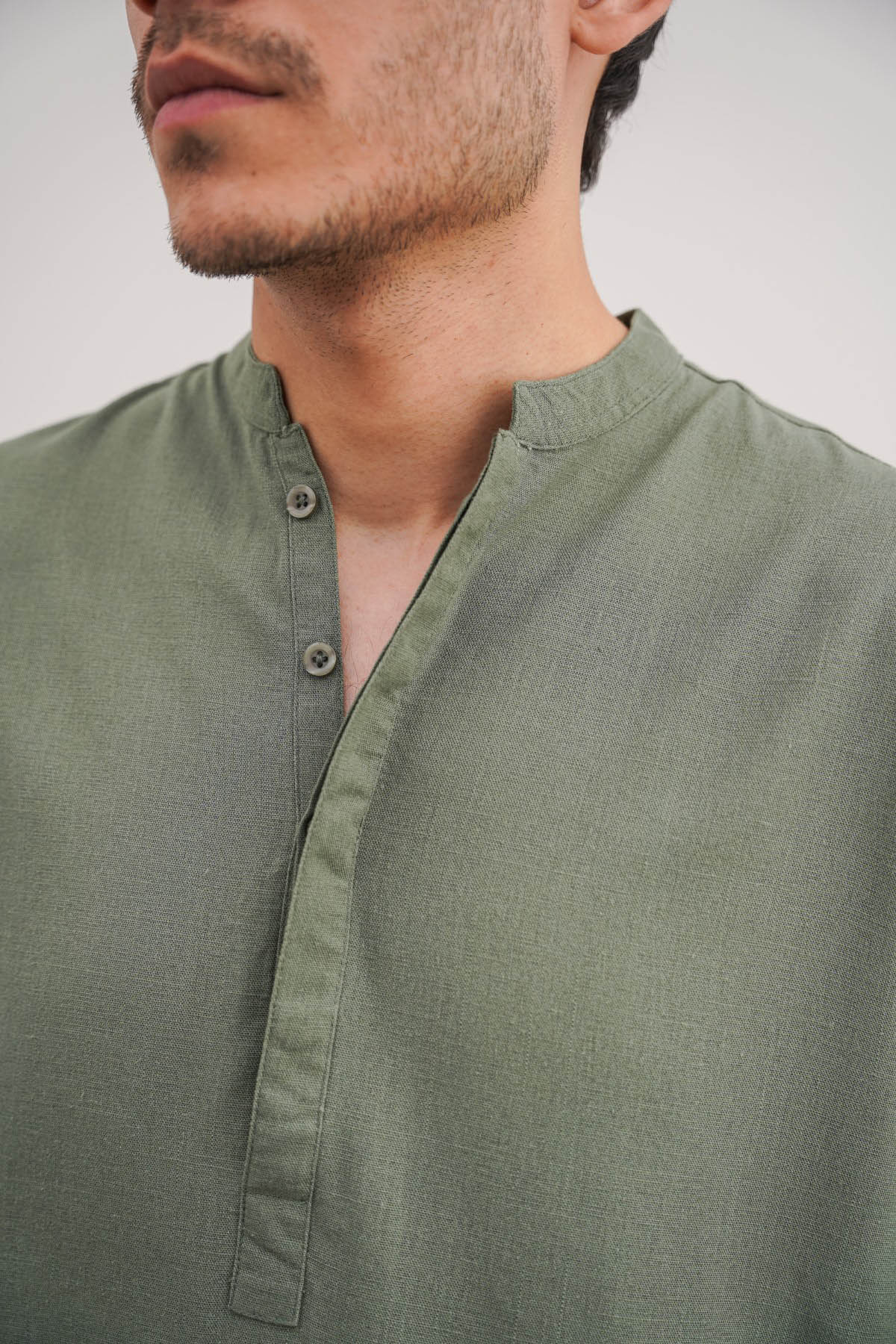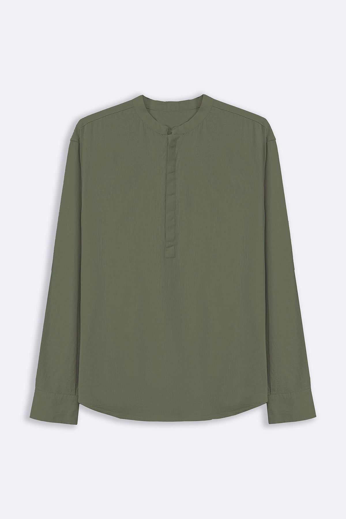 Design details: Full sleeves band collar shirt with a hidden half button placket.
