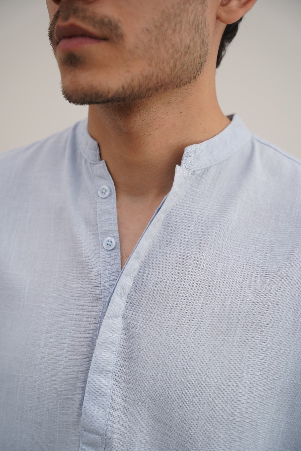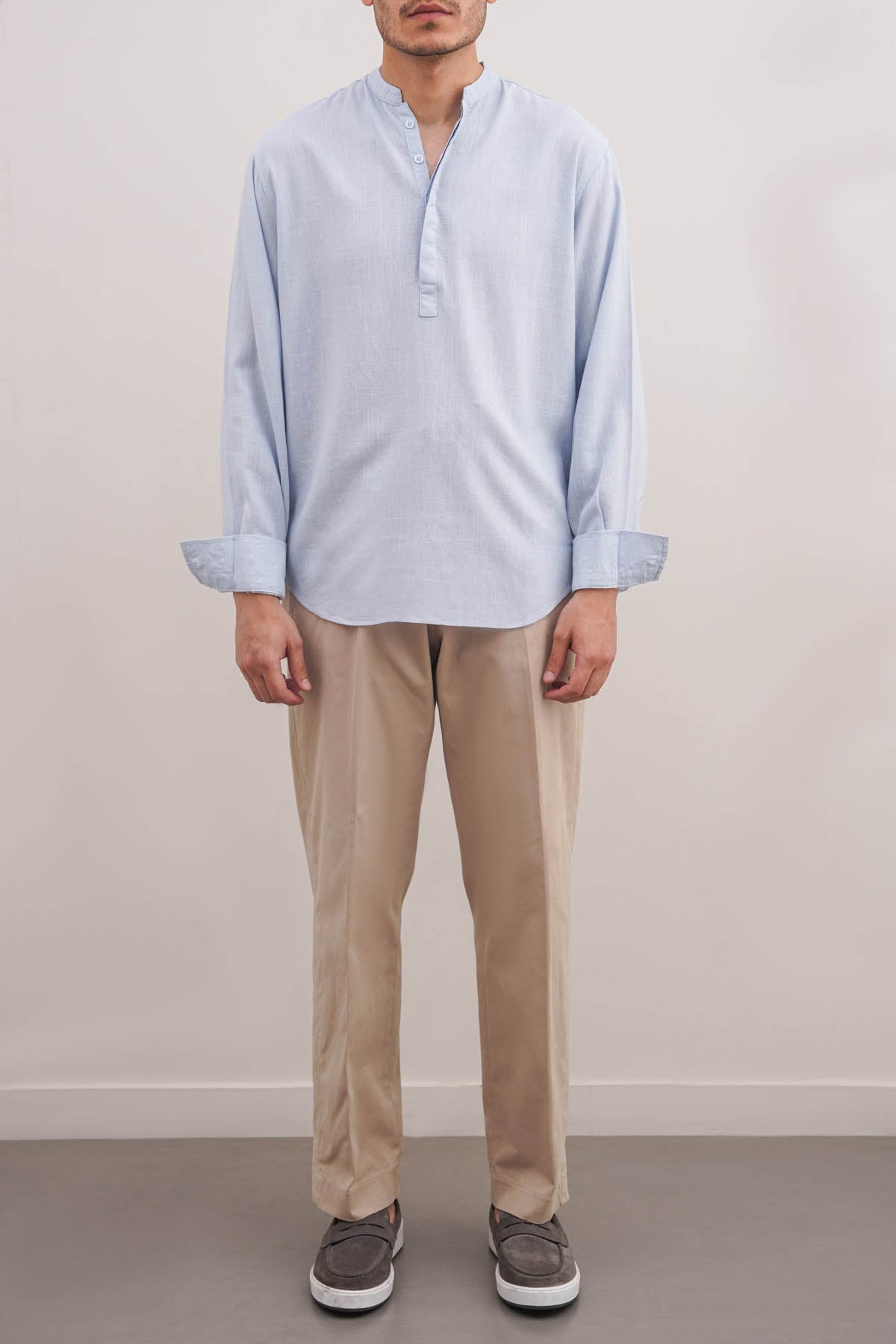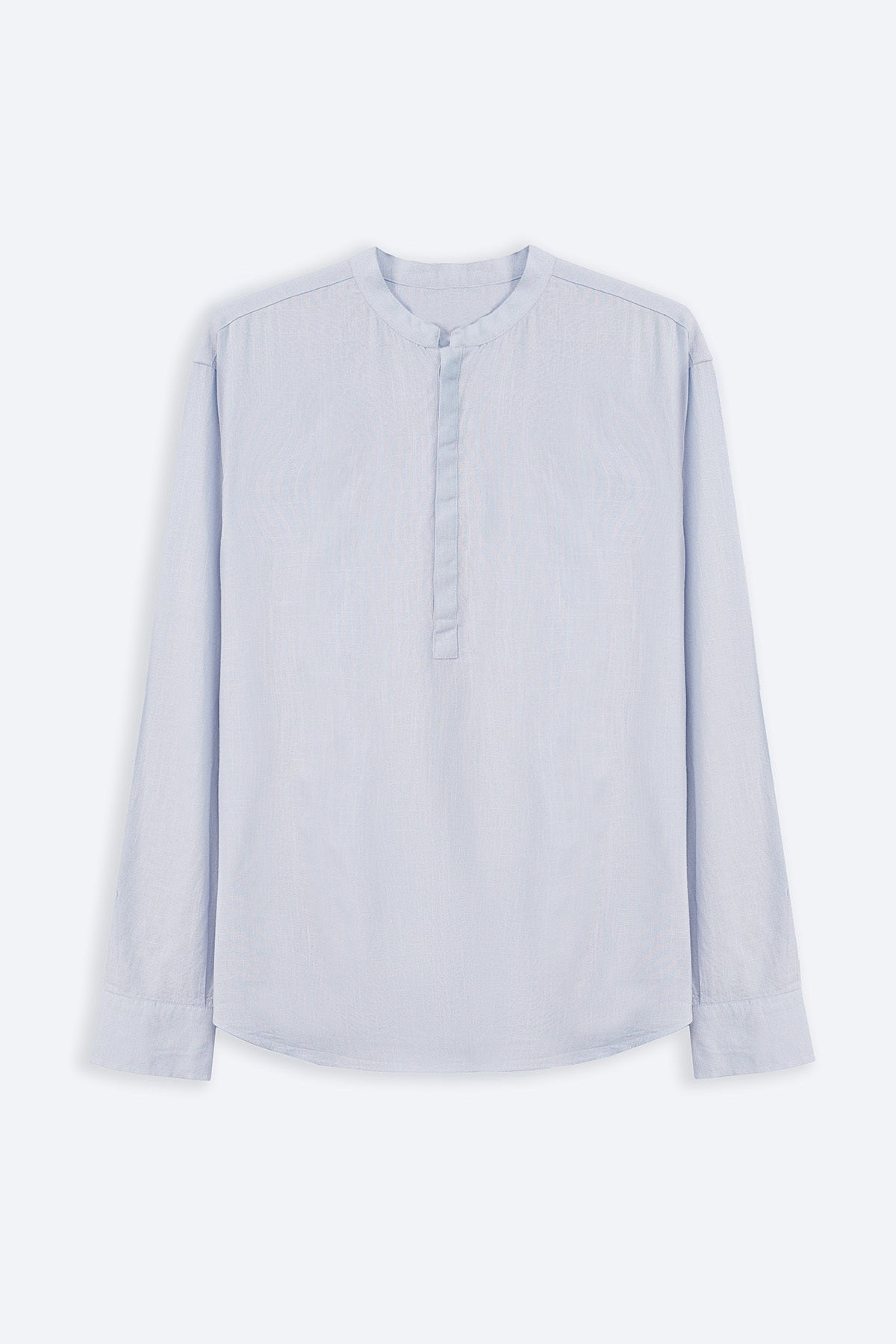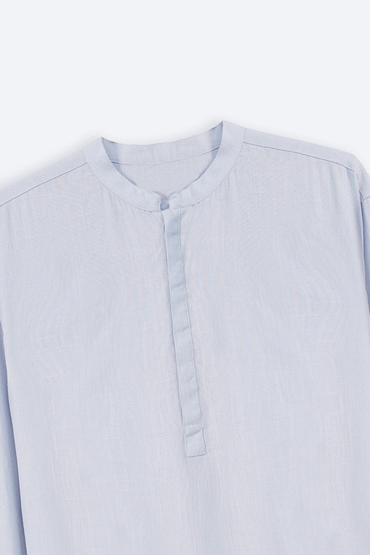 Design details: Full sleeves band collar shirt with a hidden half button placket.