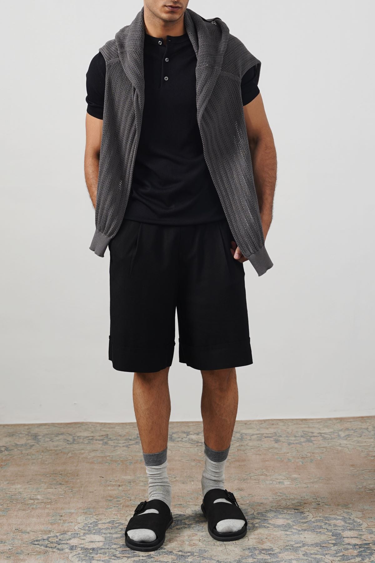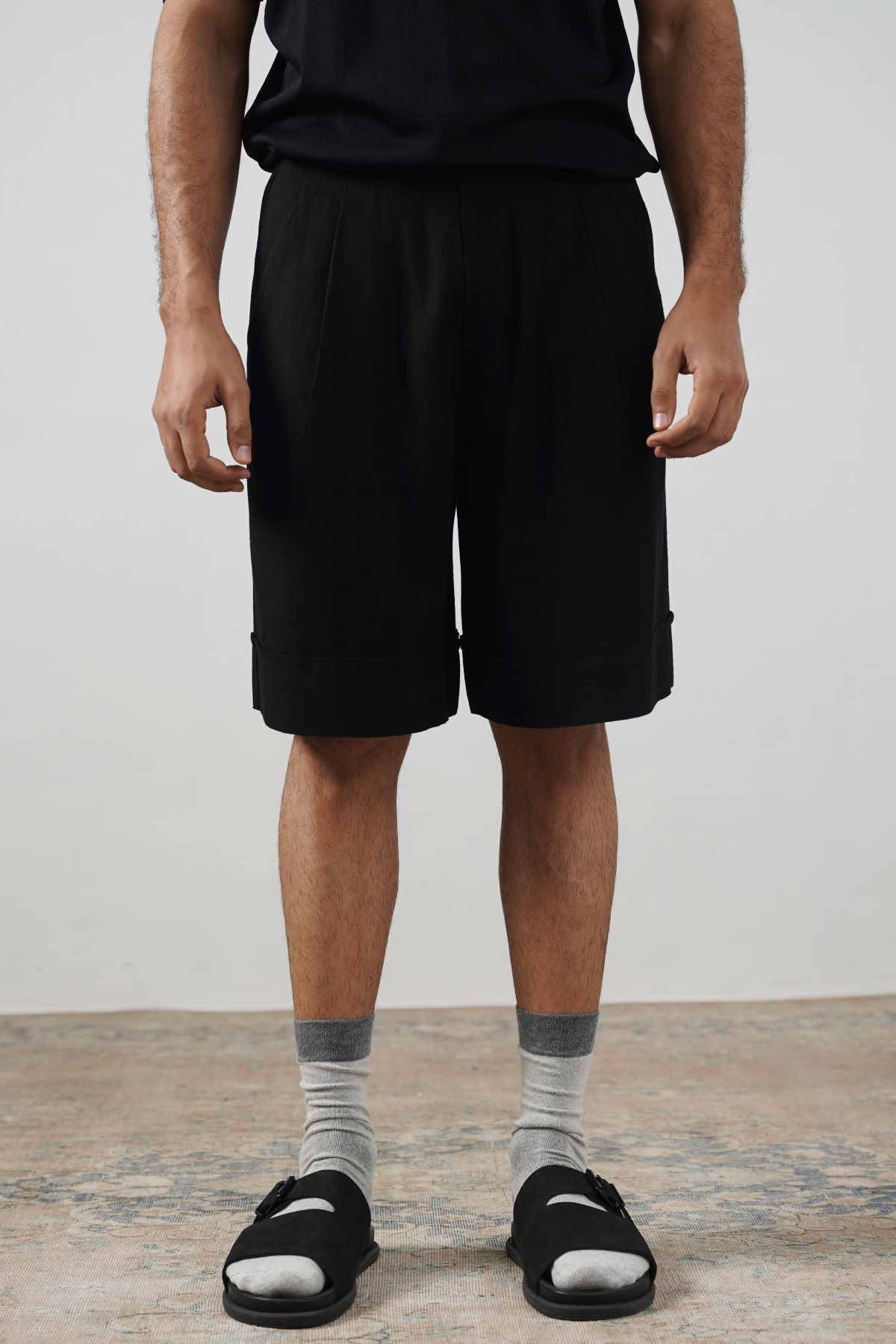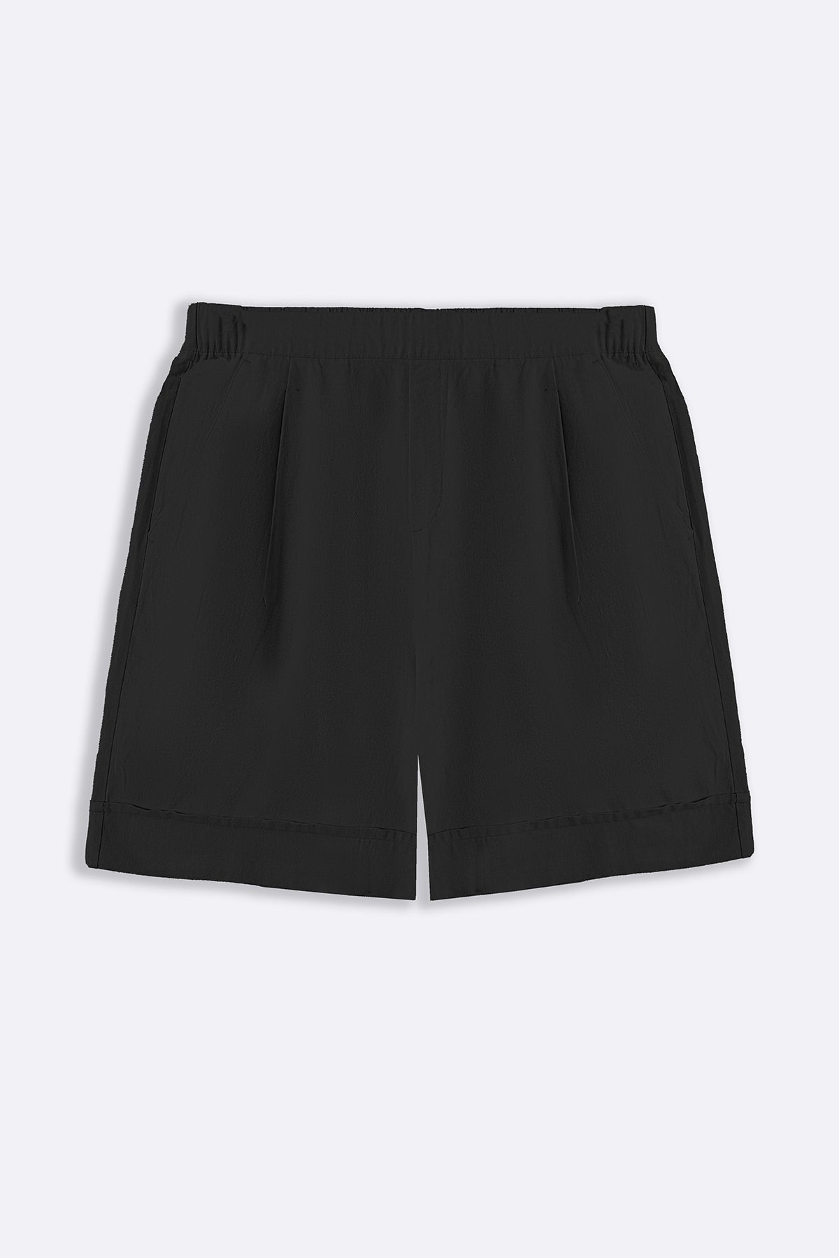 Design details: Loose fit shorts with an elasticated waist band, turned up hem, front pleats and cross pockets.