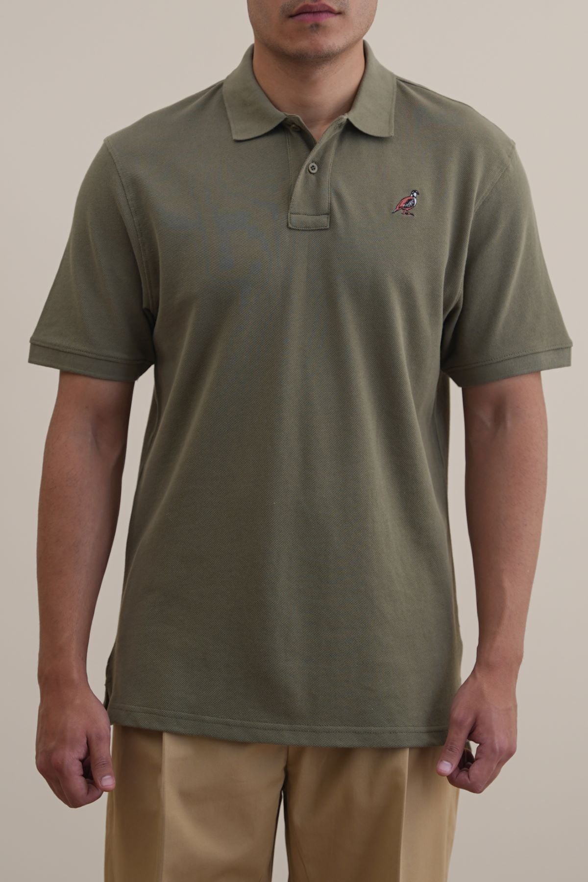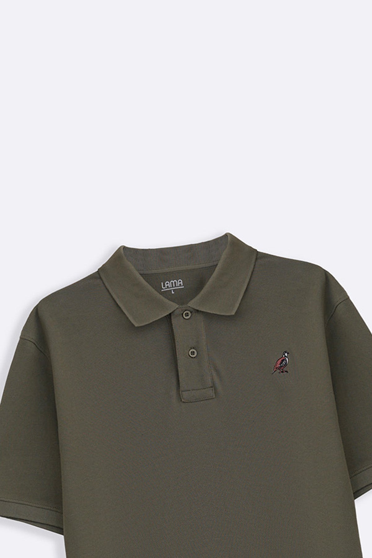 Design details: Short sleeved polo along with front button fastening and embroidery at chest. Thick quarter placket detail and ribbed collar and sleeve hem.