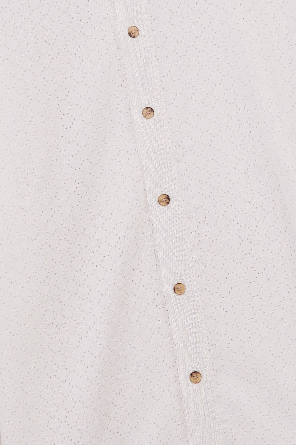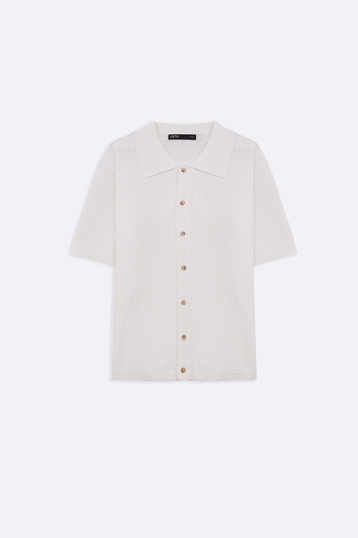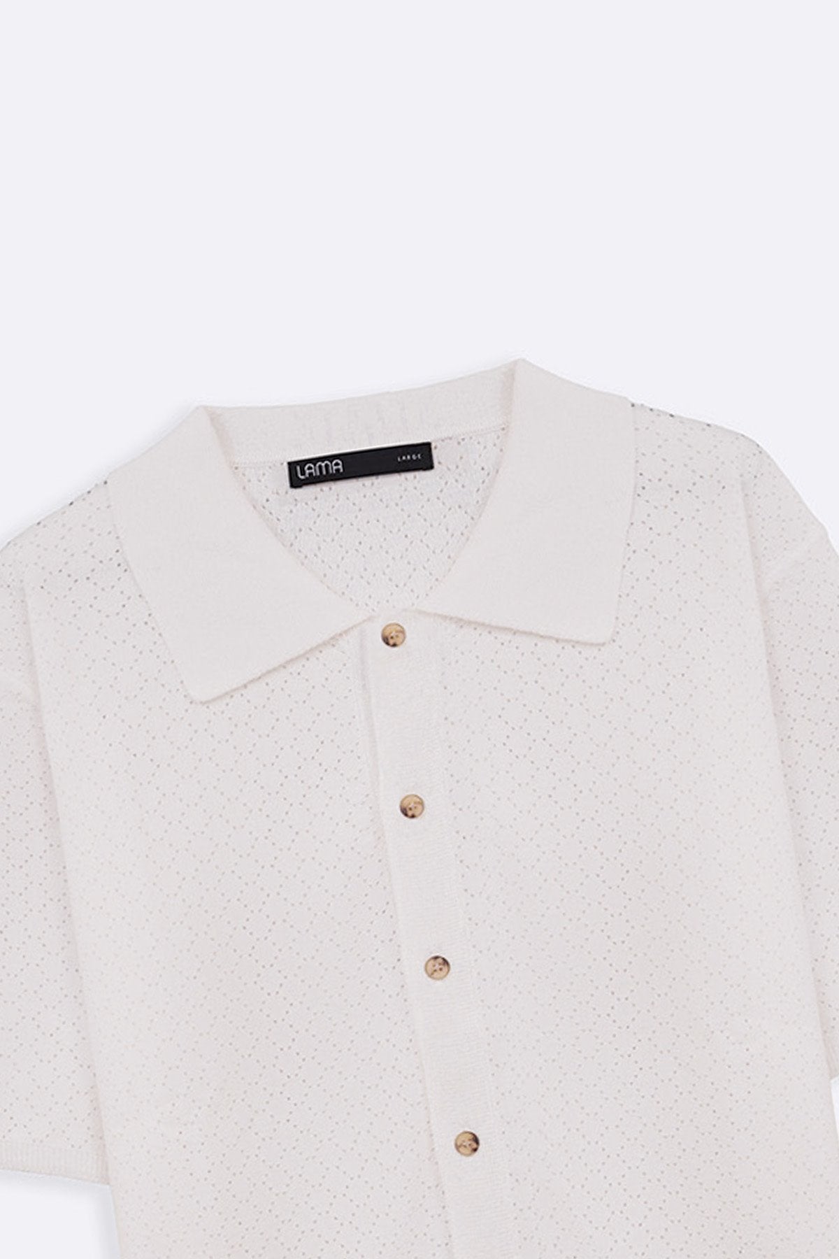 Design details: A button-down polo shirt with short sleeves, ribbed trims, and pointelle knit detailing.