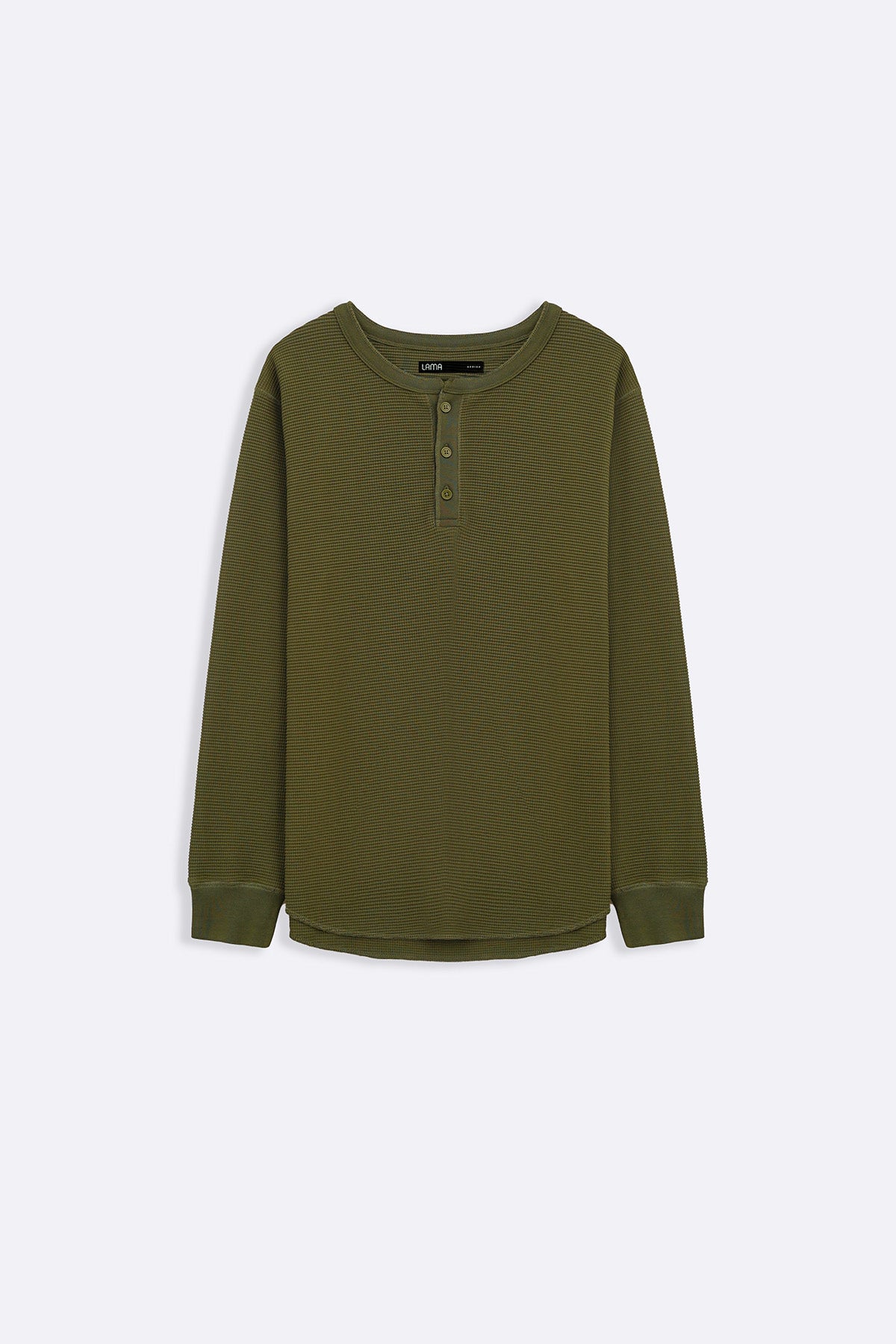 Design details: Henley neckline baby waffle knitted t-shirt with long sleeves, quarter button closure and ribbed trims.
