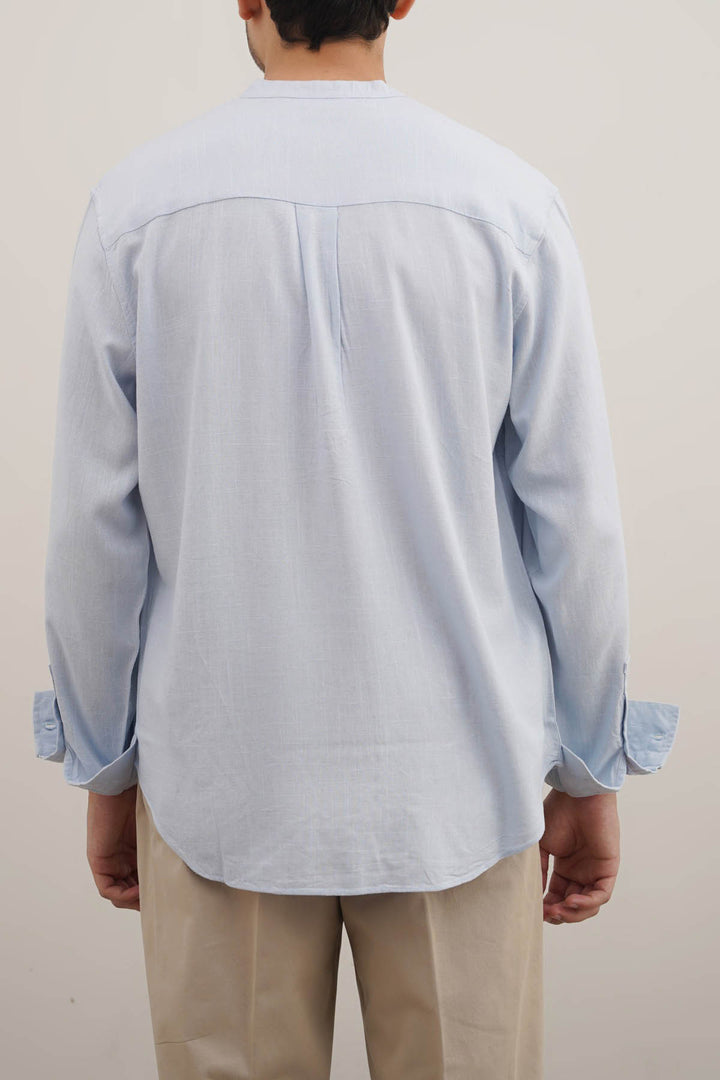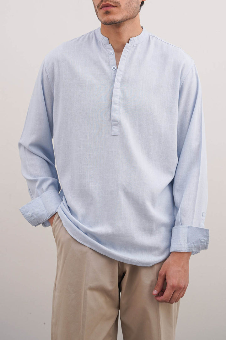 Design details: Full sleeves band collar shirt with a hidden half button placket.