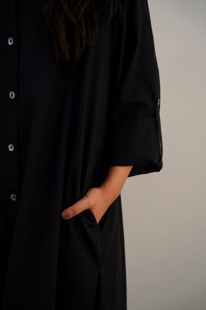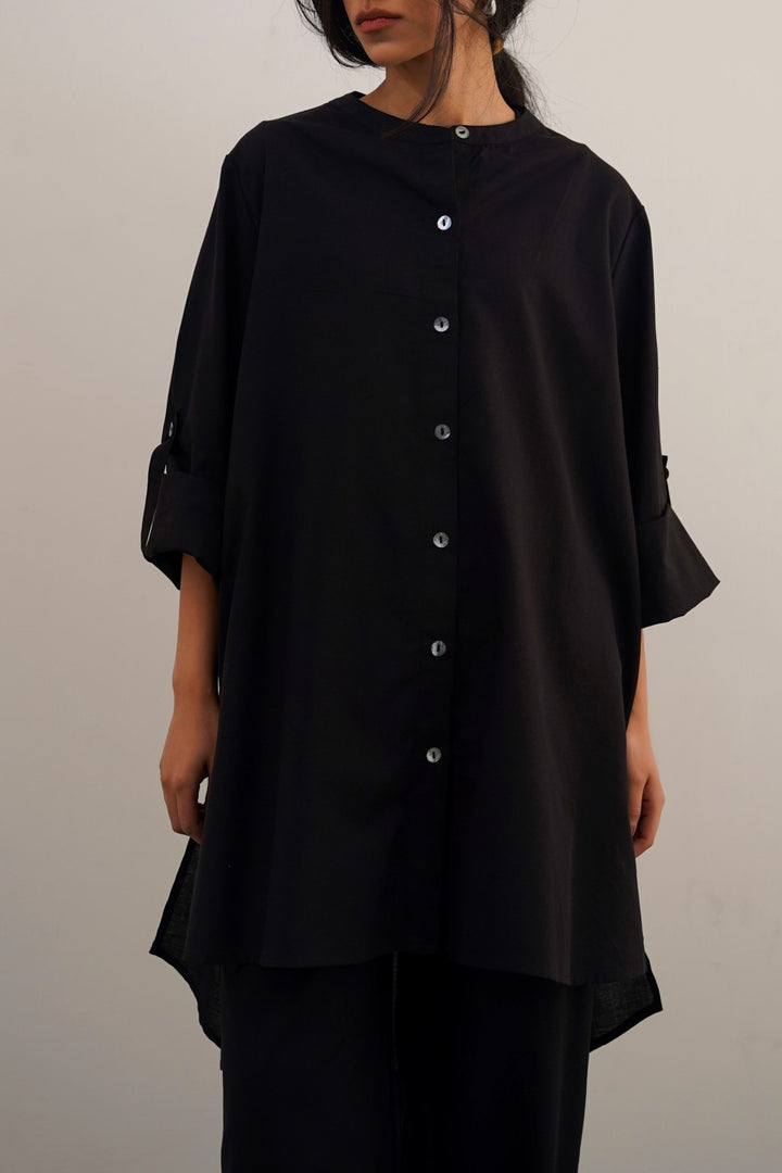 Design details: Band collar tunic featuring a longer back with pleat detail, side pockets and roll up sleeves along with front pearl button closure.