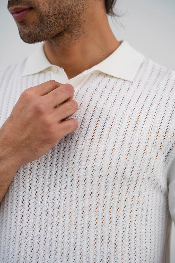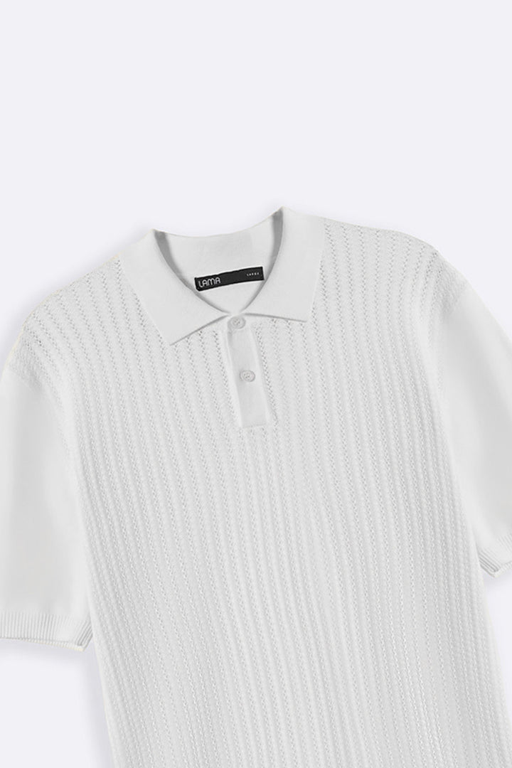 Design details: A textured knit polo shirt, designed with a front button closure and ribbed details on the half sleeves and hem.