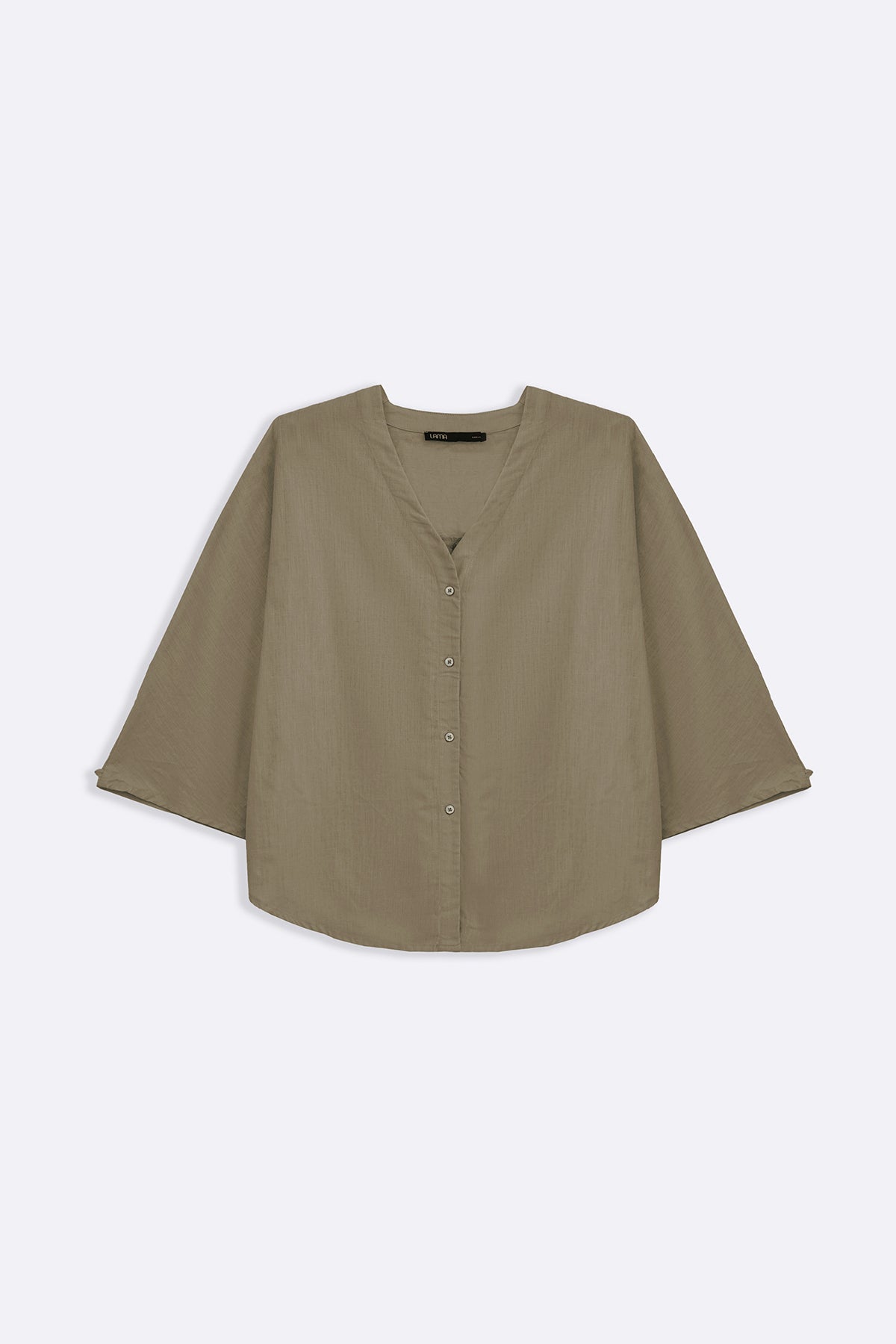 Design details: V-neck buttoned blouse with full sleeves, featuring a loop button detail at the sleeve hem and a box pleat at the back