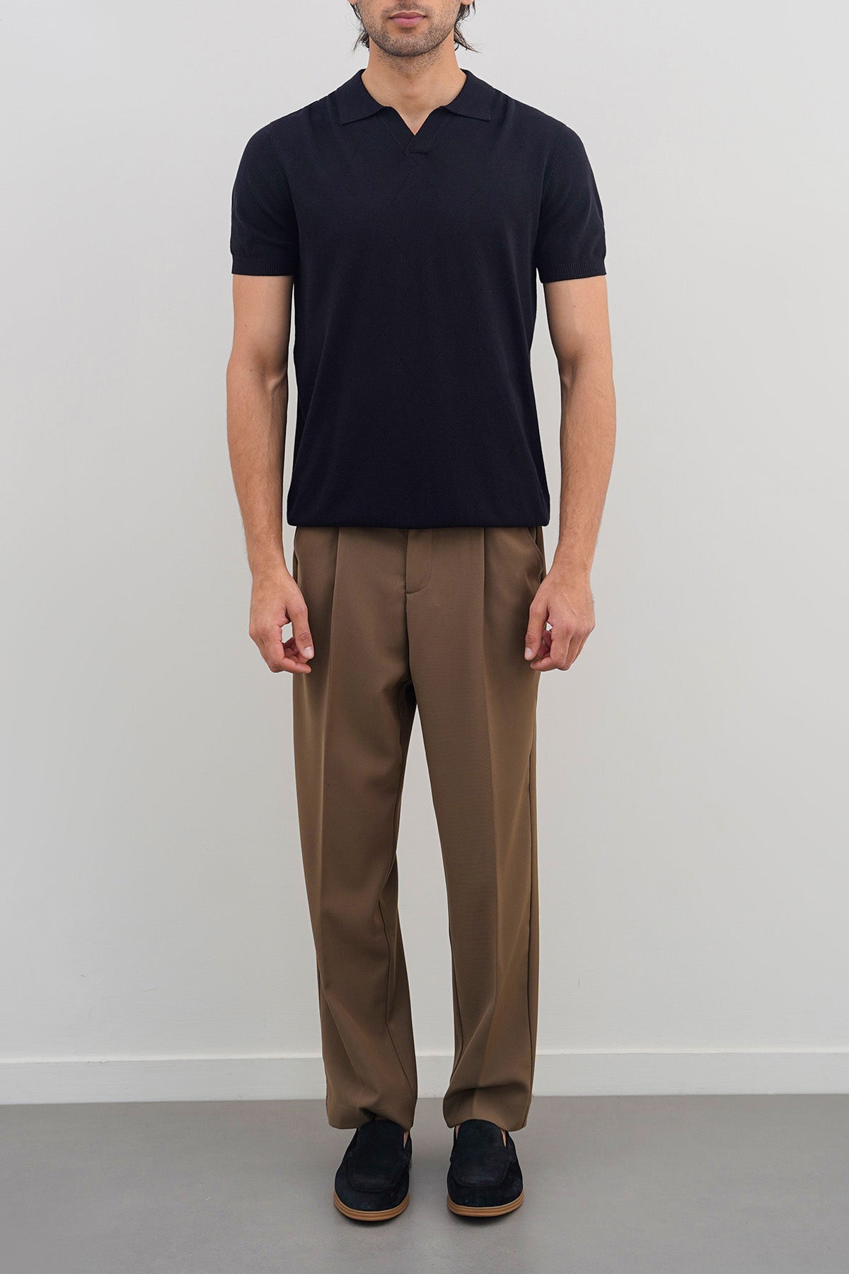 Design details: Knitted polo featuring a johny collar at the front, with ribbed short sleeves and hem.