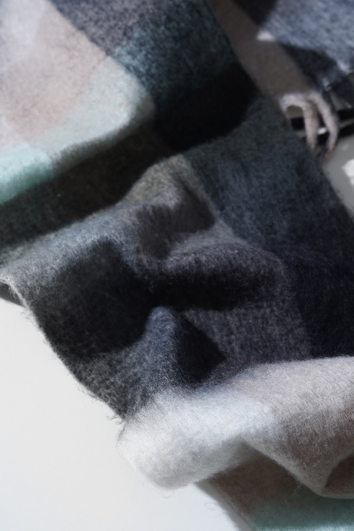 Design details: Chunky, multi-colored reversible scarf with a brushed texture and long fringes.