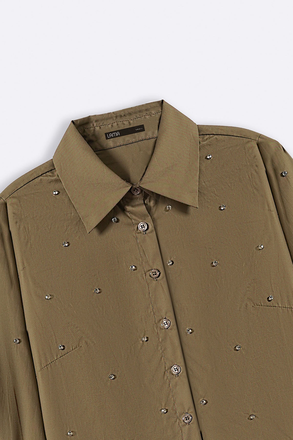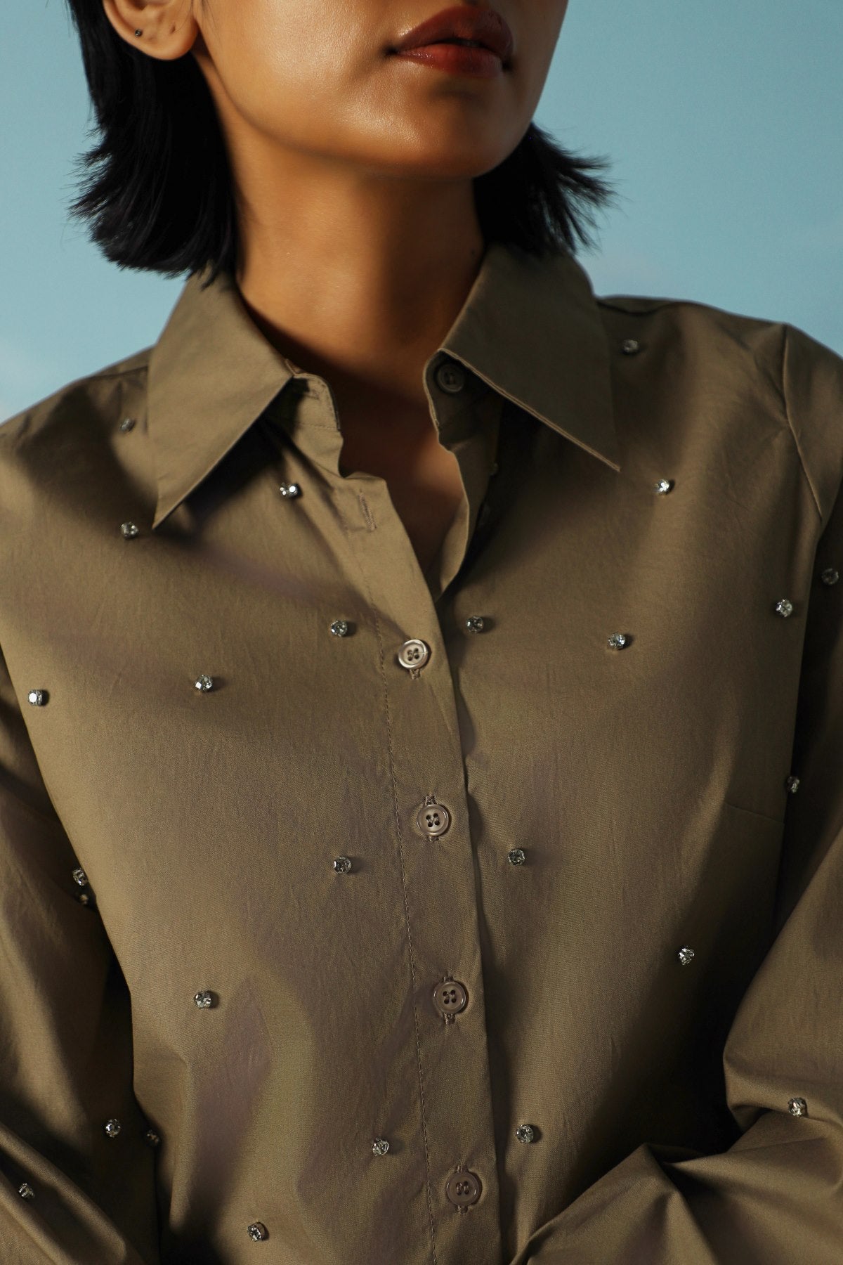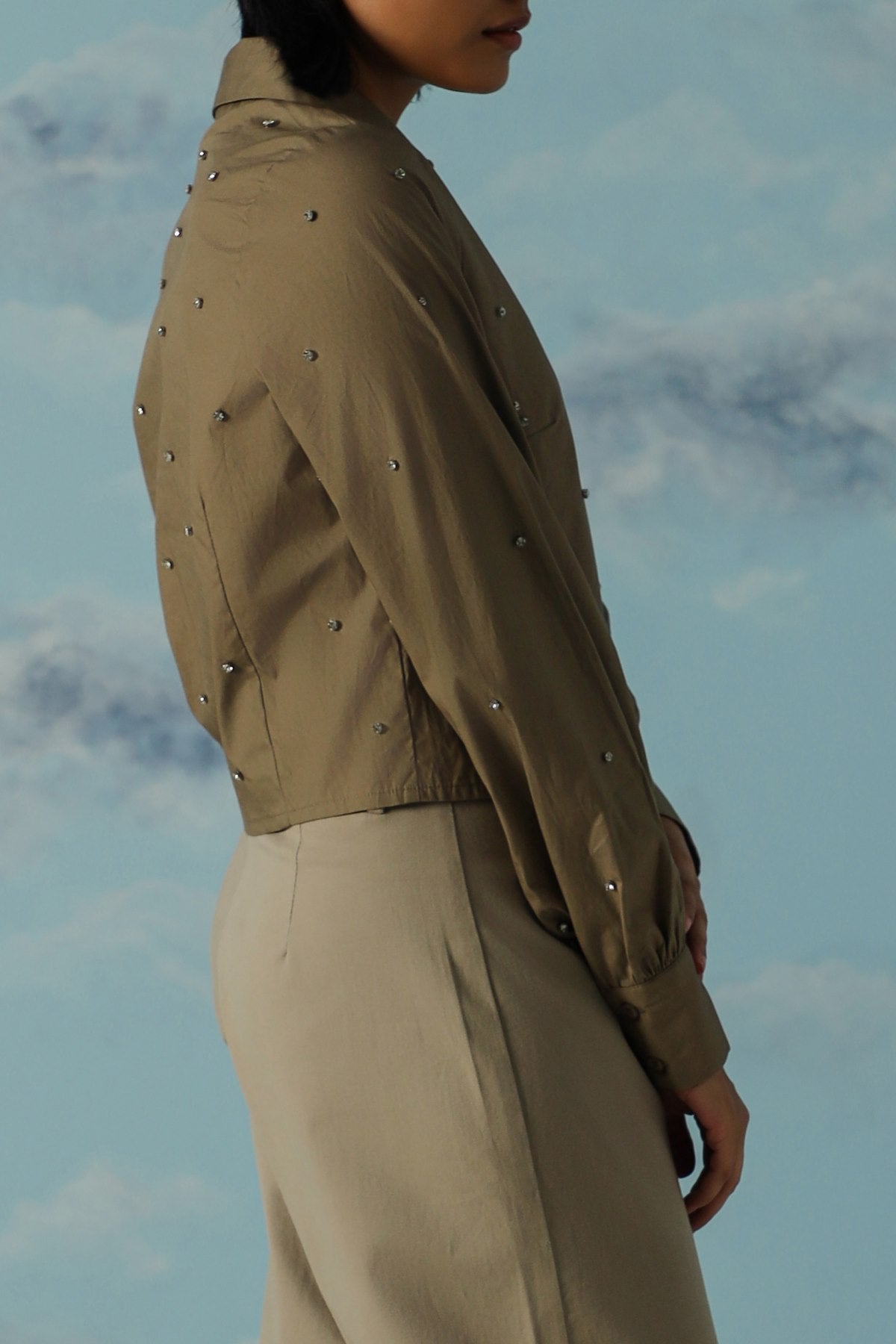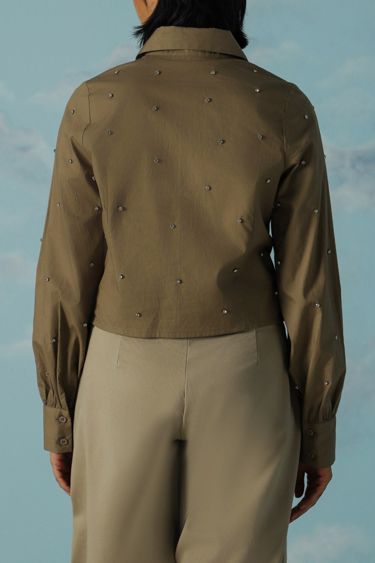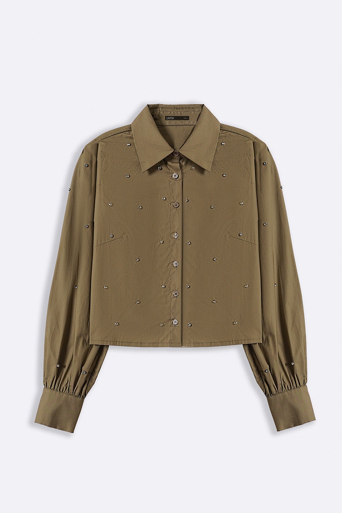 Design details: Cropped diamanté button down shirt with long sleeves and cuff detail.