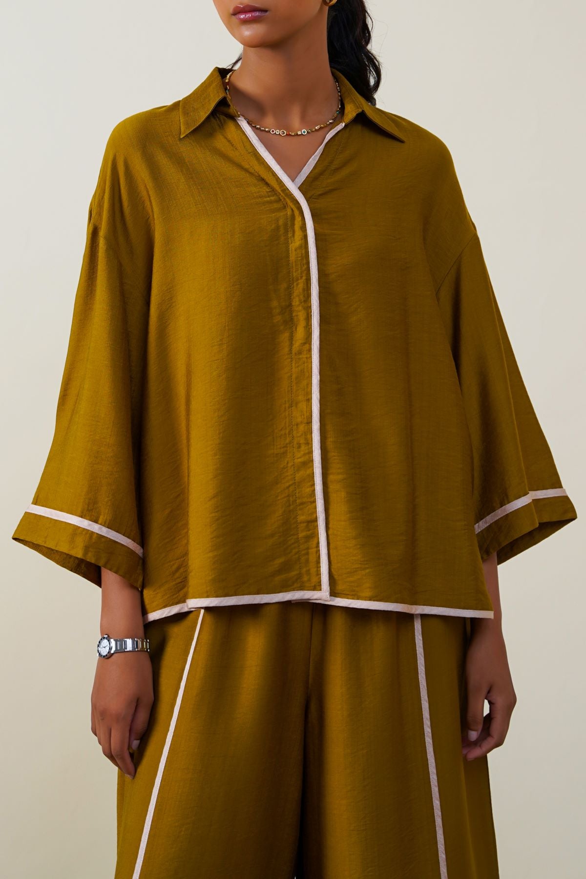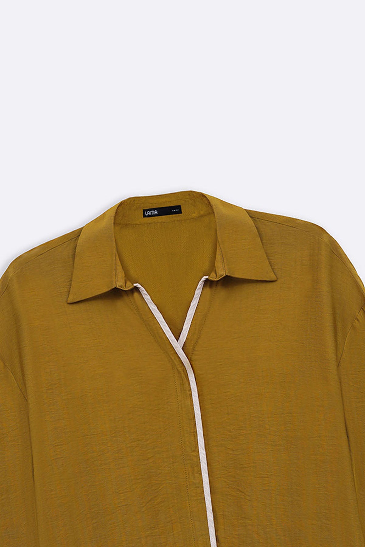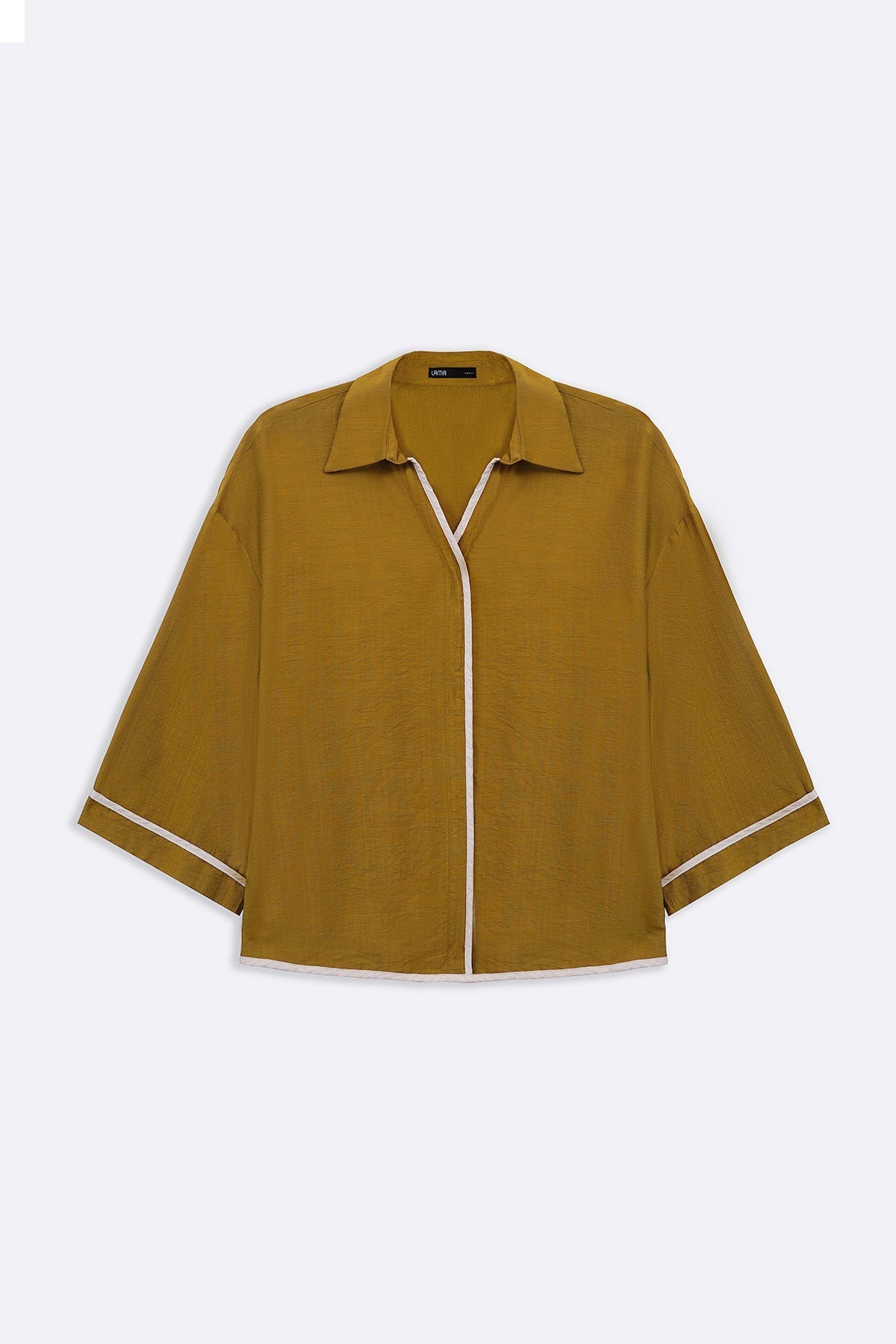 Design details: Skipper collar shirt with concealed button closure, three quarter sleeves and contrast piping detail on placket, sleeves and hem.