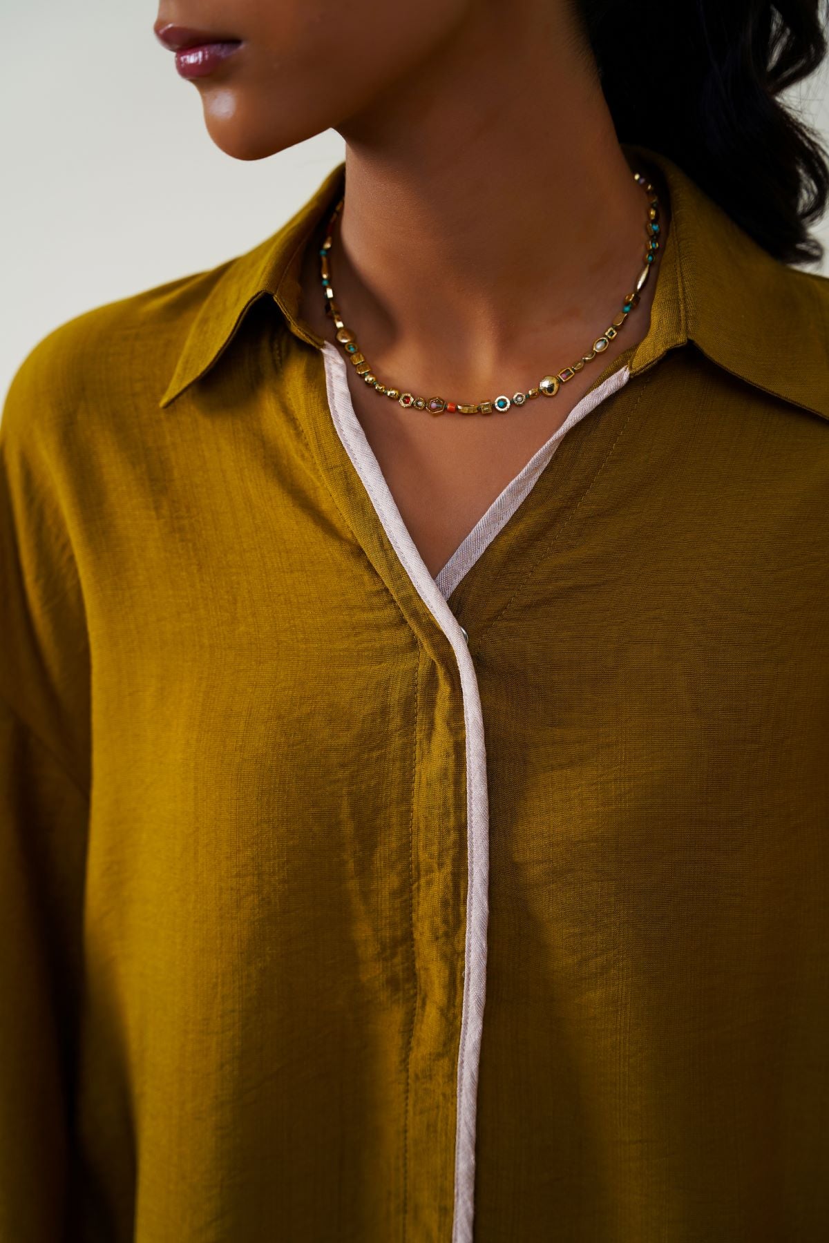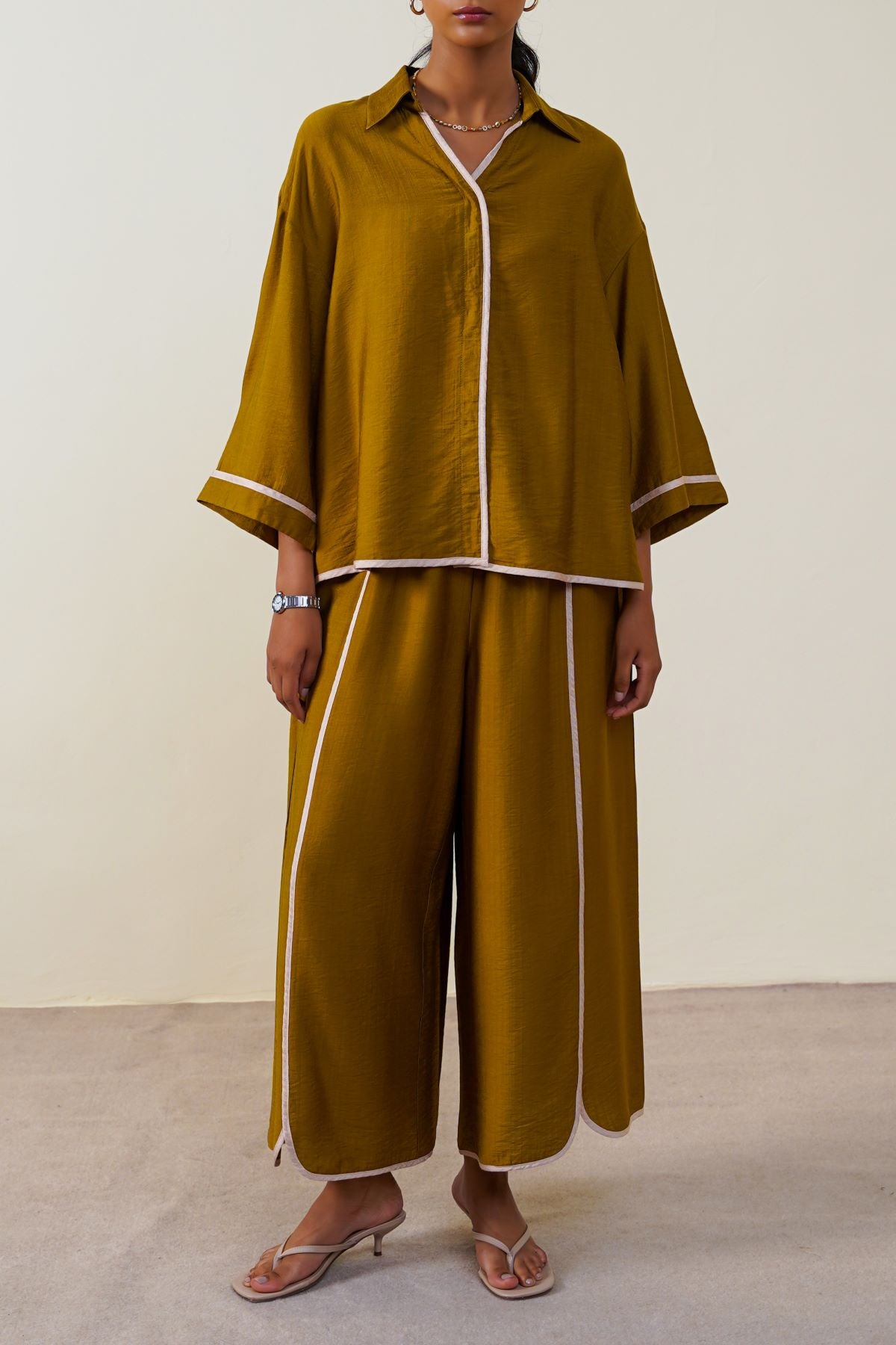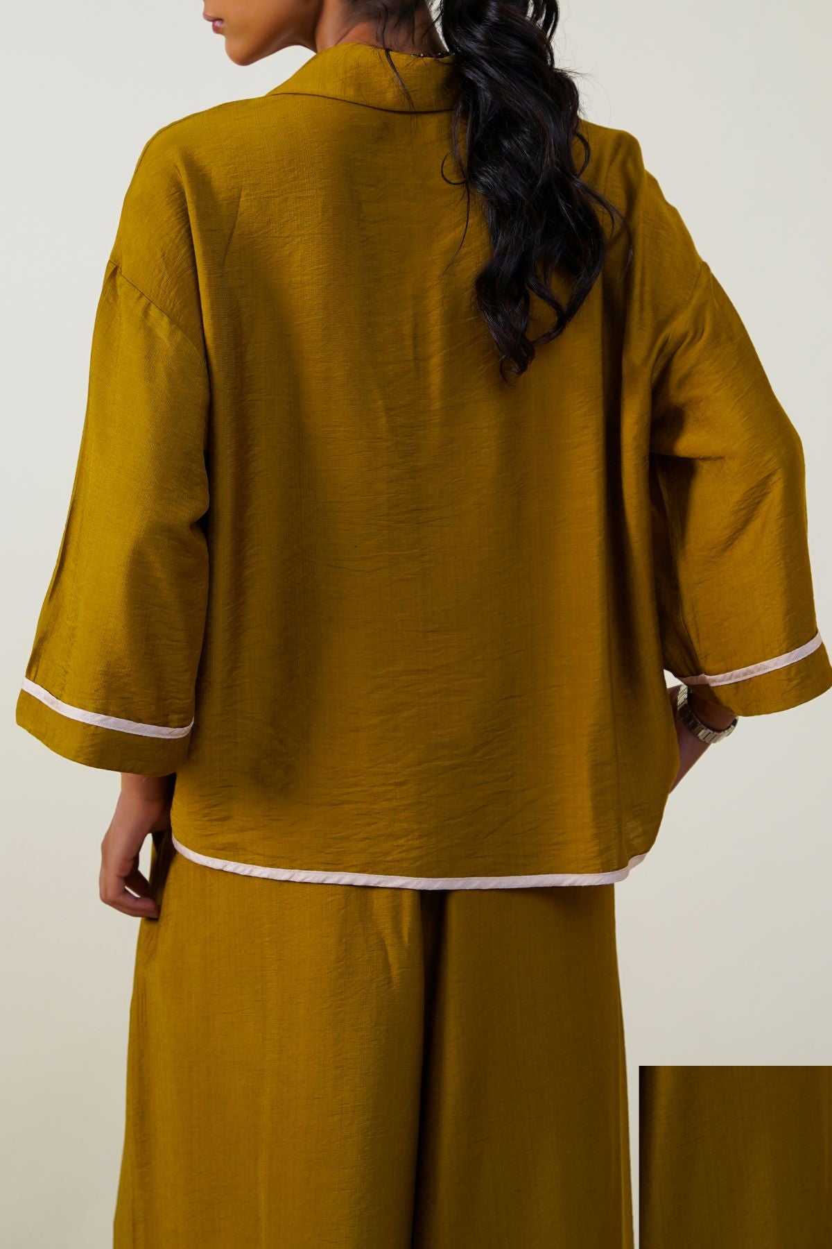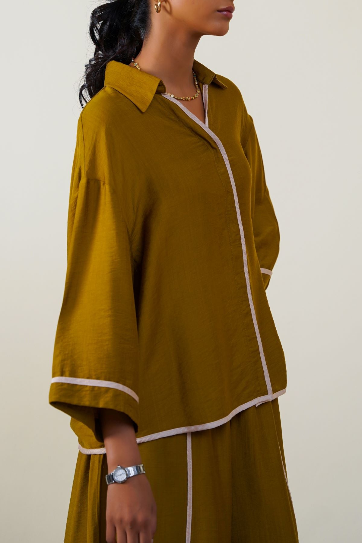 Design details: Skipper collar shirt with concealed button closure, three quarter sleeves and contrast piping detail on placket, sleeves and hem.