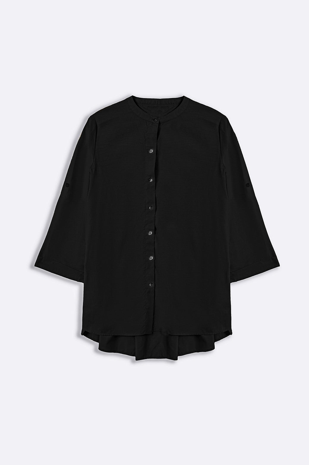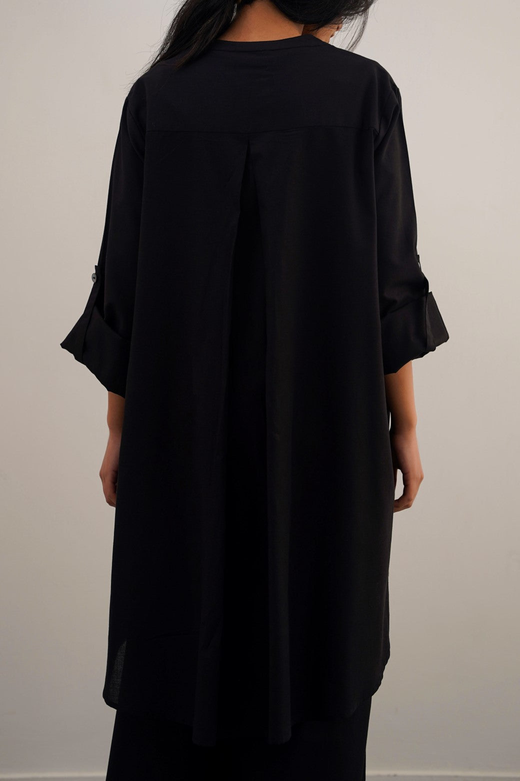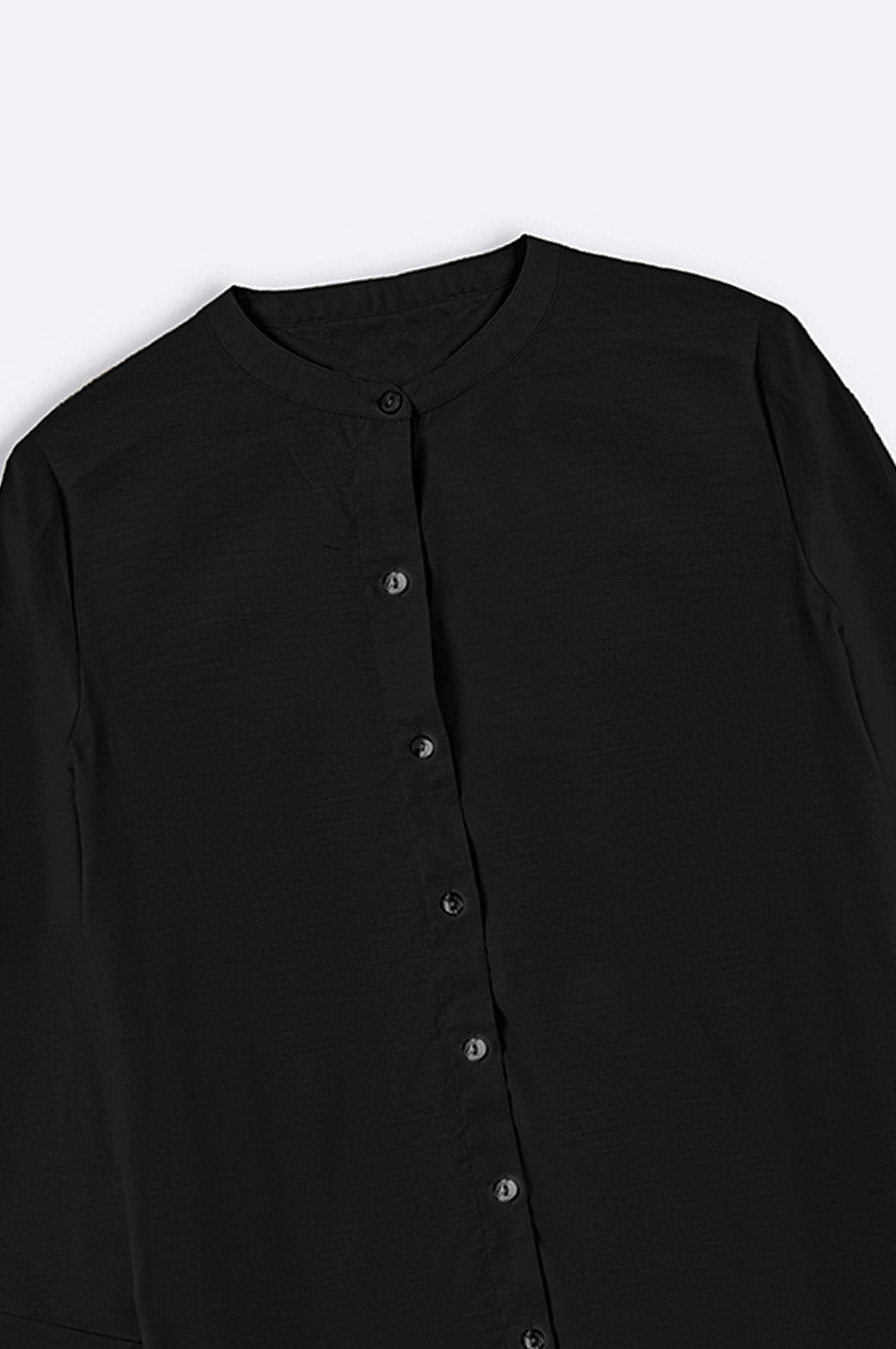 Design details: Band collar tunic featuring a longer back with pleat detail, side pockets and roll up sleeves along with front pearl button closure.