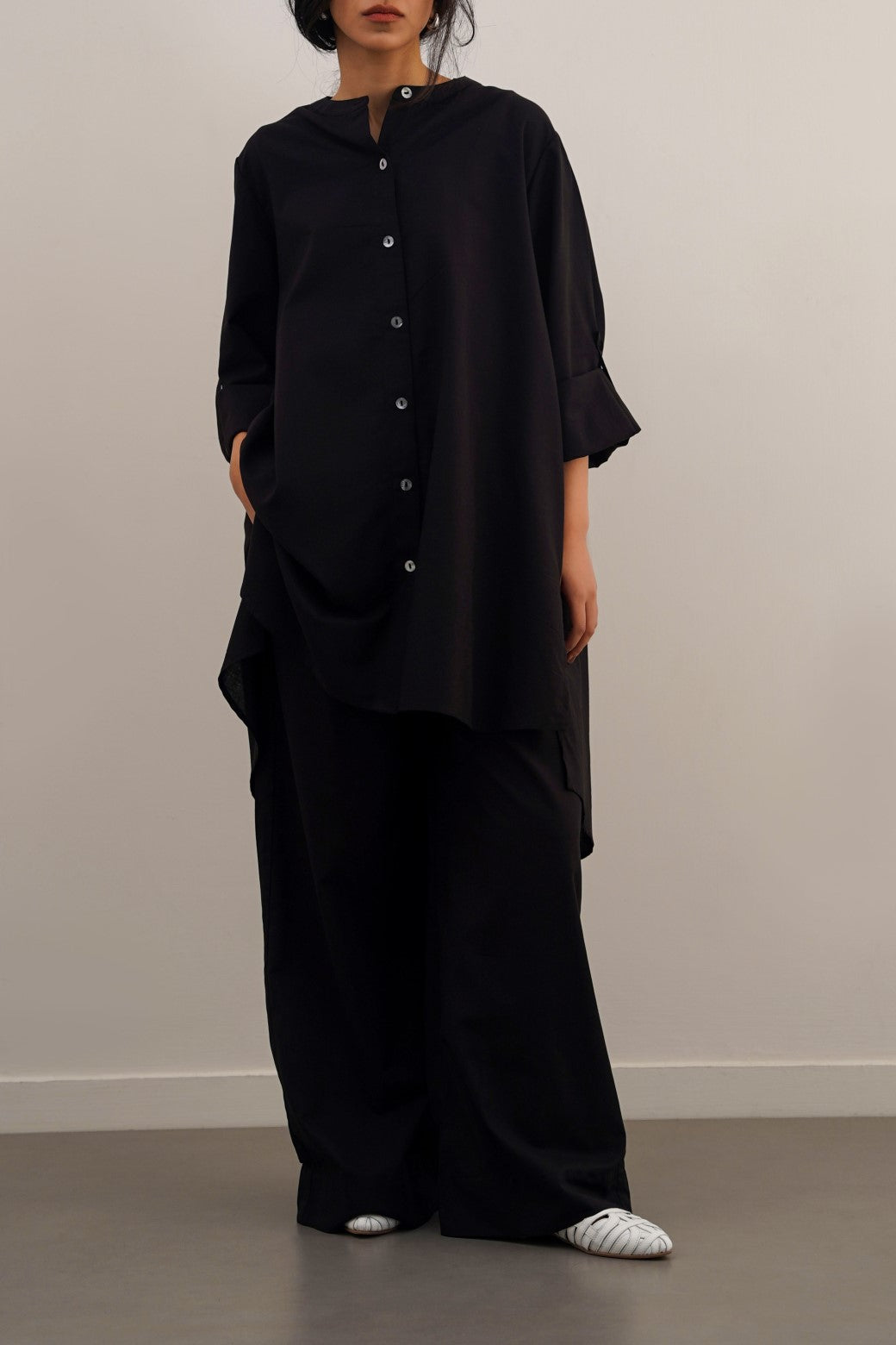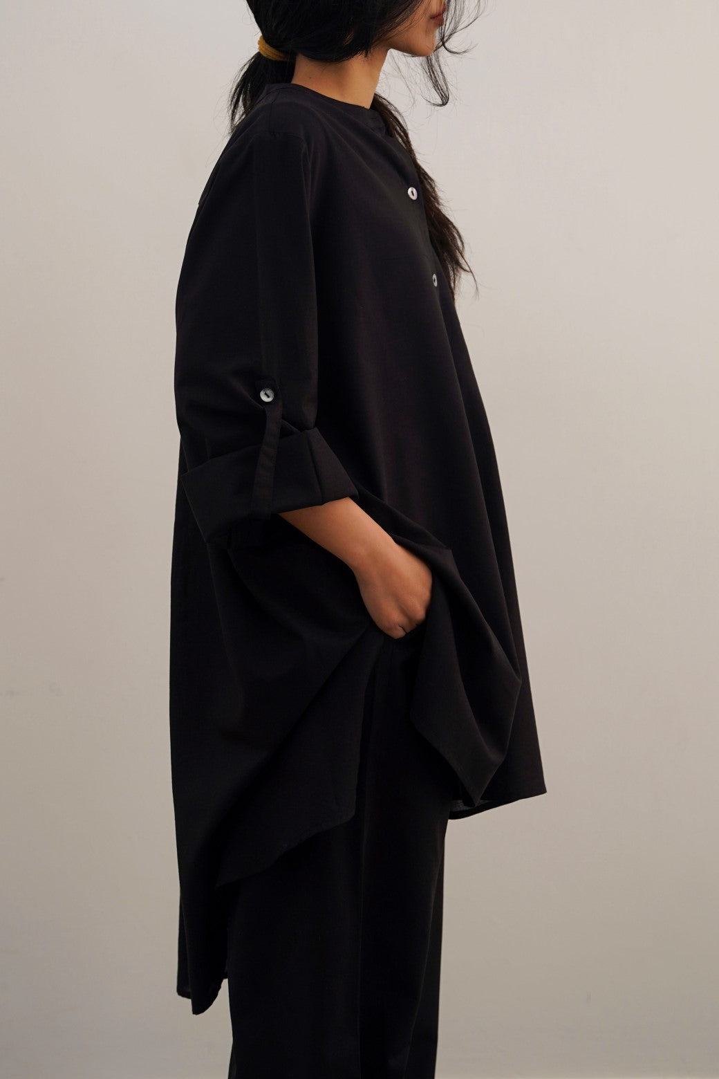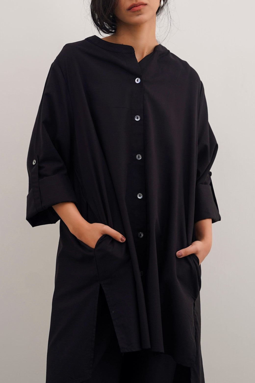 Design details: Band collar tunic featuring a longer back with pleat detail, side pockets and roll up sleeves along with front pearl button closure.