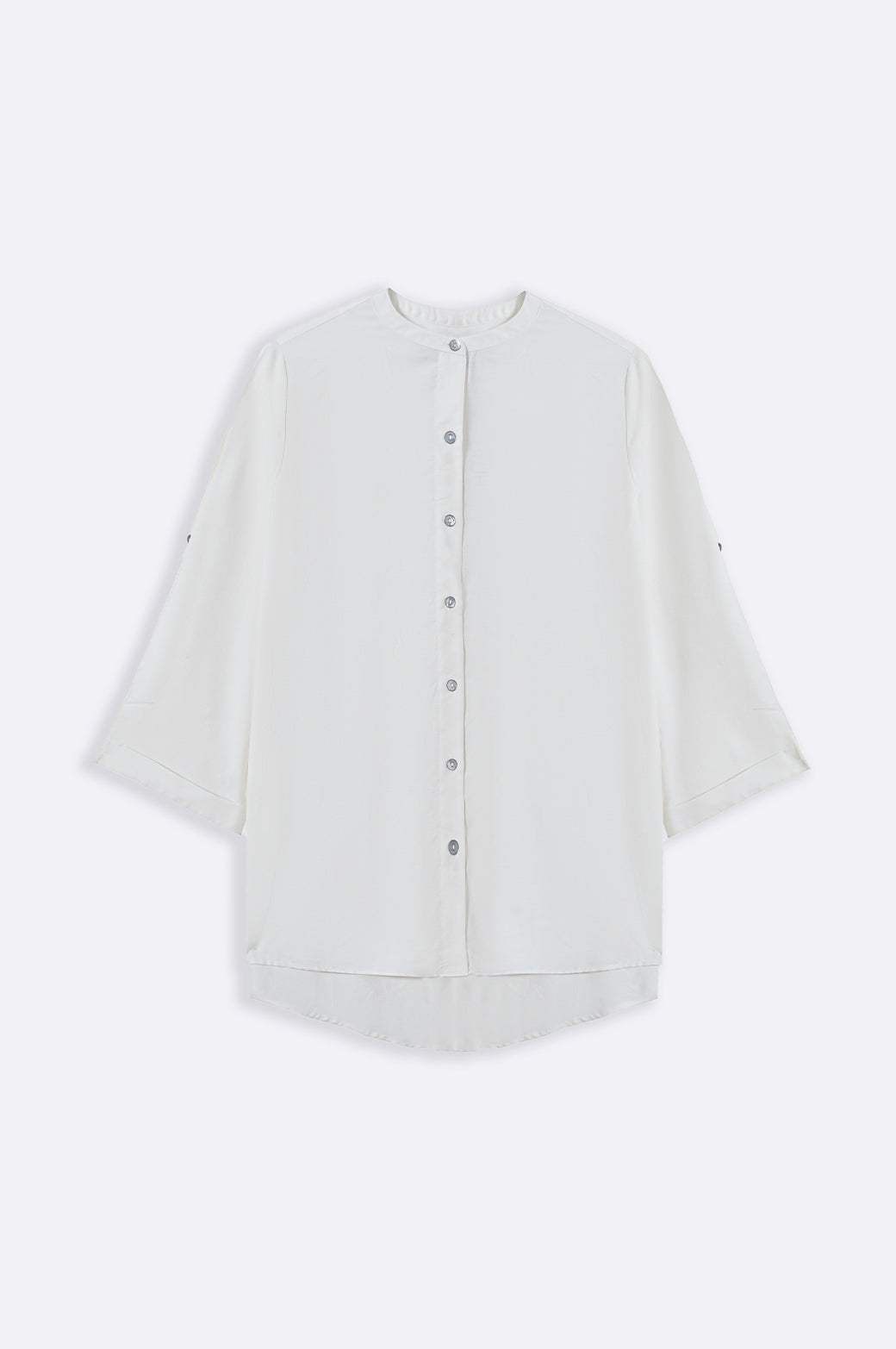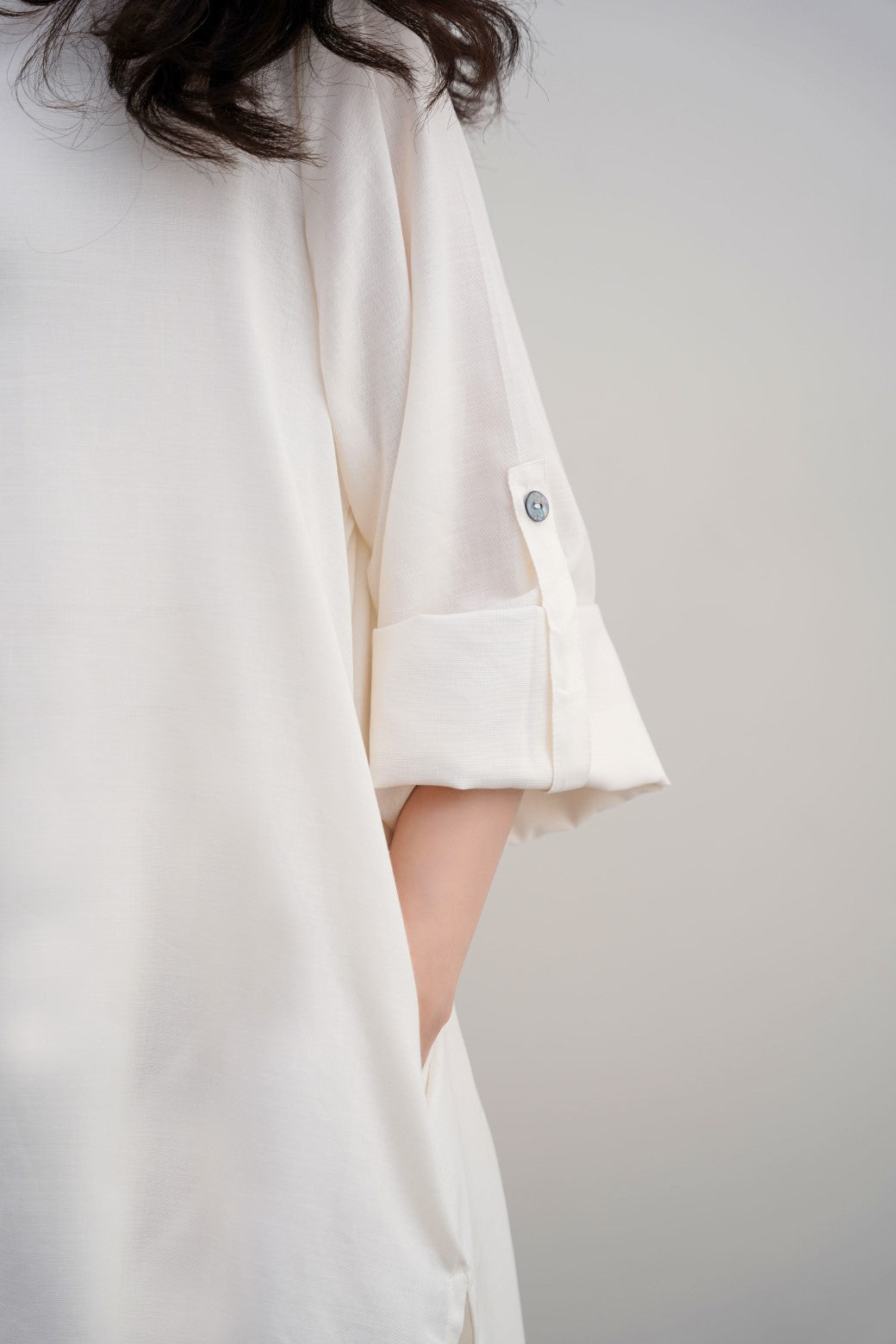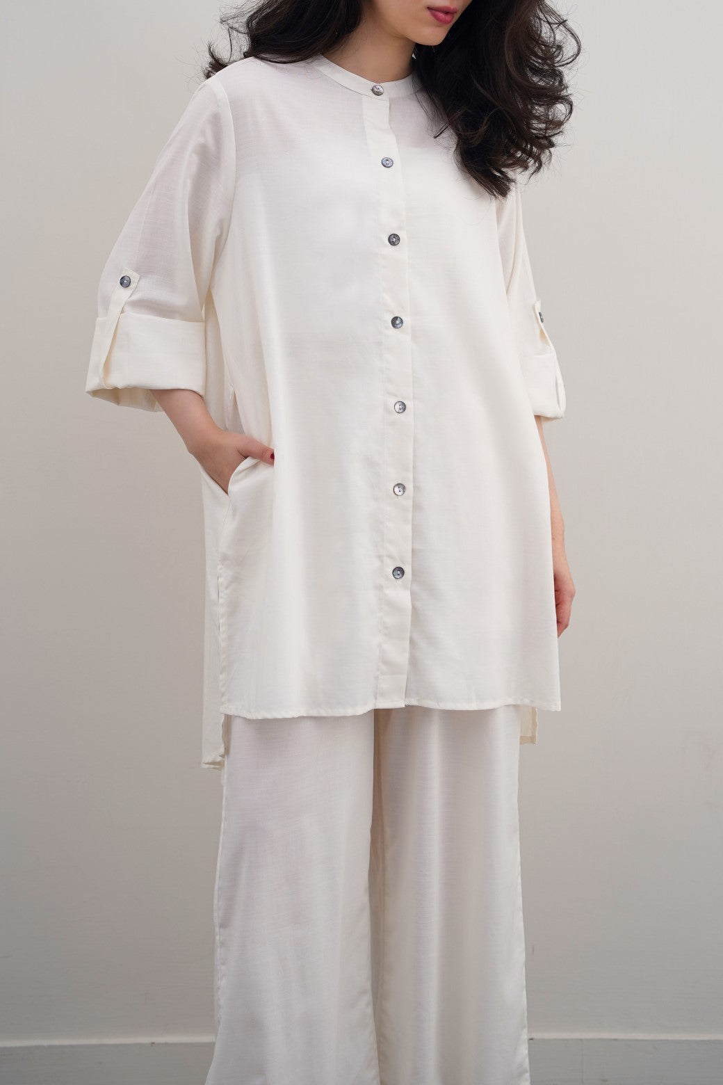 Design details: Band collar tunic featuring a longer back with pleat detail, side pockets and roll up sleeves along with front pearl button closure.