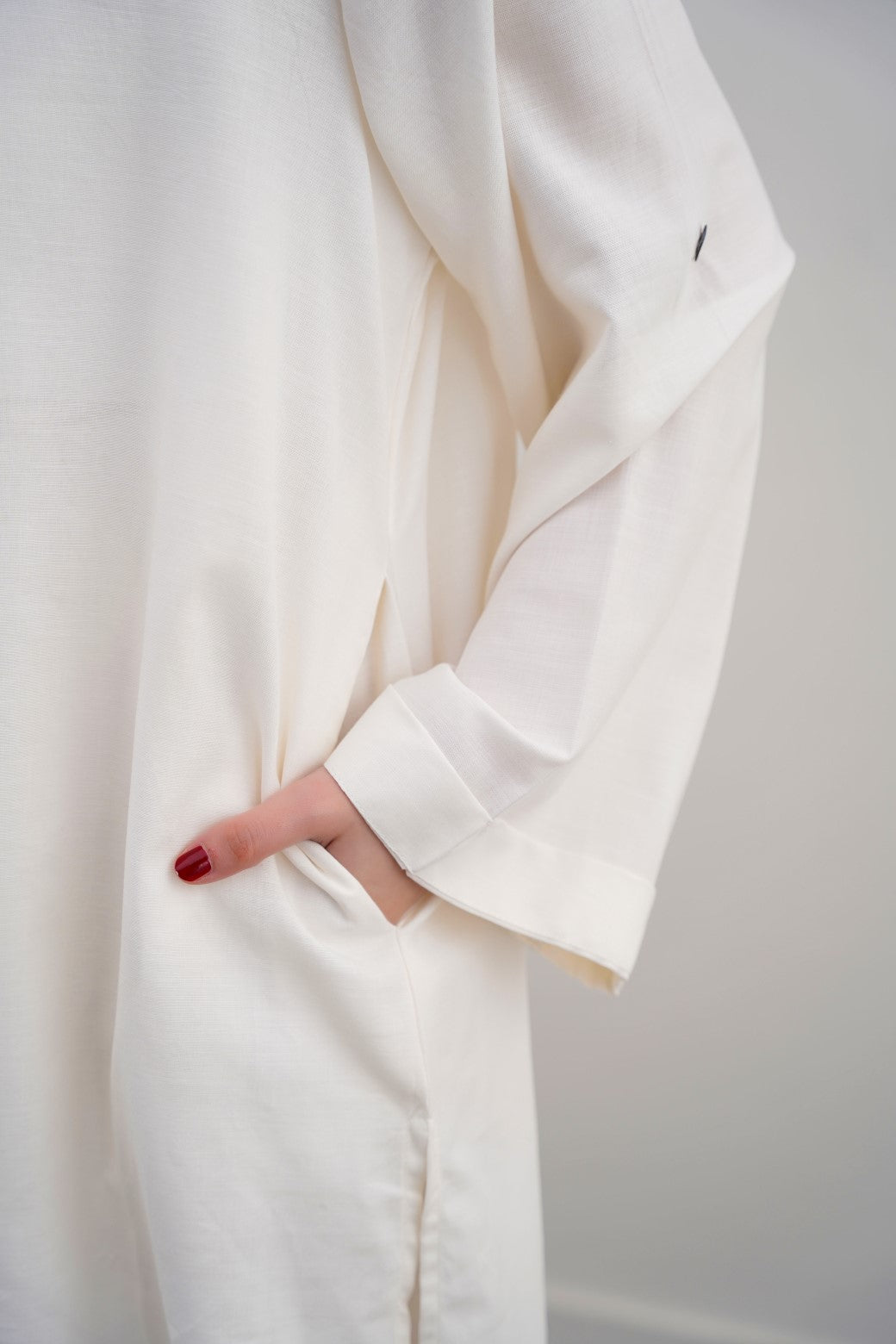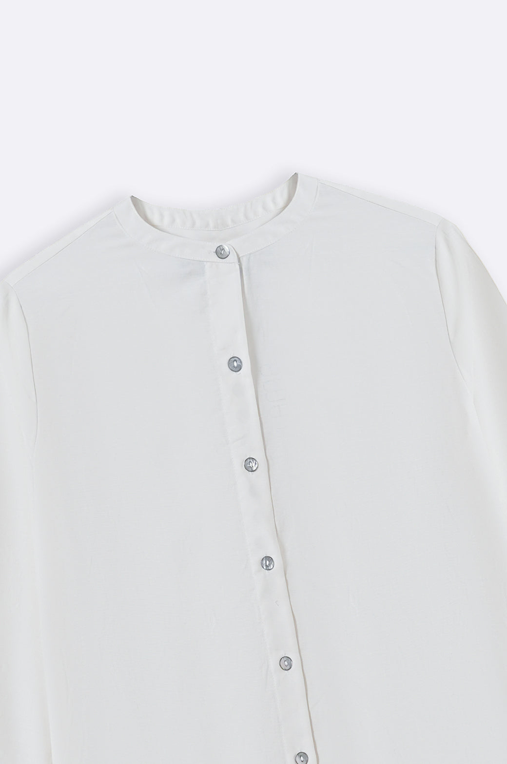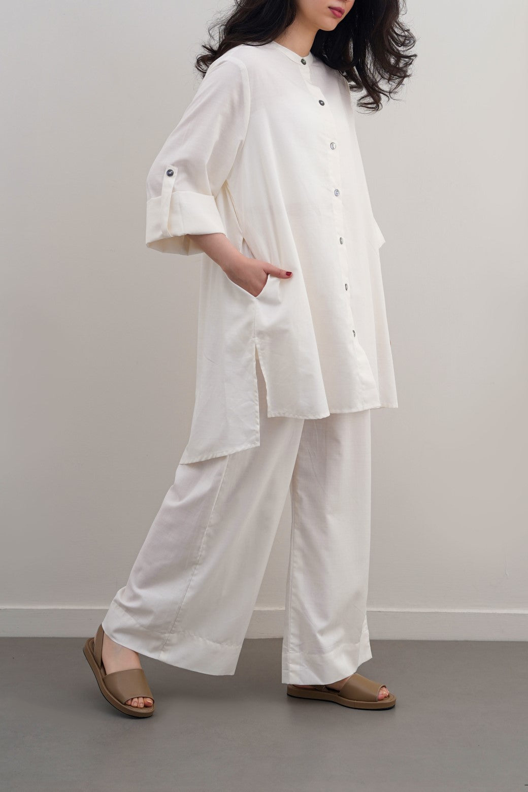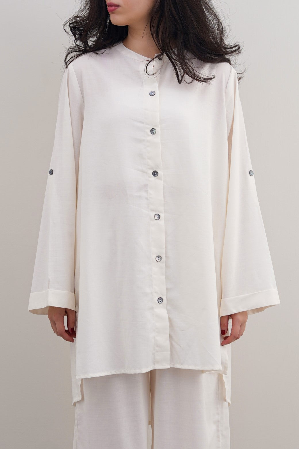 Design details: Band collar tunic featuring a longer back with pleat detail, side pockets and roll up sleeves along with front pearl button closure.