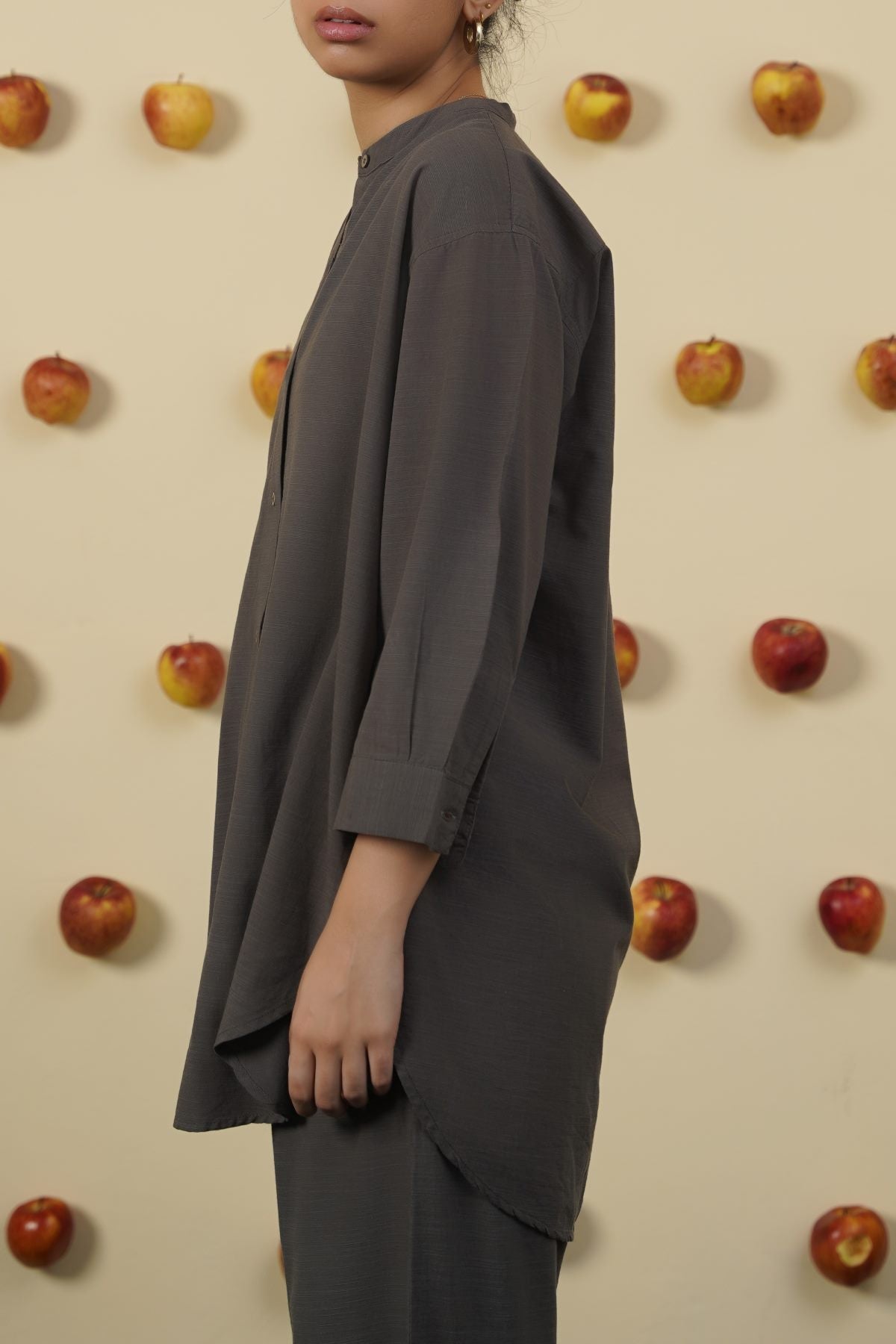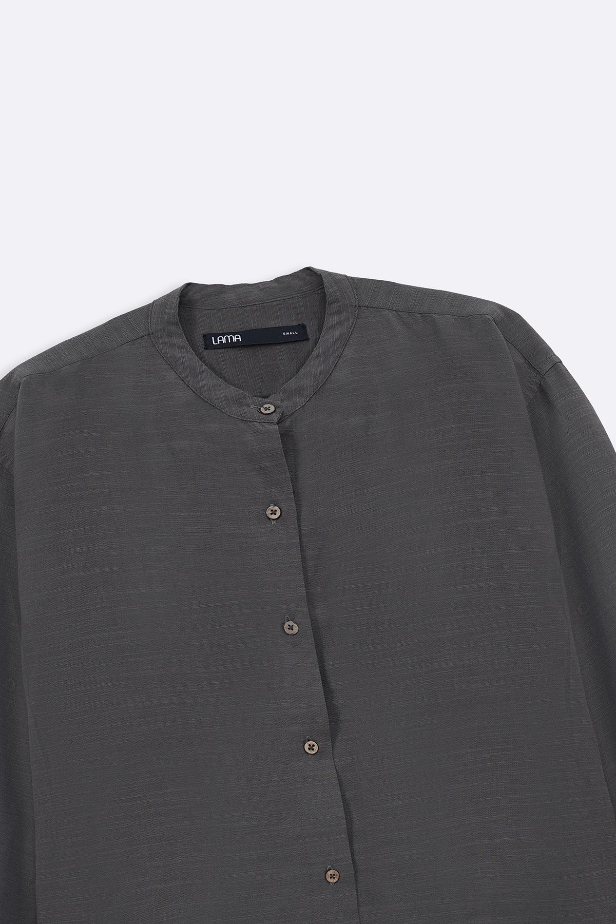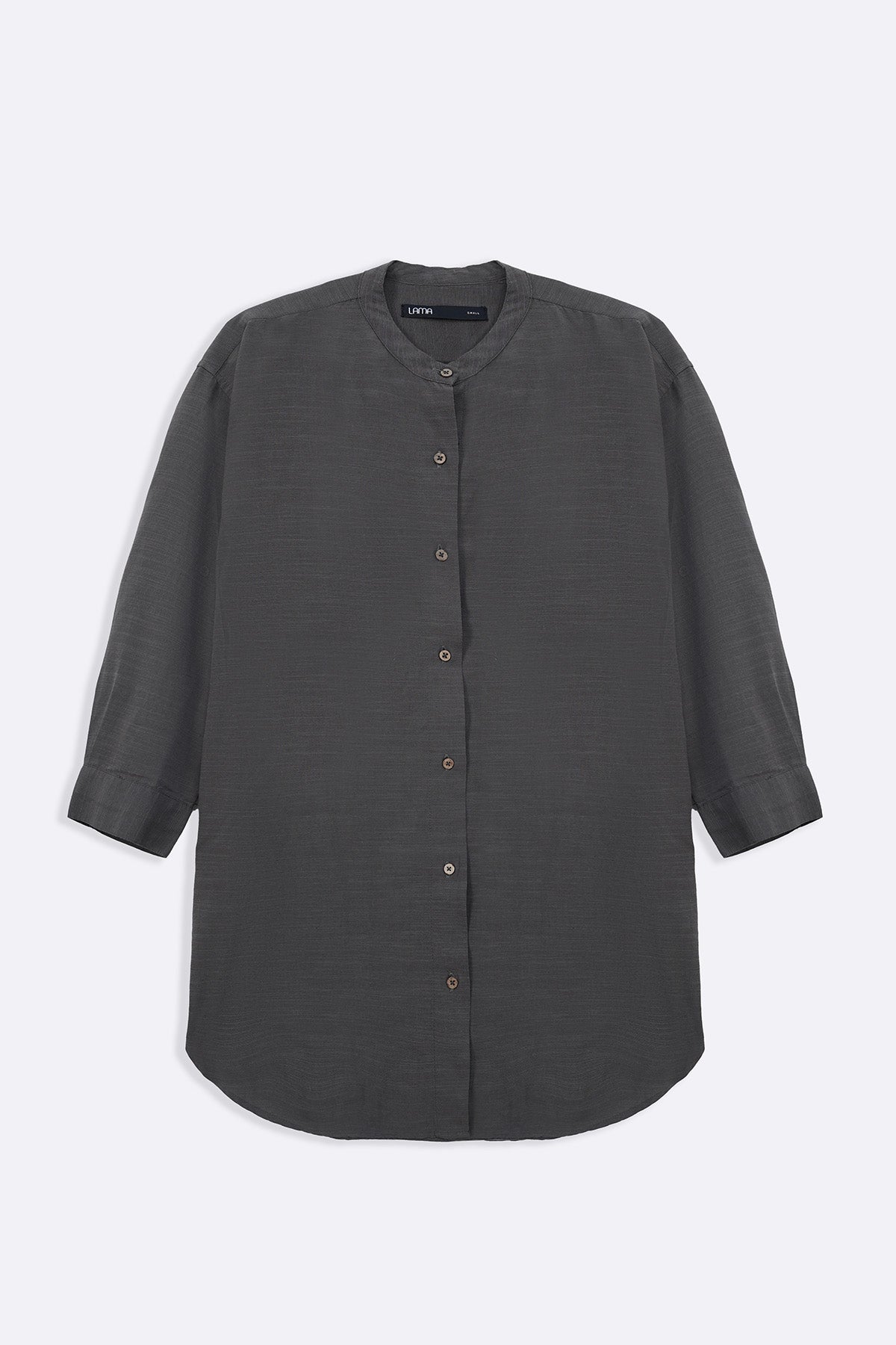 Design details: Band collar shirt with round hem, three quarter sleeves and wooden button front closure and cuff detail
