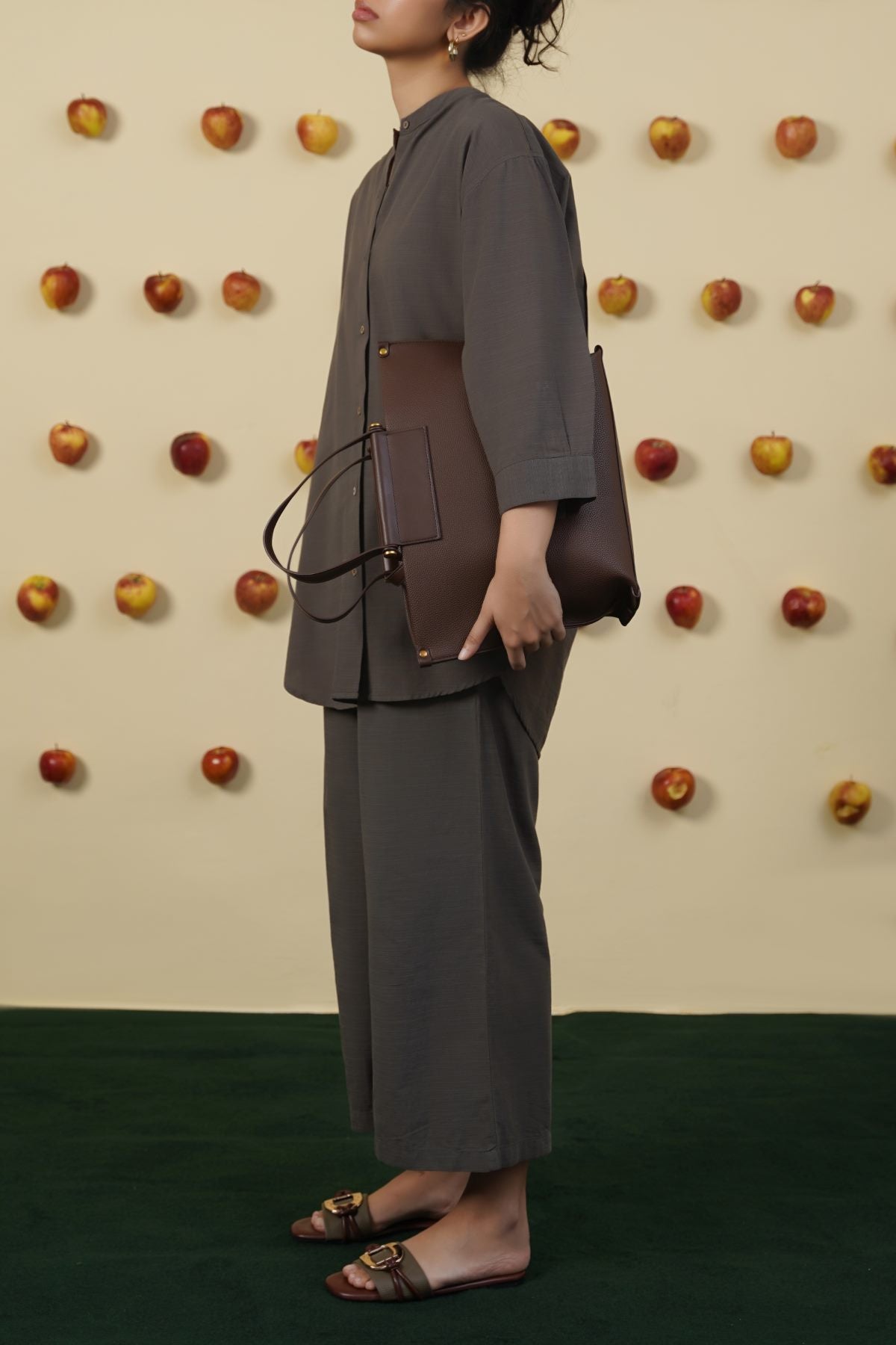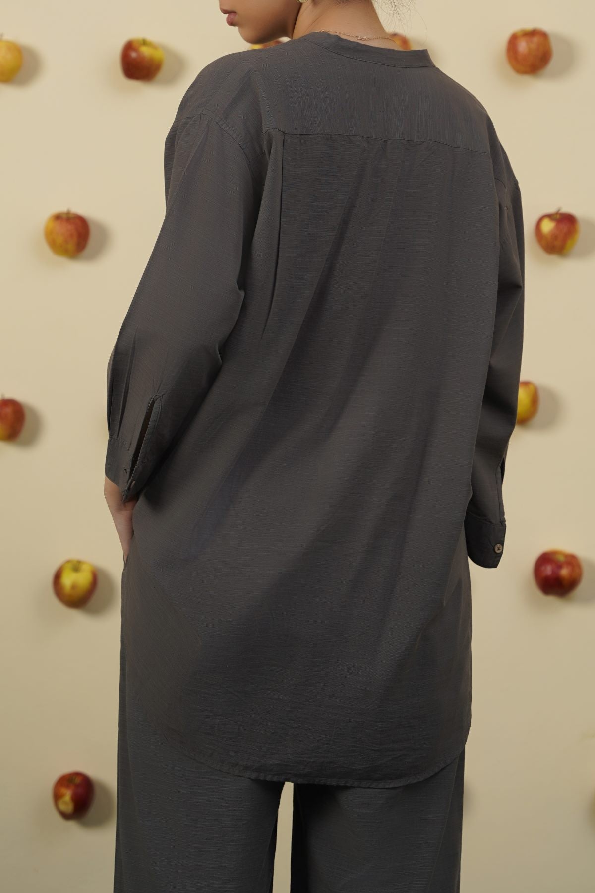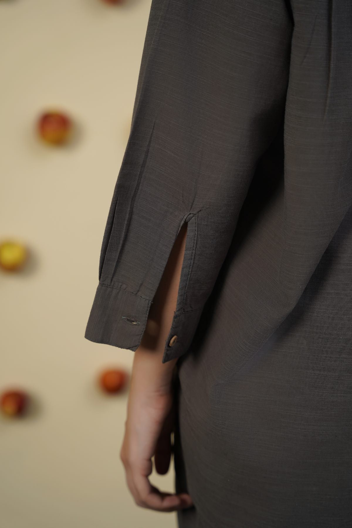 Design details: Band collar shirt with round hem, three quarter sleeves and wooden button front closure and cuff detail