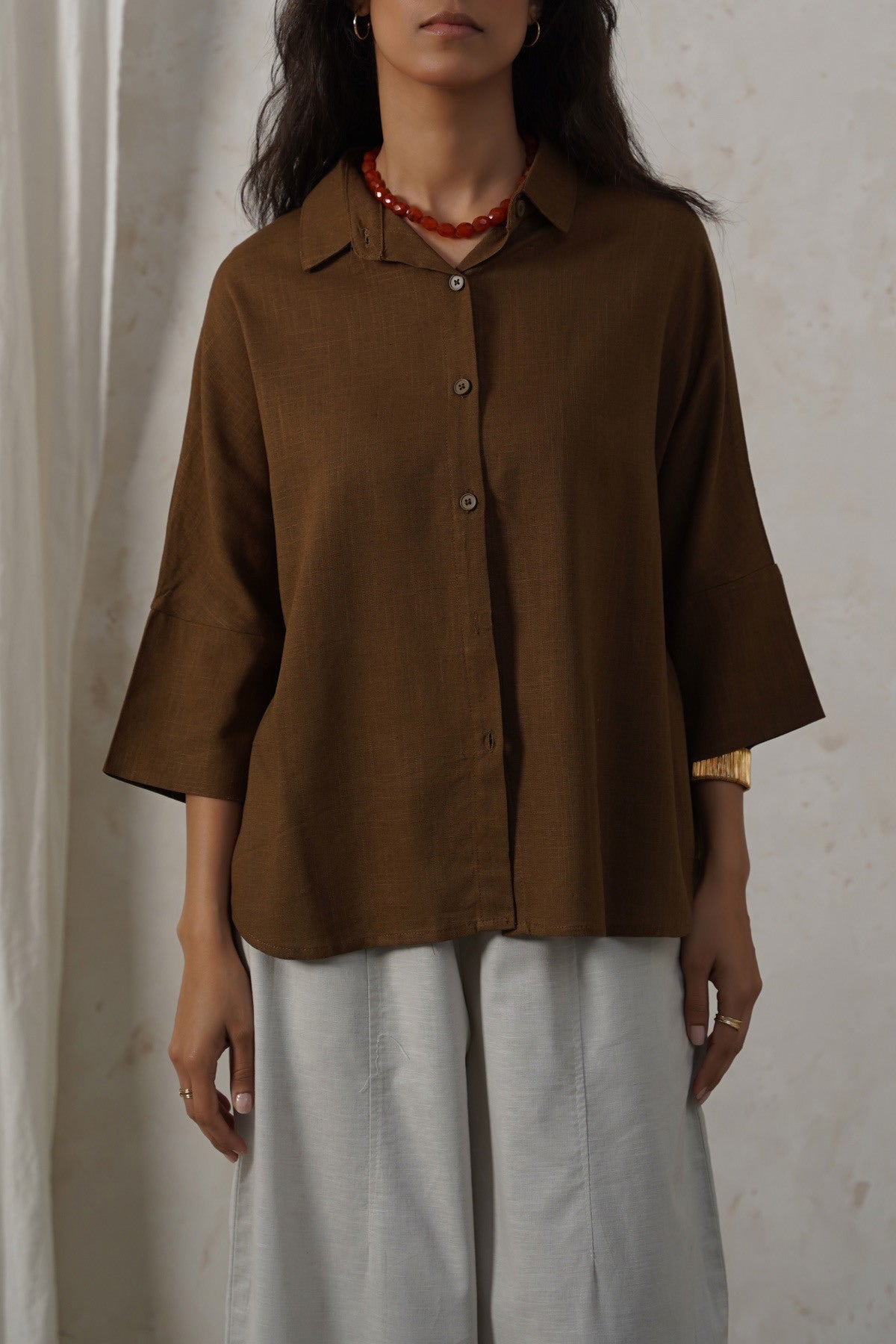Design details: Button down shirt with collar, three quarter sleeves, and back box pleat. Batwing cutline without an armhole.