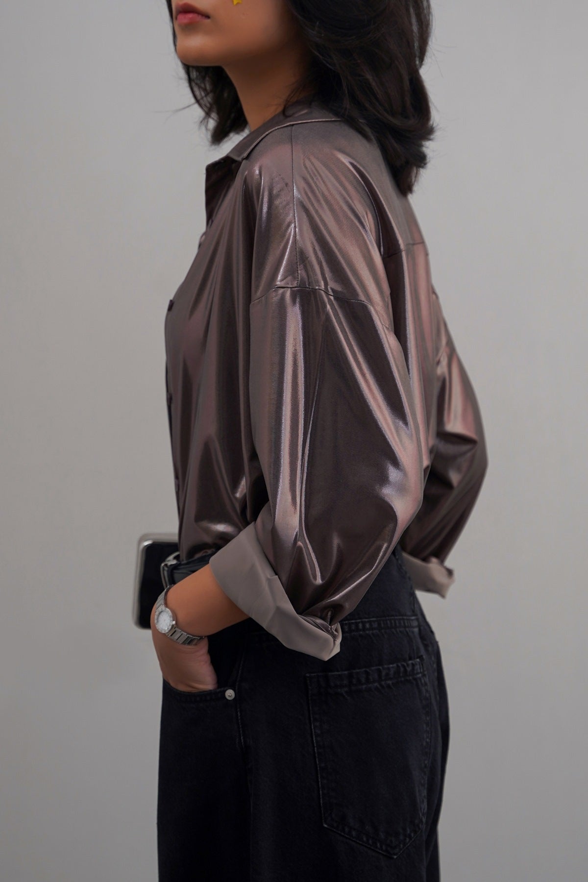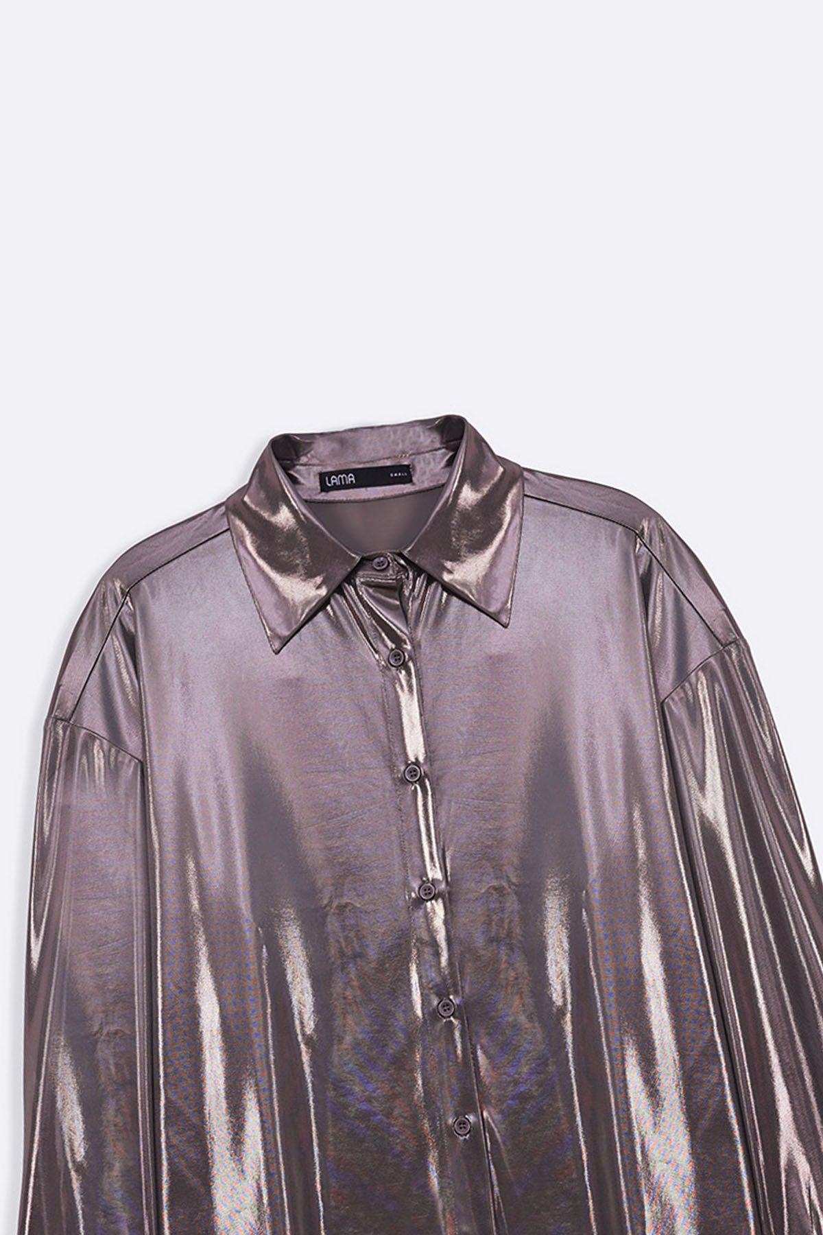 Design details: Button-down shirt in a metallic finish, designed with long sleeves and a curved hem.