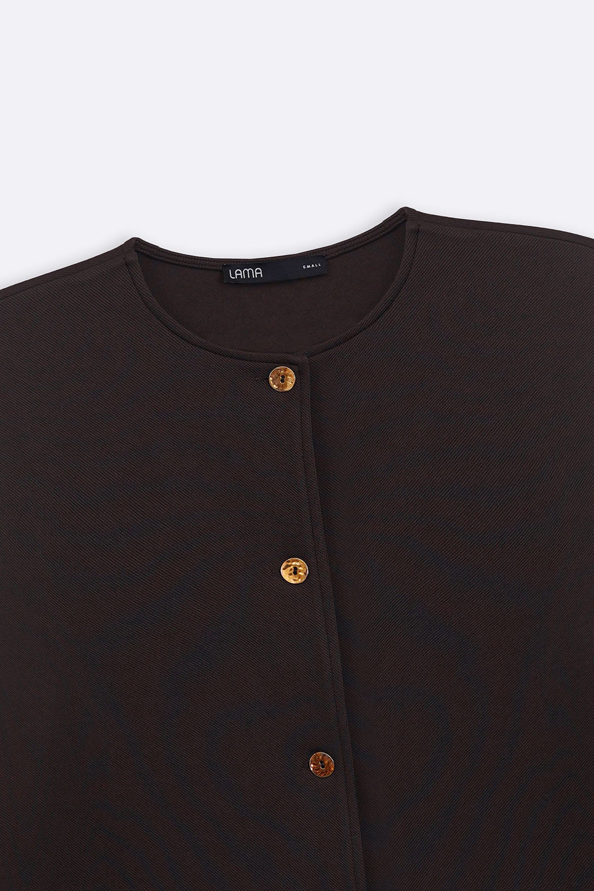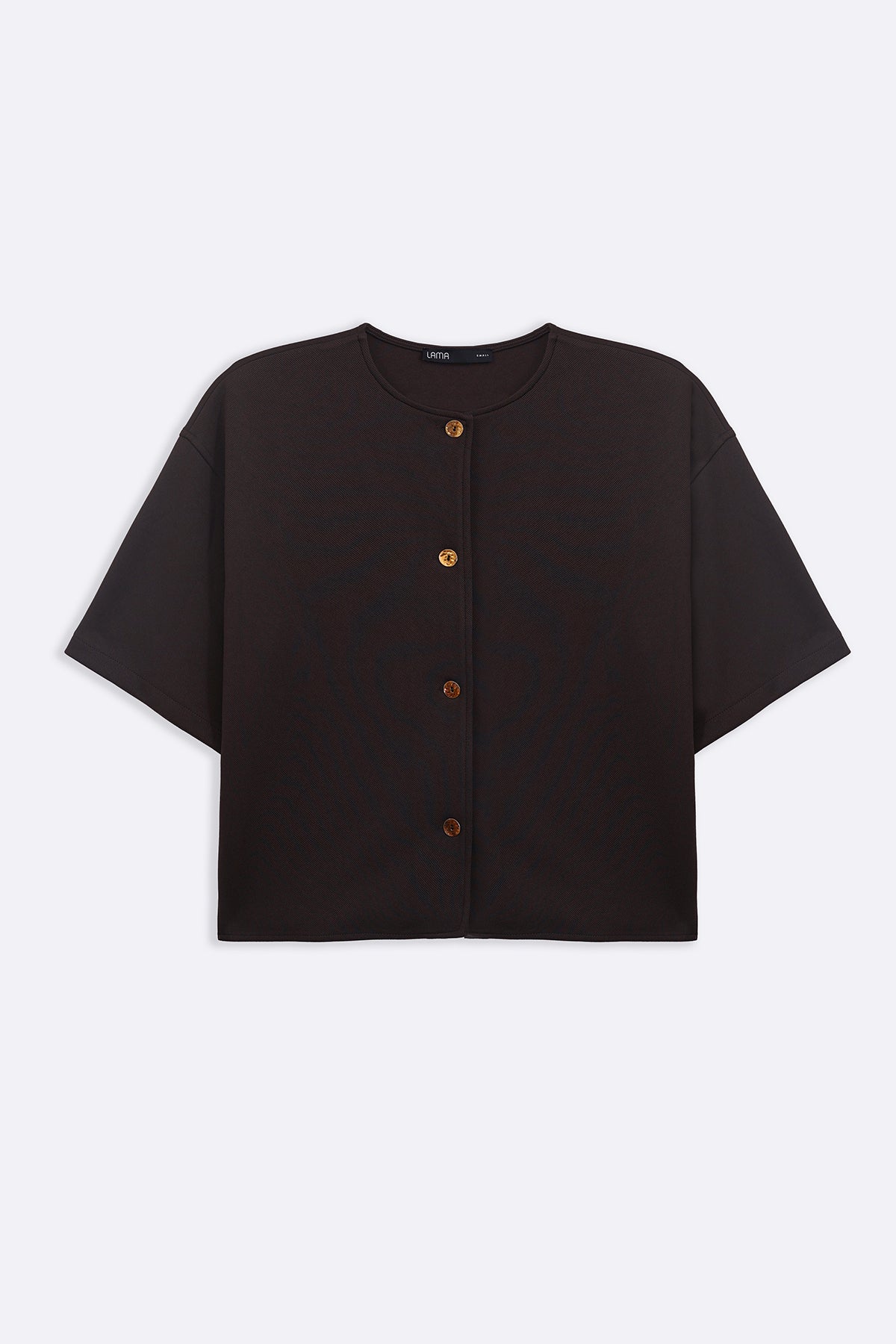 Design details: Soft, tailored look in a button-down textured blouse with short sleeves, side slits and gold buttons.