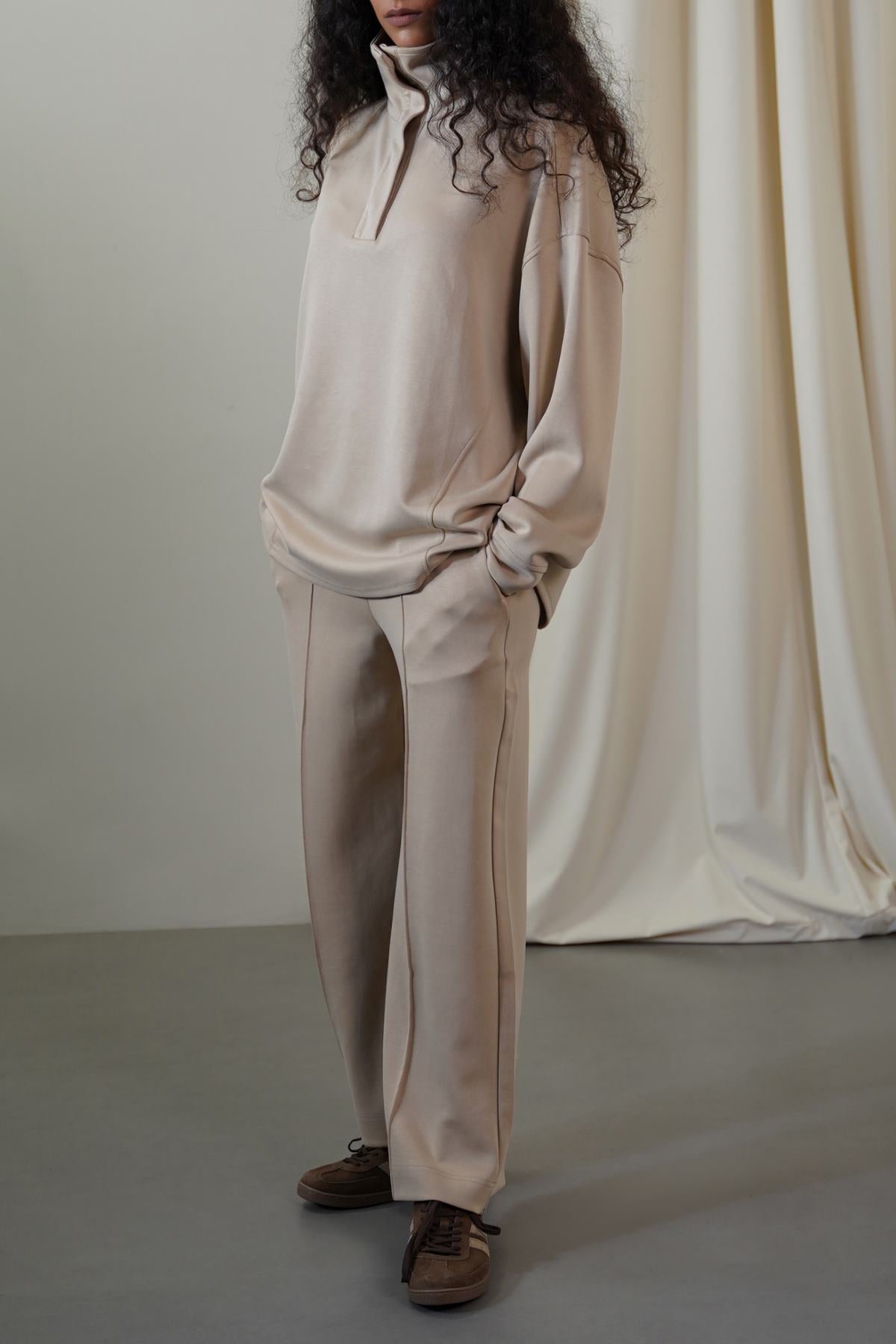 Design details: Elasticated waistband with front pleats and side pockets.