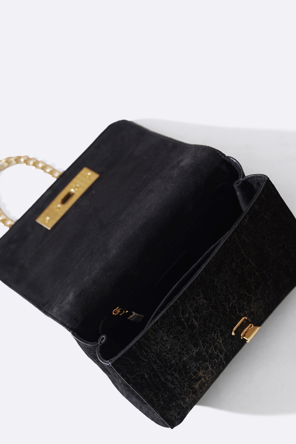 Genuine suede leather shoulder bag with multiple foil printing detail. It comes with gold chains, inside slip pocket and turn lock closure.
