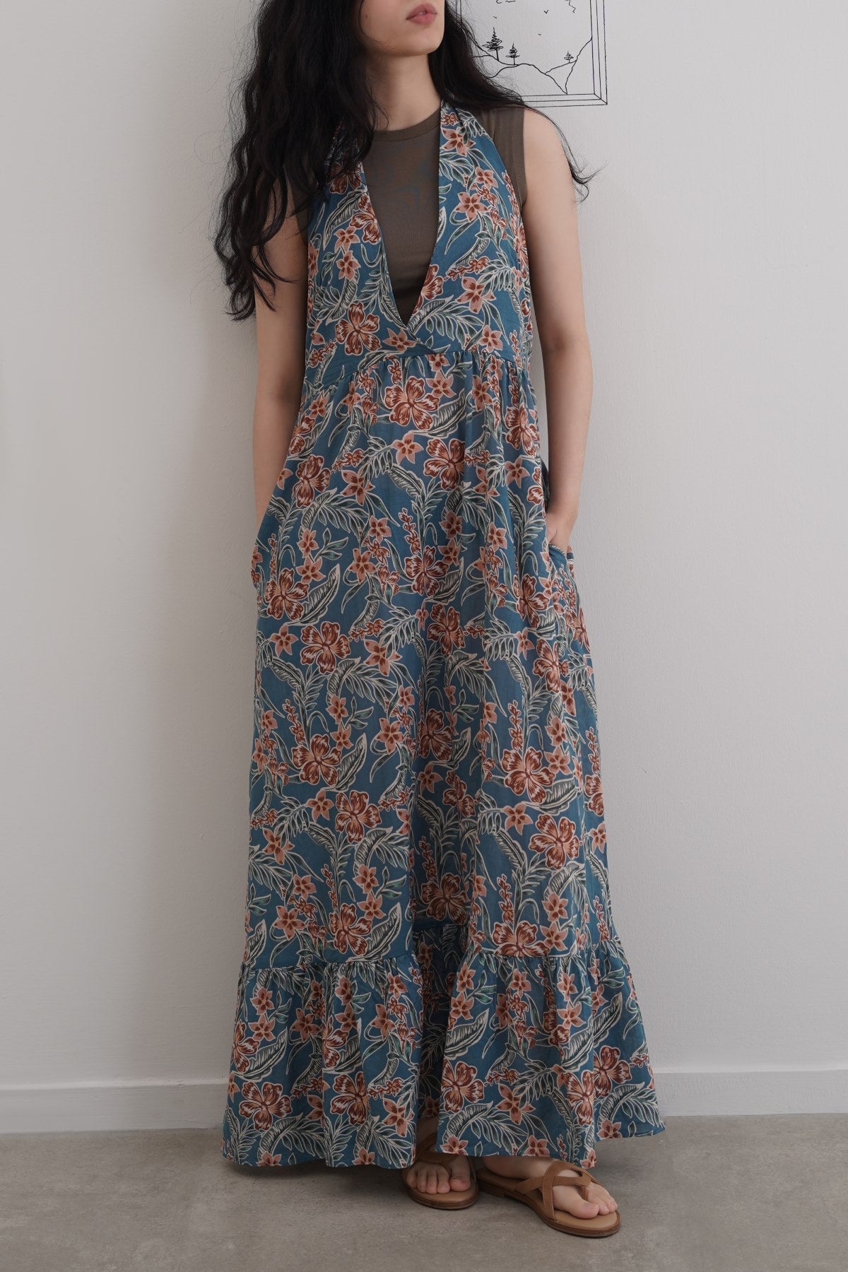 Design details: Long printed dress featuring an adjustable halter neckline with a tie-bow detail, smocked back, and side pockets.