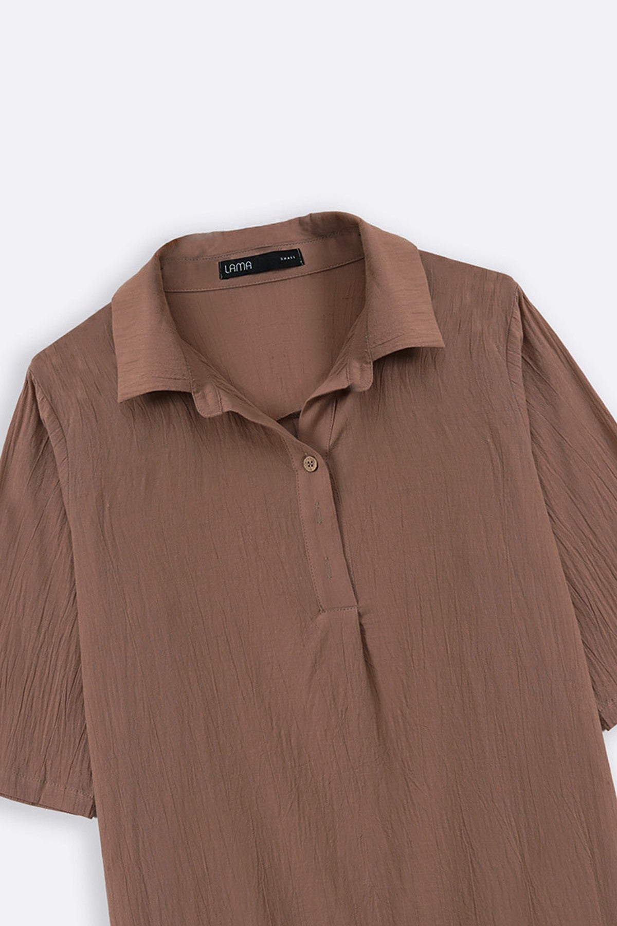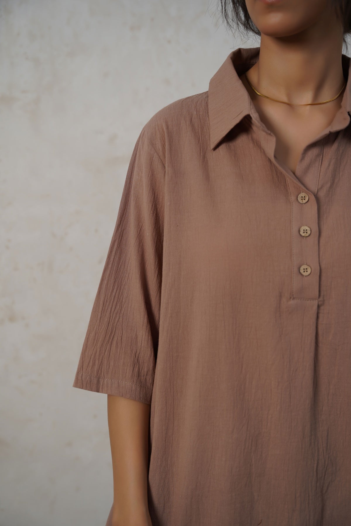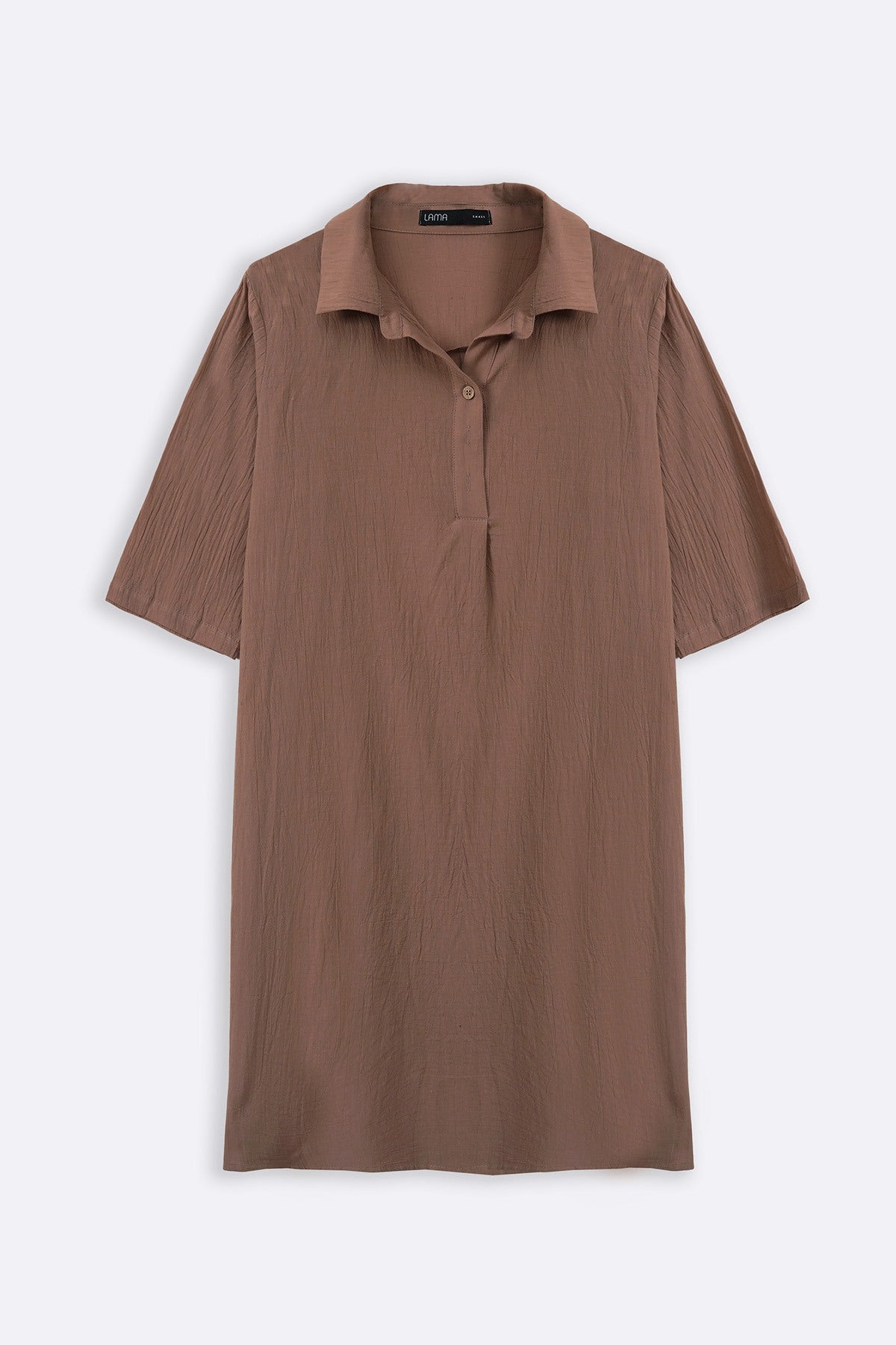 Design details: Lightweight, collared tunic with short sleeves, side slits and back box pleat. Front button closure.