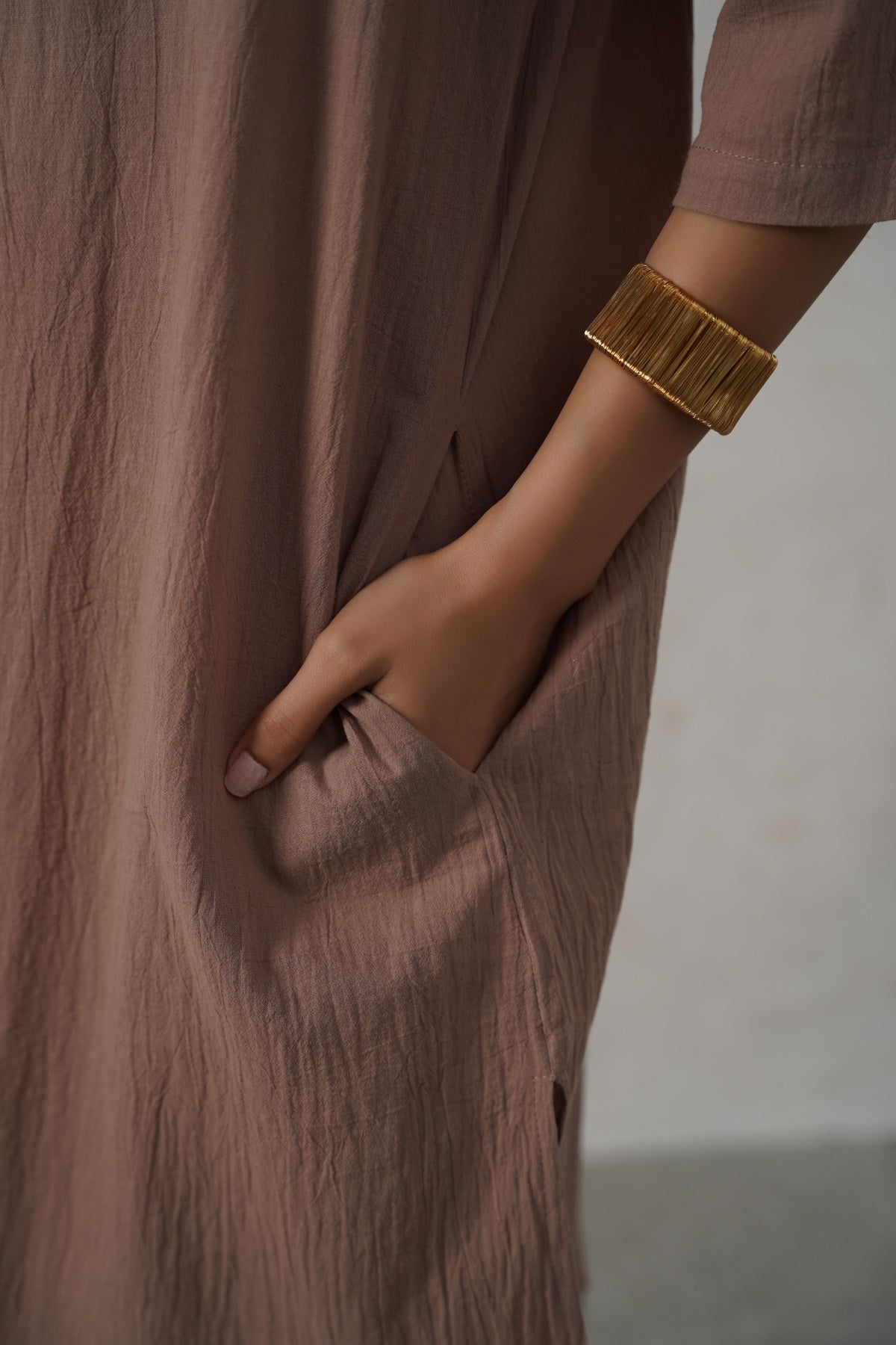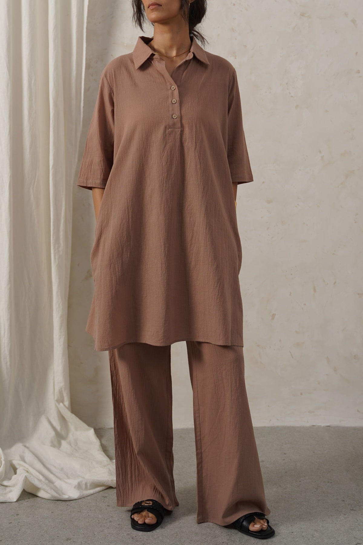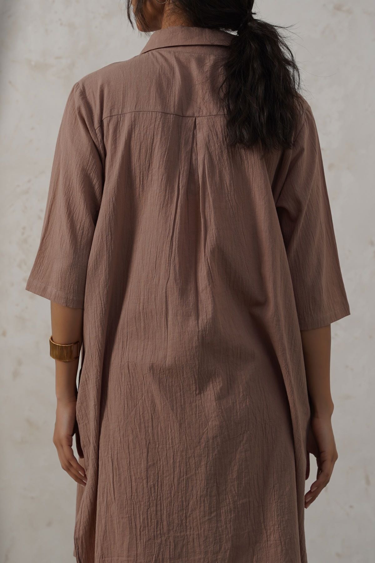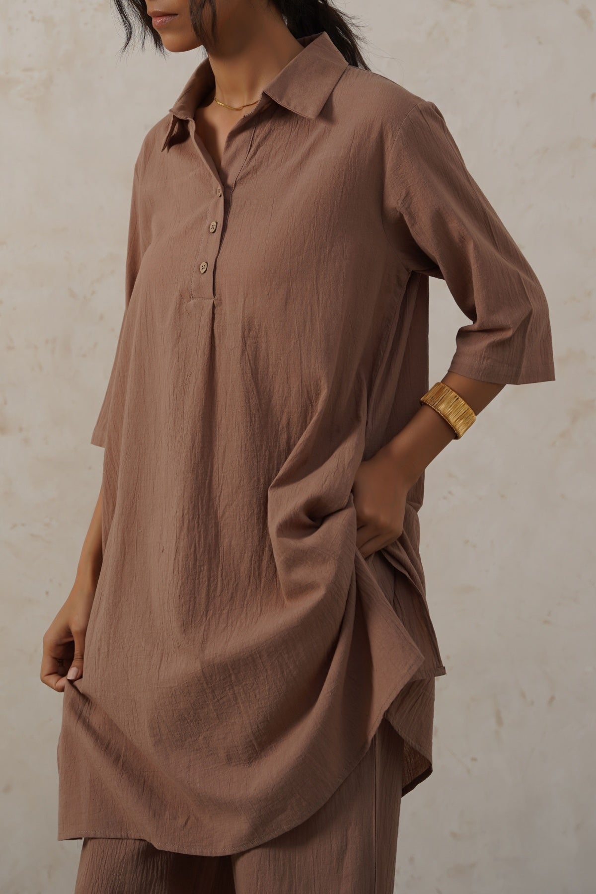 Design details: Lightweight, collared tunic with short sleeves, side slits and back box pleat. Front button closure.